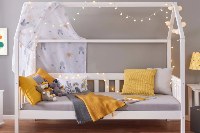 Najväčší hit za posledné obdobie? Predsa detská posteľ s baldachýnom v tvare domčeka. Konštrukcia z masívneho dreva s postranným rámom zaručí pevnosť a bezpečnosť pri spánku. Posteľ sa hodí pre deti rôzneho veku. V izbe s takouto posteľou nesmie chýbať svetelná reťaz, pekná tapeta či maľovka, dostatok úložných košov (s tematickým motívom) a na dotyk príjemný koberec, ktorý izbu zútulní a poslúži aj ako hrejivá podložka, aby sa deti mohli zabávať aj na zemi.