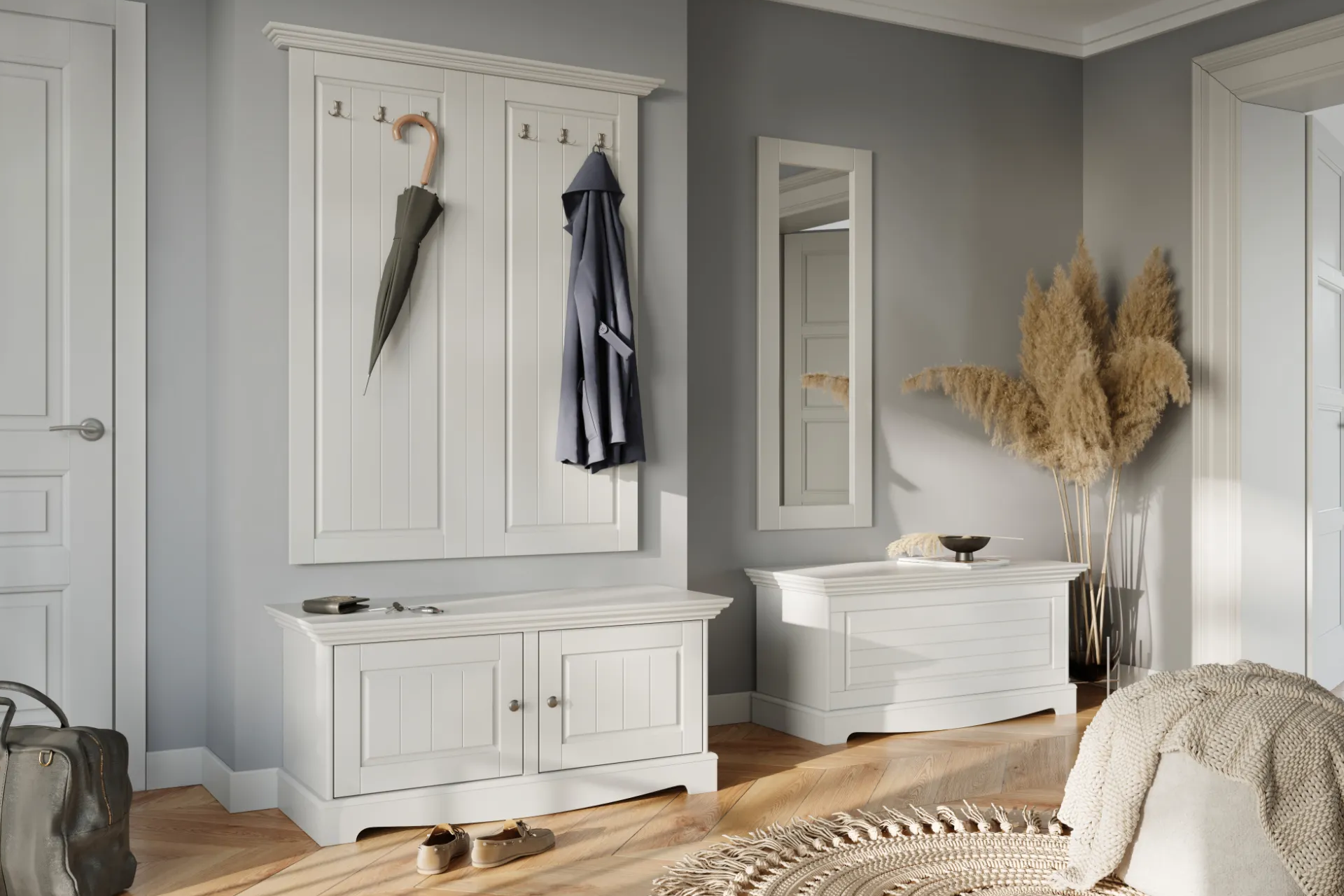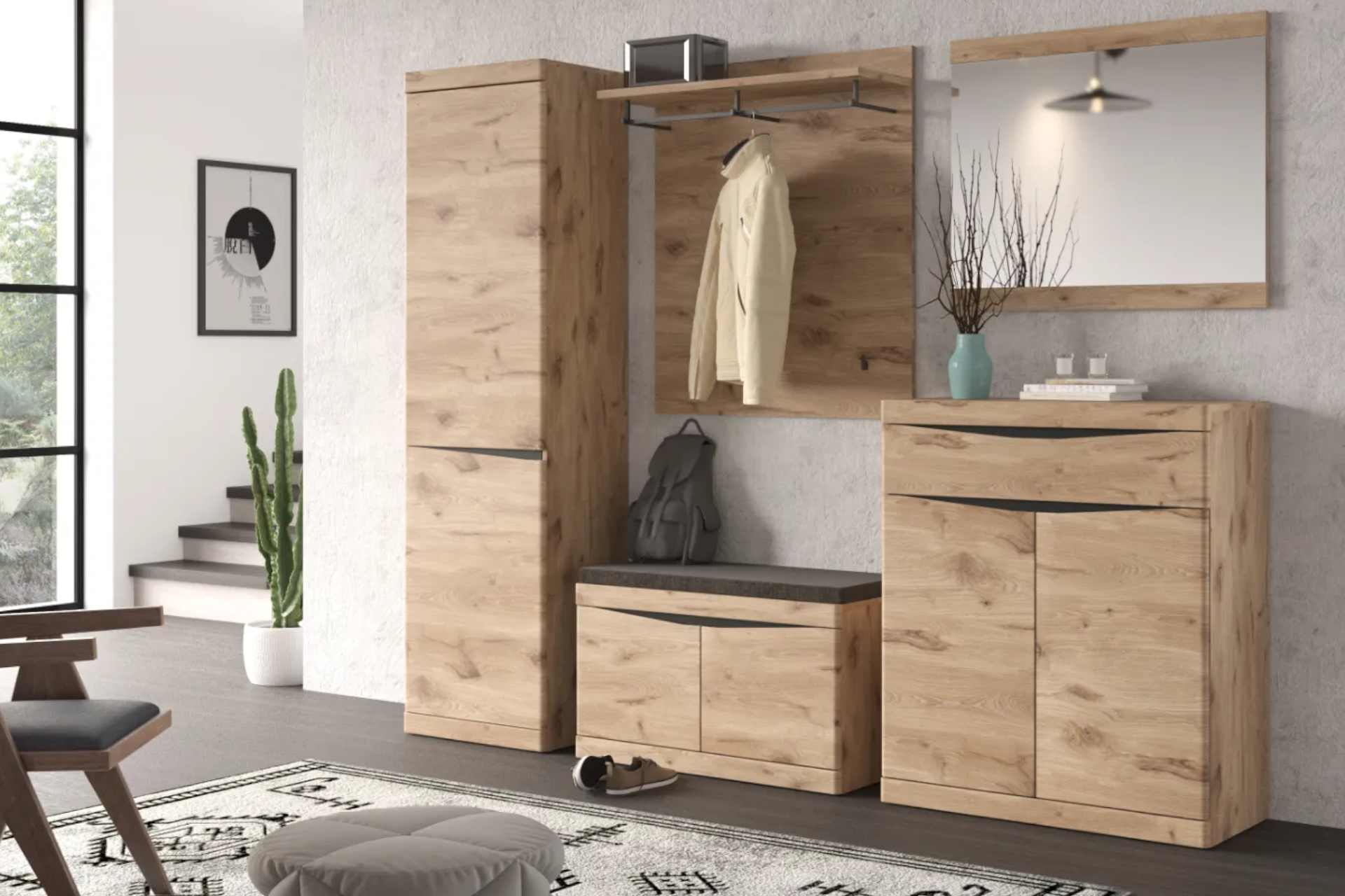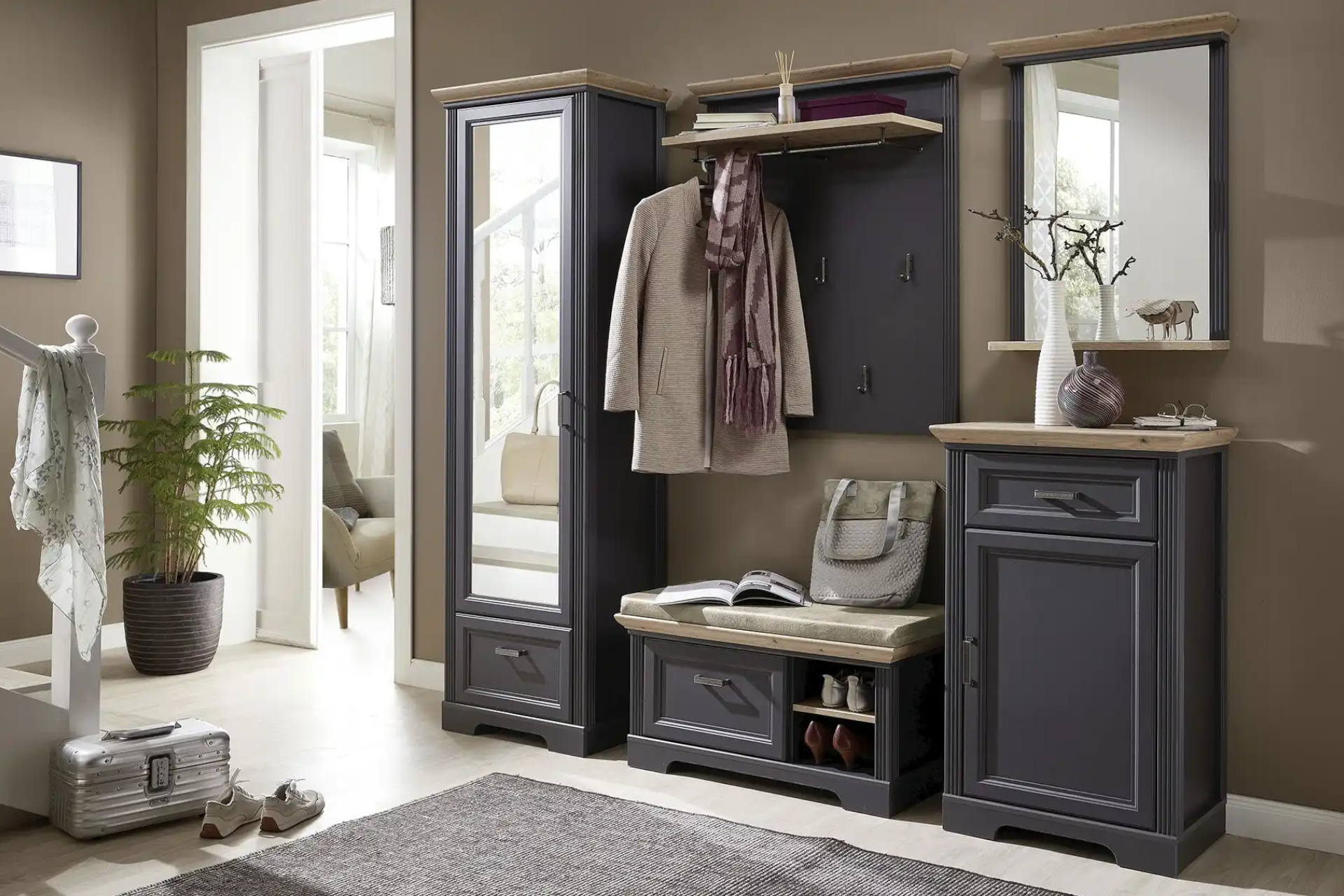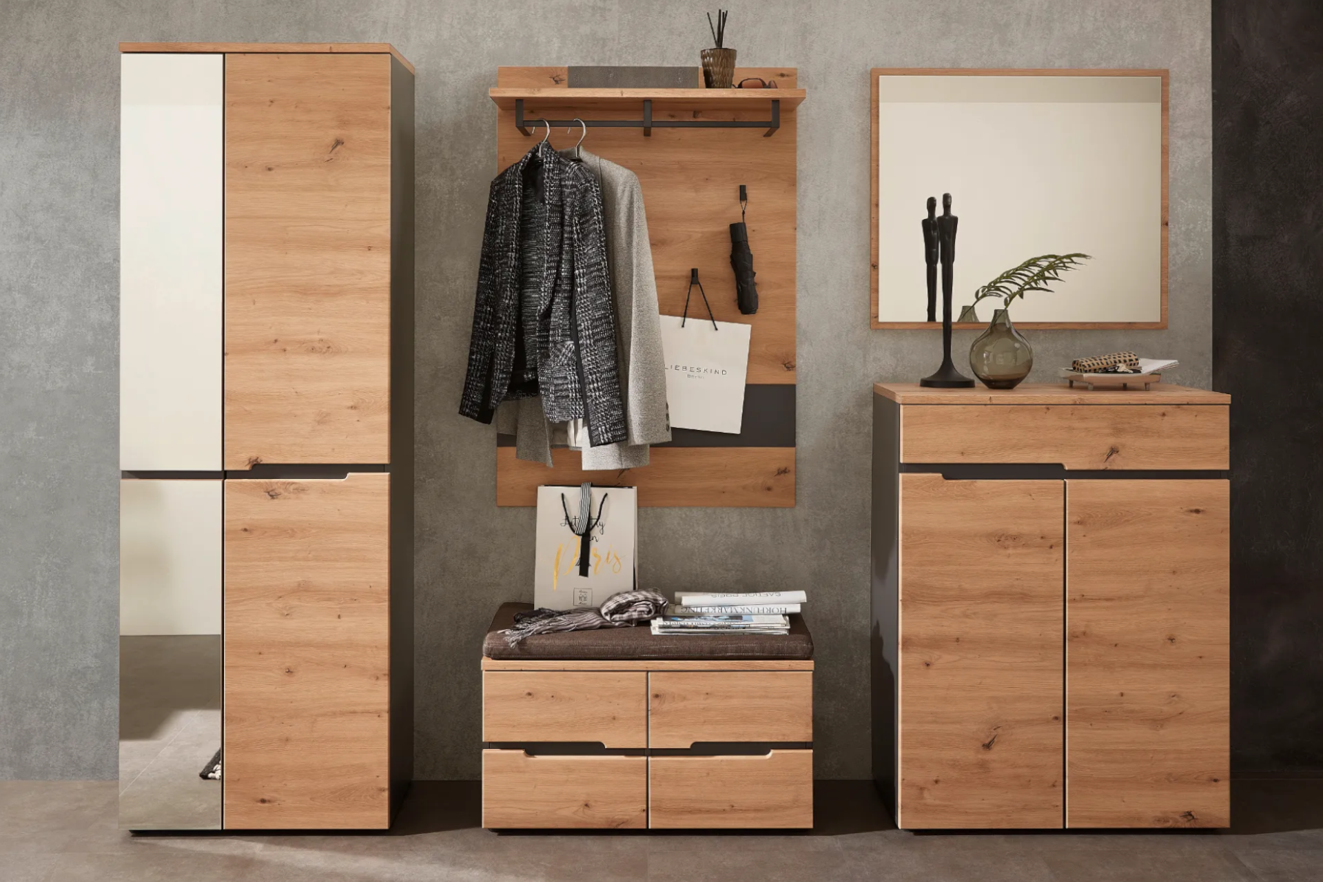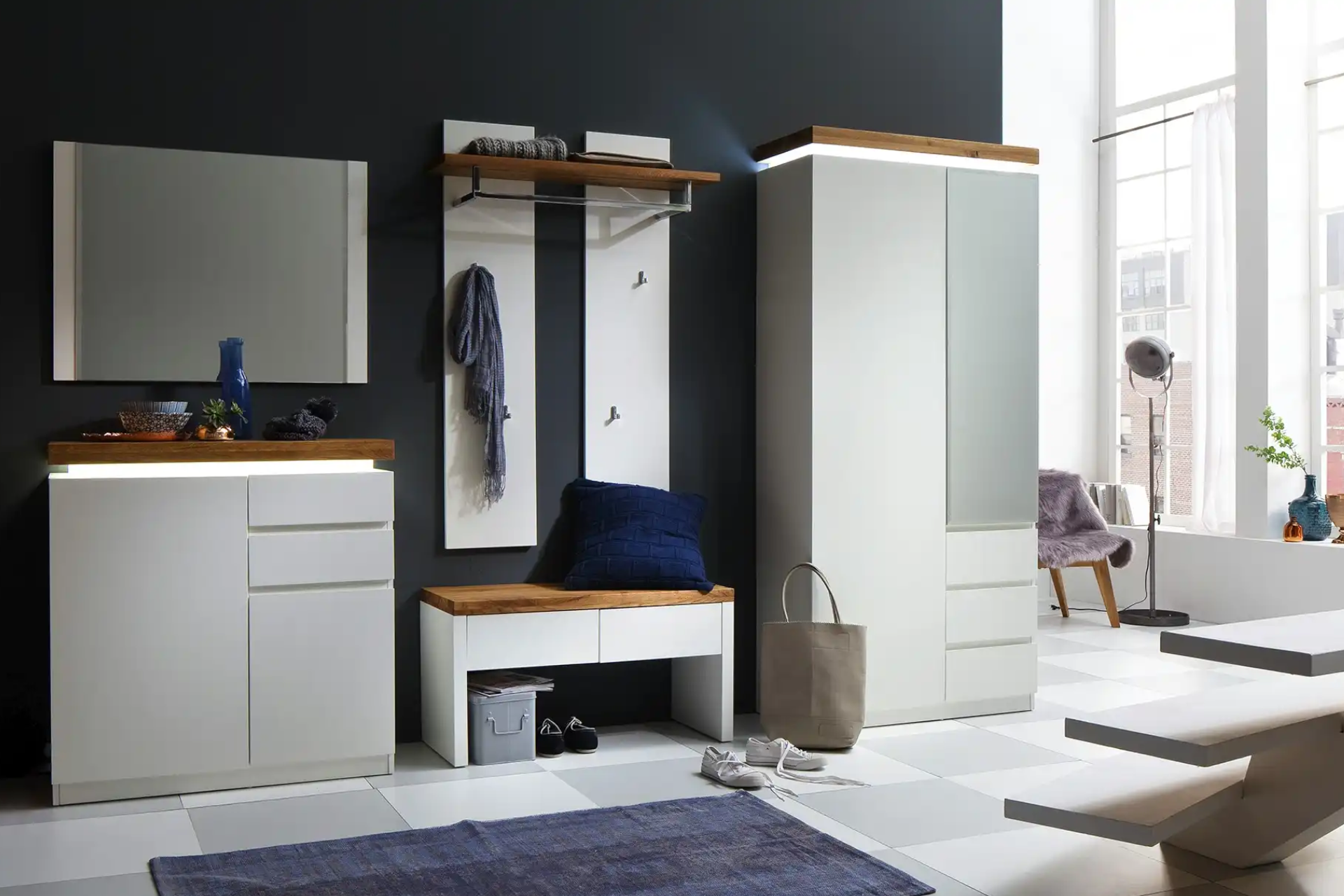- Často sa vyrába v jednej línii s konkrétnymi kolekciami obývačkových programov, takže vstupnú časť domu ľahko zladíte so spoločenskou zónou.