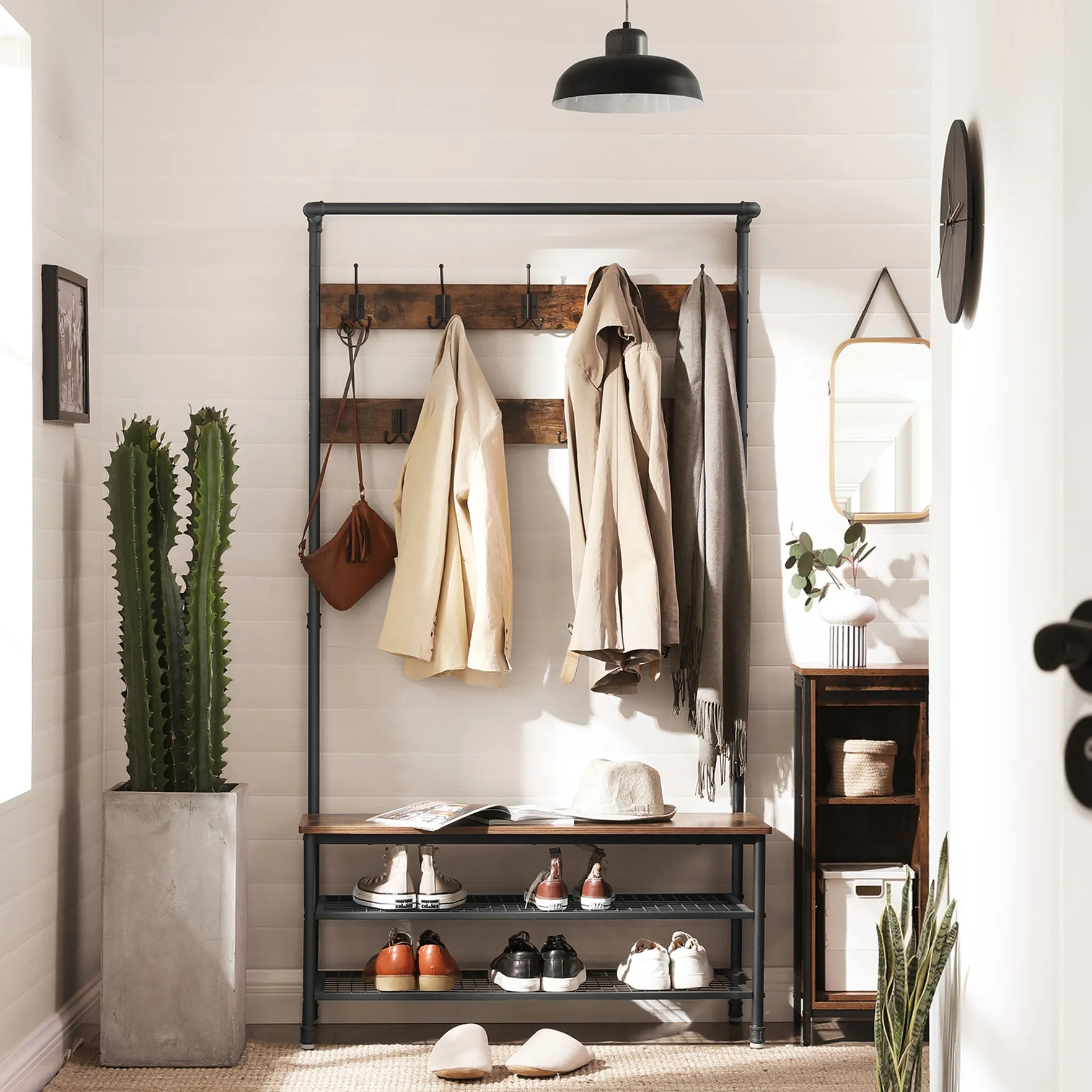 Podobne ako sú v súčasnosti v kuchynských linkách moderné otvorené police, na ktorých sú vyložené šálky, taniere a dózy, aj v predsieni sa môže uplatniť tento odvážny „obnažený“ štýl. Namiesto skrine teda môžete do priestrannejšej predsiene postaviť zostavu alebo stojan na šaty s jednoduchou konštrukciou. Rovnaký efekt ponúkajú regály a lavice s viditeľnými policami či organizéry, do ktorých môžete pri odchode z domu rýchlo hodiť papuče alebo môžu poslúžiť na rôzne drobnosti, ako sú skladacie dáždniky, čiapky, kabelky a podobne. Jednoduché kovové konštrukcie dodajú vašej predsieni populárny industriálny nádych.
