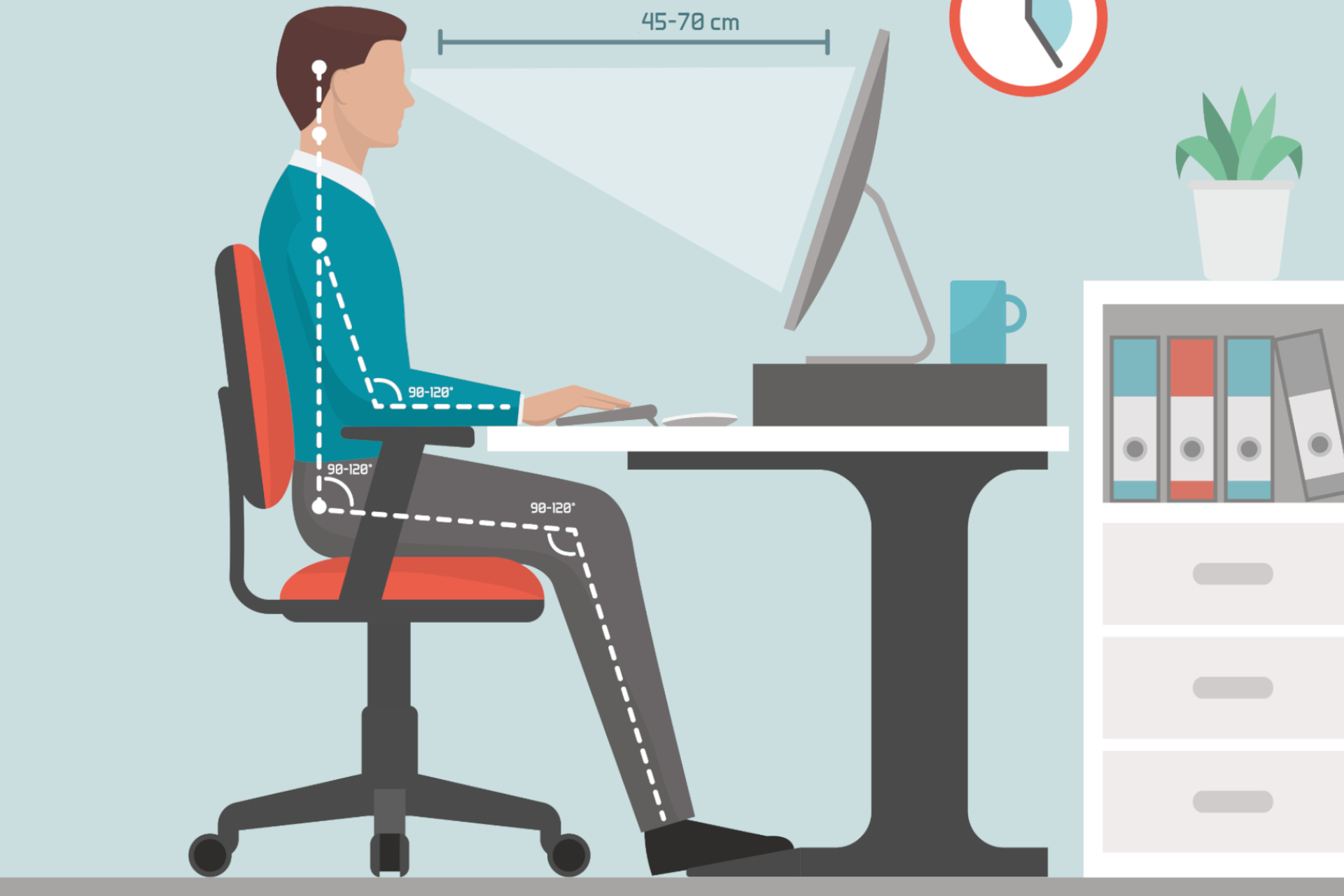 - Nohy by mali byť chodidlami položené na zemi, pričom členky, kolená, bedrá a lakte by mali pri pohodlnom sedení zvierať 90- až 120-stupňový uhol. Medzi okrajom sedadla a podkolennou jamkou by mala byť vzdialenosť 5 až 10 cm.