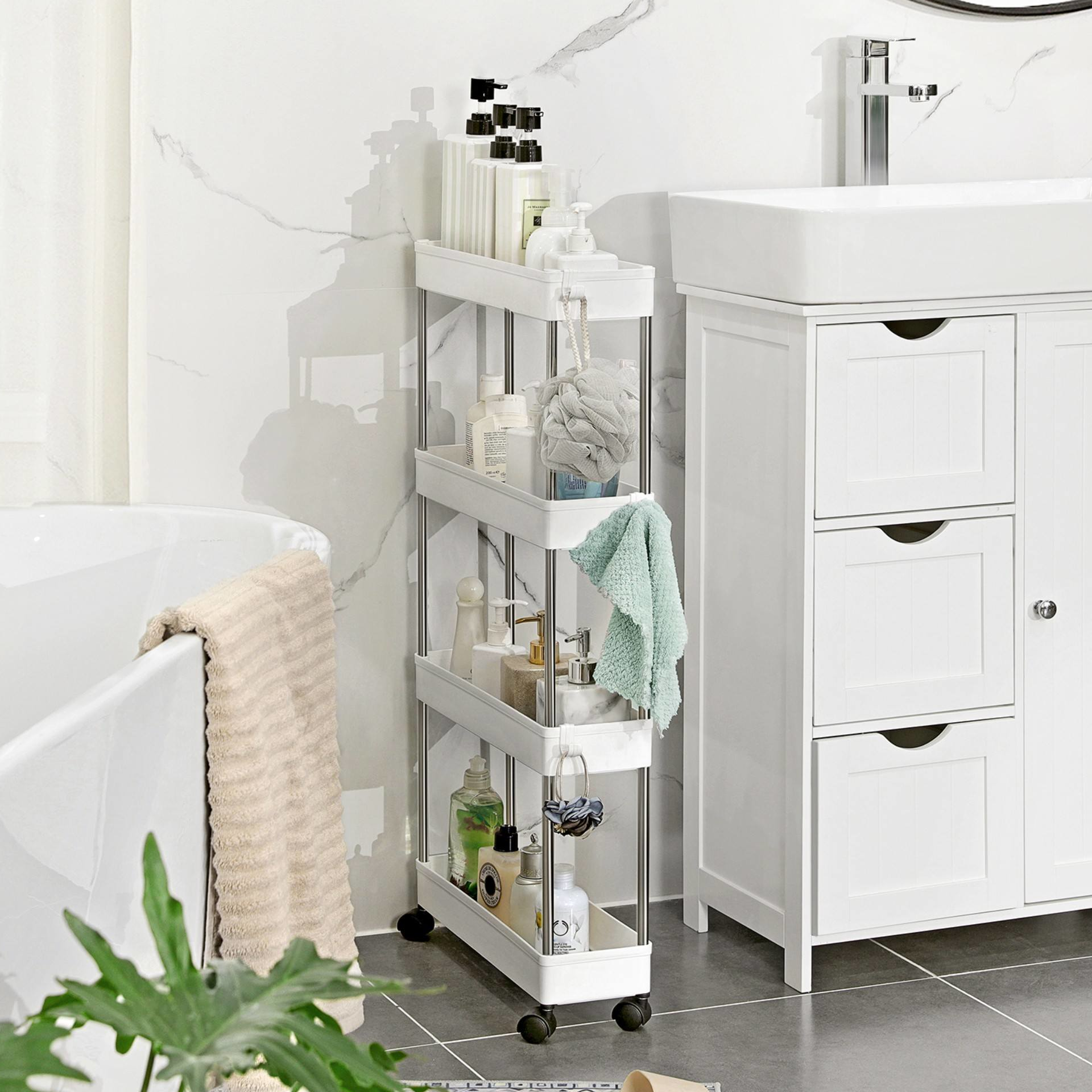 K obľúbeným patria extra úzke, no hlboké skrinky s výsuvným mechanizmom. Umiestňujú sa do úzkych priestorov, napríklad medzi práčku a stenu či záchod a stenu. Alternatívou sú výsuvné vozíky, prípadne regály na kolieskach, ktoré sa líšia od skriniek tým, že majú otvorené police alebo košíky. Ľahko ich presuniete, kam potrebujete. Odkladací priestor môžete získať aj vďaka skrinkám, ktoré majú v sebe zabudovaný držiak na toaletný papier, prípadne ďalšie príslušenstvo.