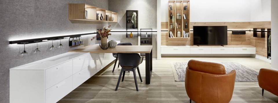 Nábytok kuchyne, jedálne a obývačky by mal byť štýlovo rovnaký. Vhodným riešením je nábytok na mieru do celého priestoru, ktorý bude spolu dokonale ladiť. Ak si dávate vyrobiť kuchyňu na mieru, možnosťou je aj dať si vyhotoviť zvlášť solitérne skrinky, ktorých umiestnením v obývacej časti dosiahnete požadované zladenie kuchyne s obývacím priestorom.