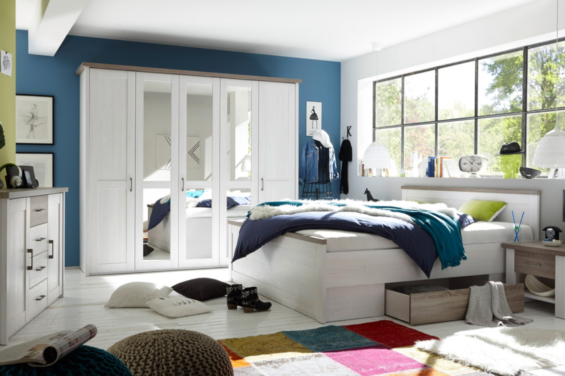 Ak chcete veselú bielu spálňu, môžete biely nábytok zladiť s kontrastnými farbami, ako sú červená, žltá či oranžová. V súčasnosti sú však v kurze najmä kráľovská modrá, smaragdová či tzv. kačacia, čiže modrozelená farba. Nadčasovejší charakter dodajú spálni najmä pastelové odtiene ružovej, horčicovej, olivovozelenej alebo modrej. V kombinácii s ružovou vzbudzuje spálňa dojem nevinnosti a mladosti. S tónmi modrej biely nábytok vytvára atmosféru pripomínajúcu morské pobrežie a oceán. Ešte lepší efekt získate, ak do tejto škály primiešate zemité odtiene hnedej a oranžovej.