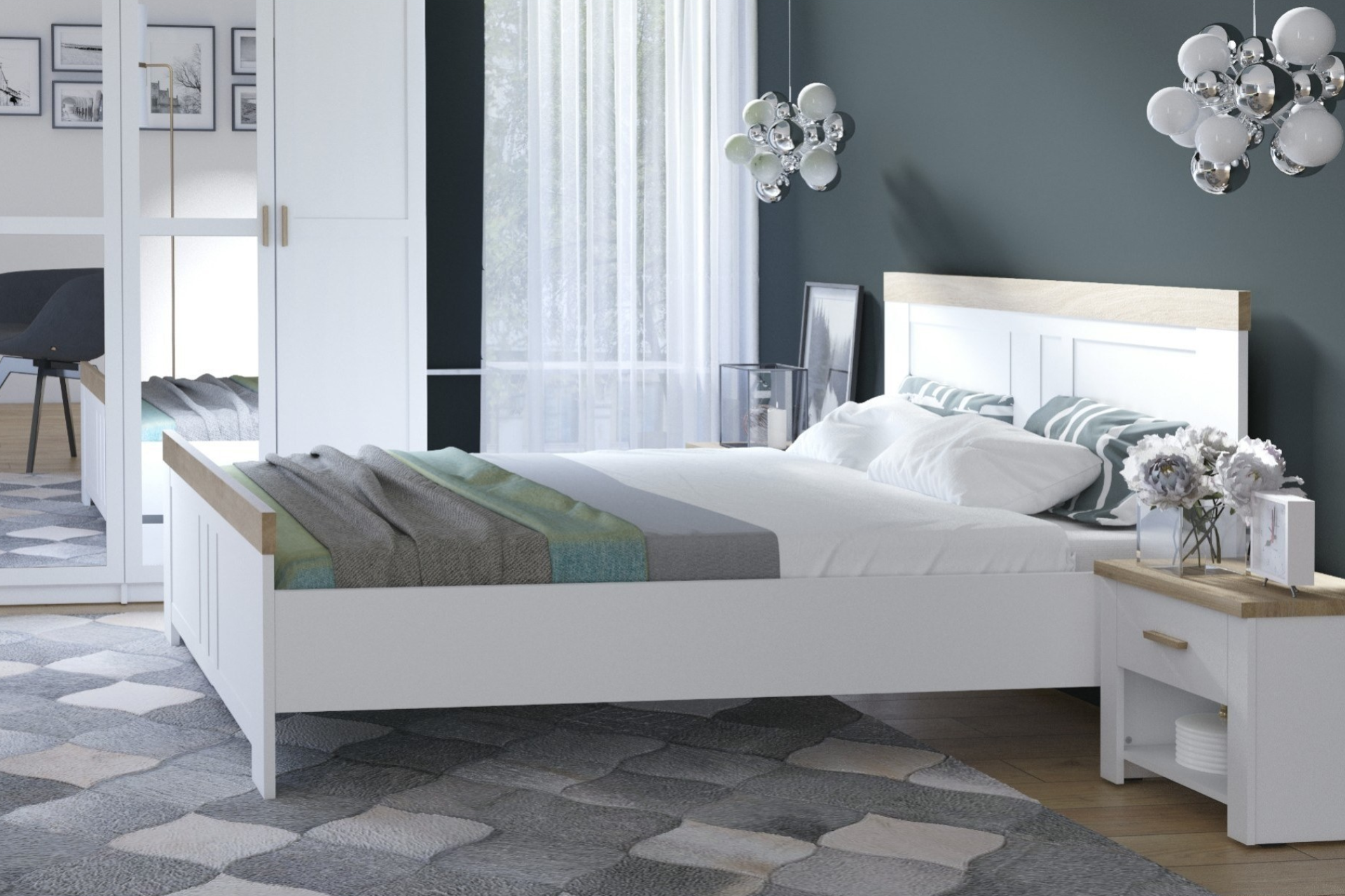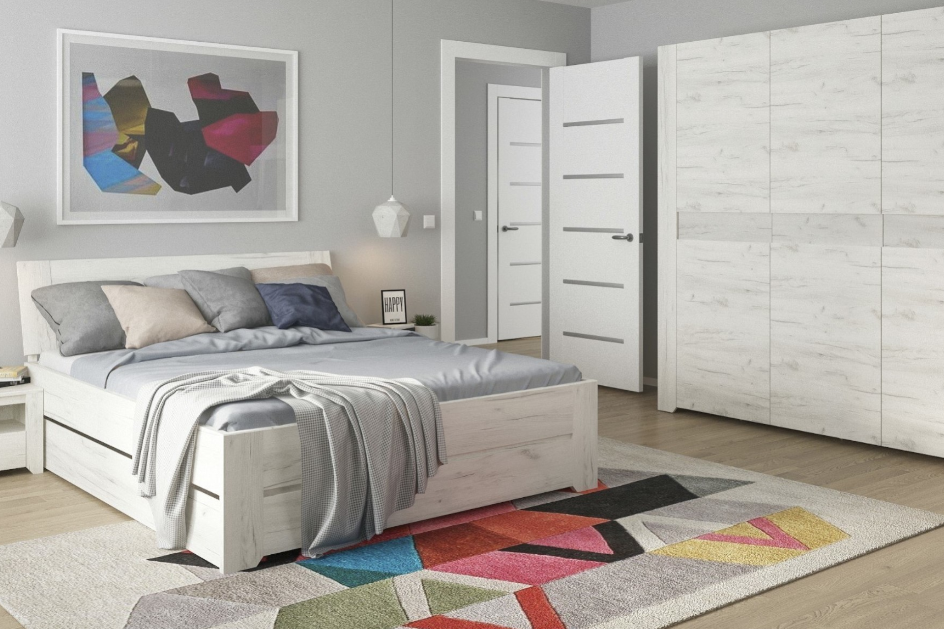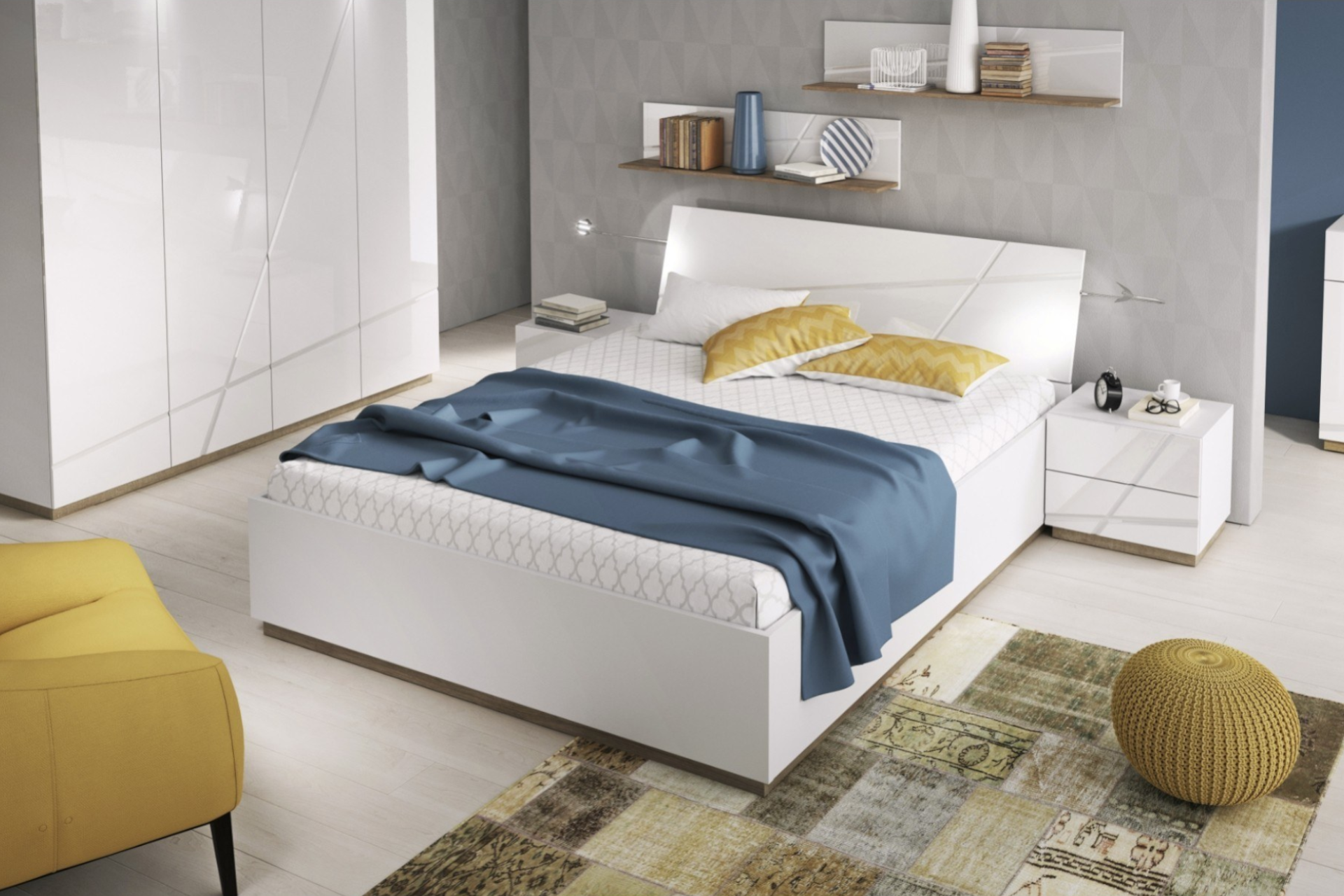Biely nábytok do spálne Dreano kombinovaný s drevodekorom. Zdroj: SCONTO