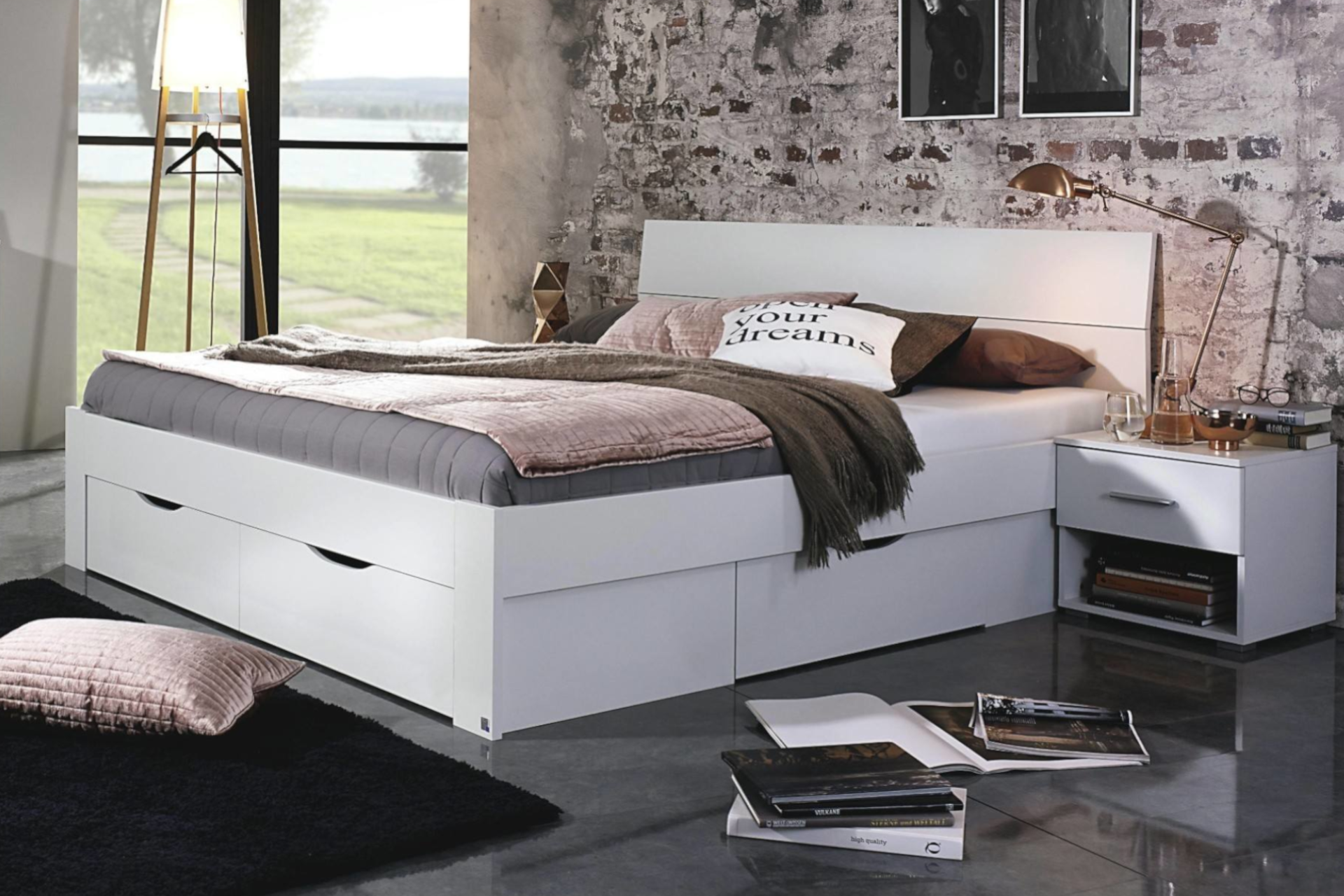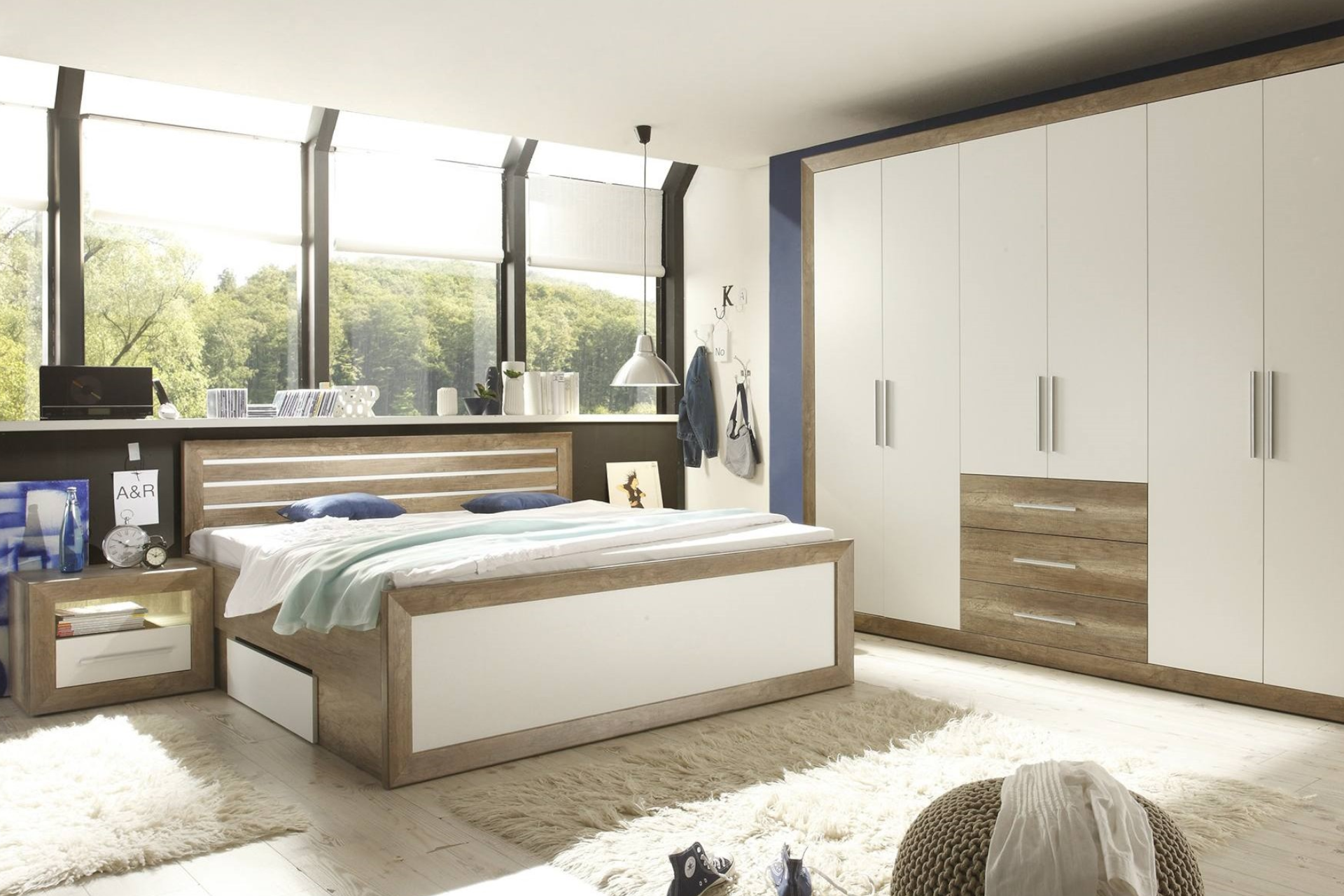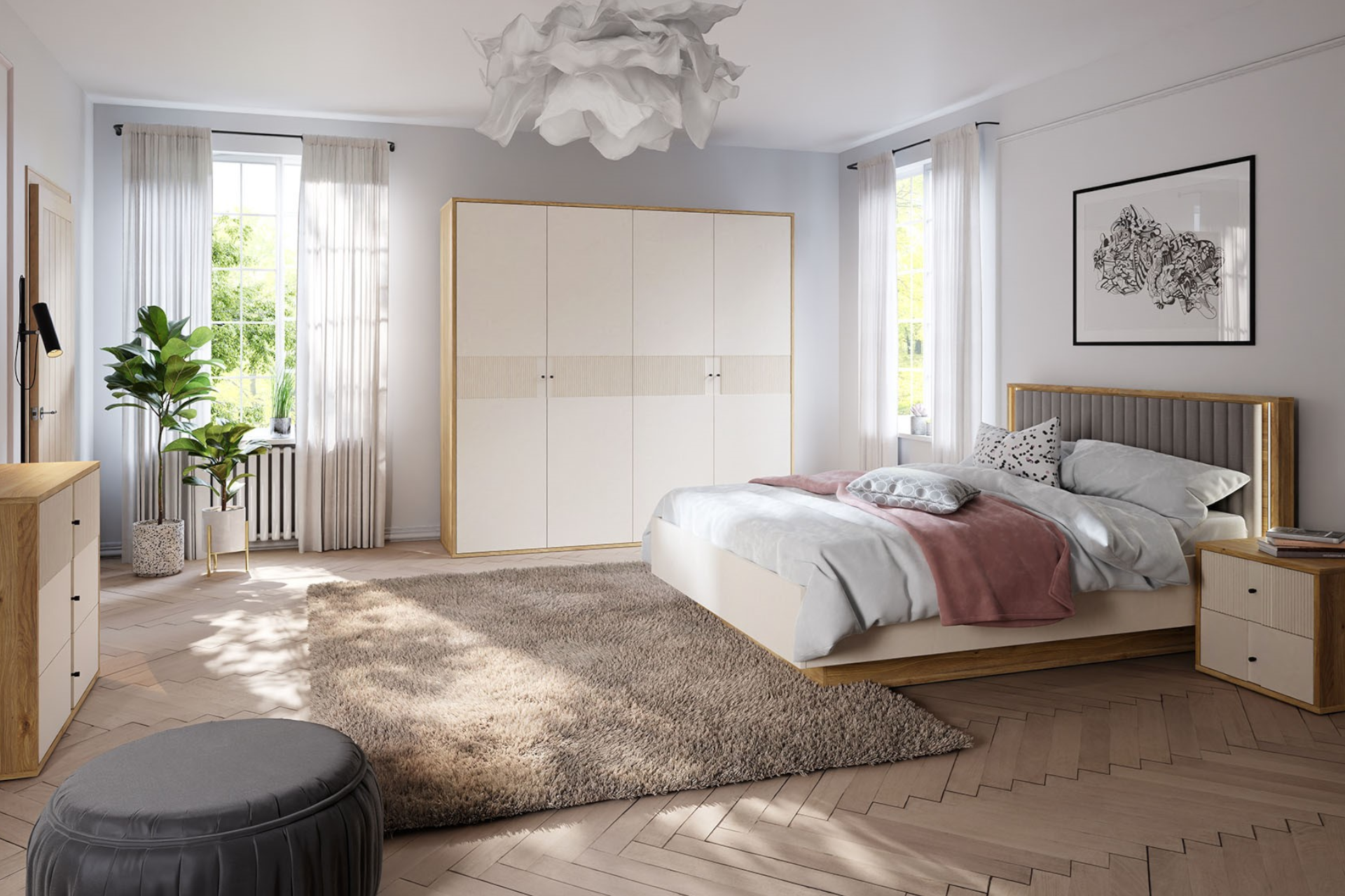 Biely nábytok do spálne Dreano kombinovaný s drevodekorom. Zdroj: SCONTO
