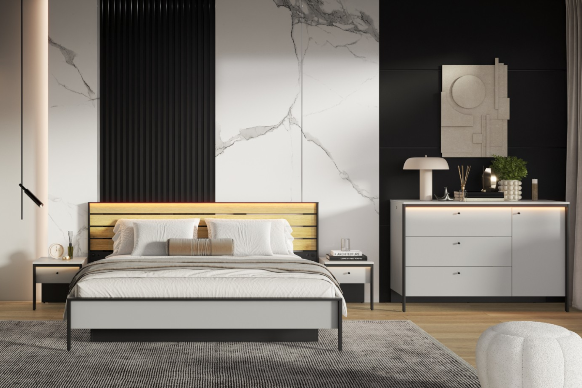 Biela spálňa Gris v kombinácii s čiernou. Zdroj: SCONTO