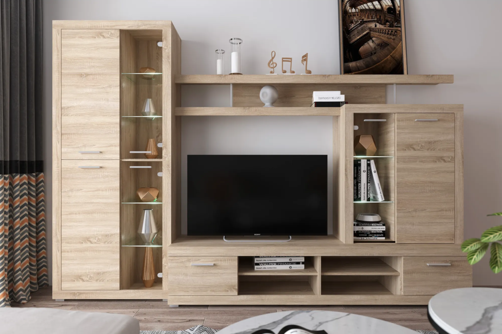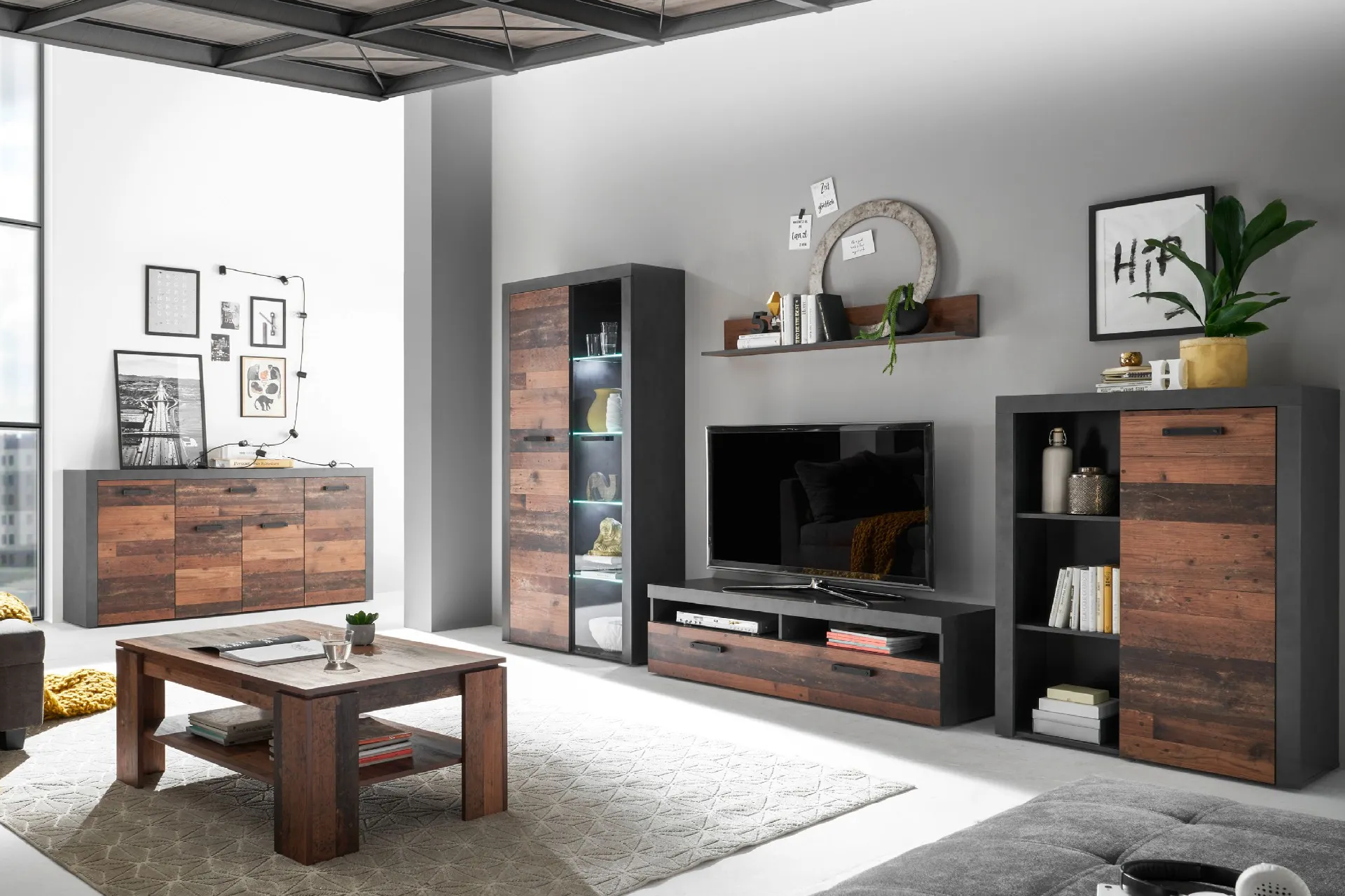 Pri výrobe zostáv do obývačky sa často používa aj tzv. fóliovaný drevený materiál. Ide o tenkú vrstvu papiera nalepenú na samotný povrch skriniek. Umožňuje vytvoriť azda najširšie spektrum farebných úprav a dekorov, no zároveň treba dávať pozor na možné odreniny a škrabance.