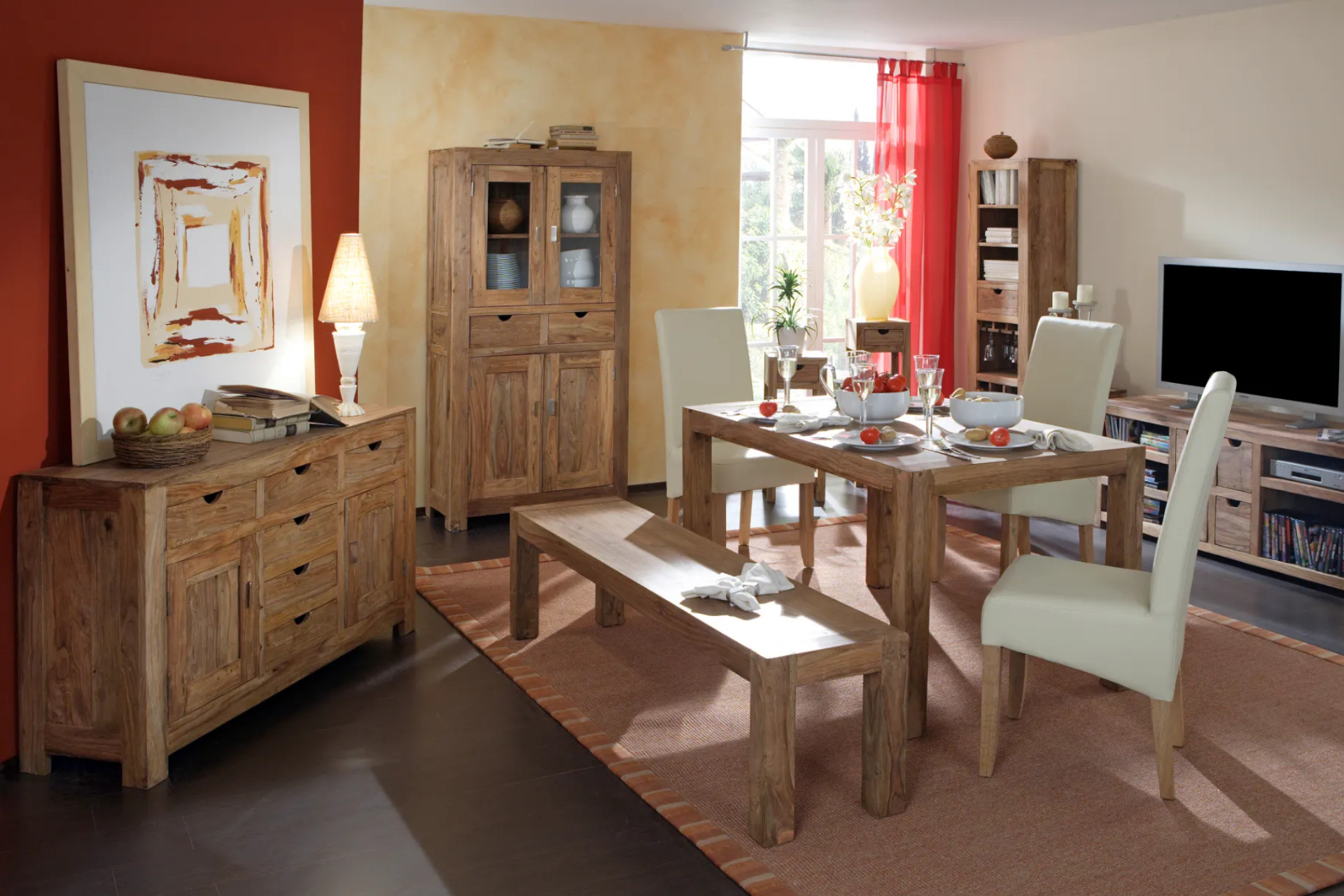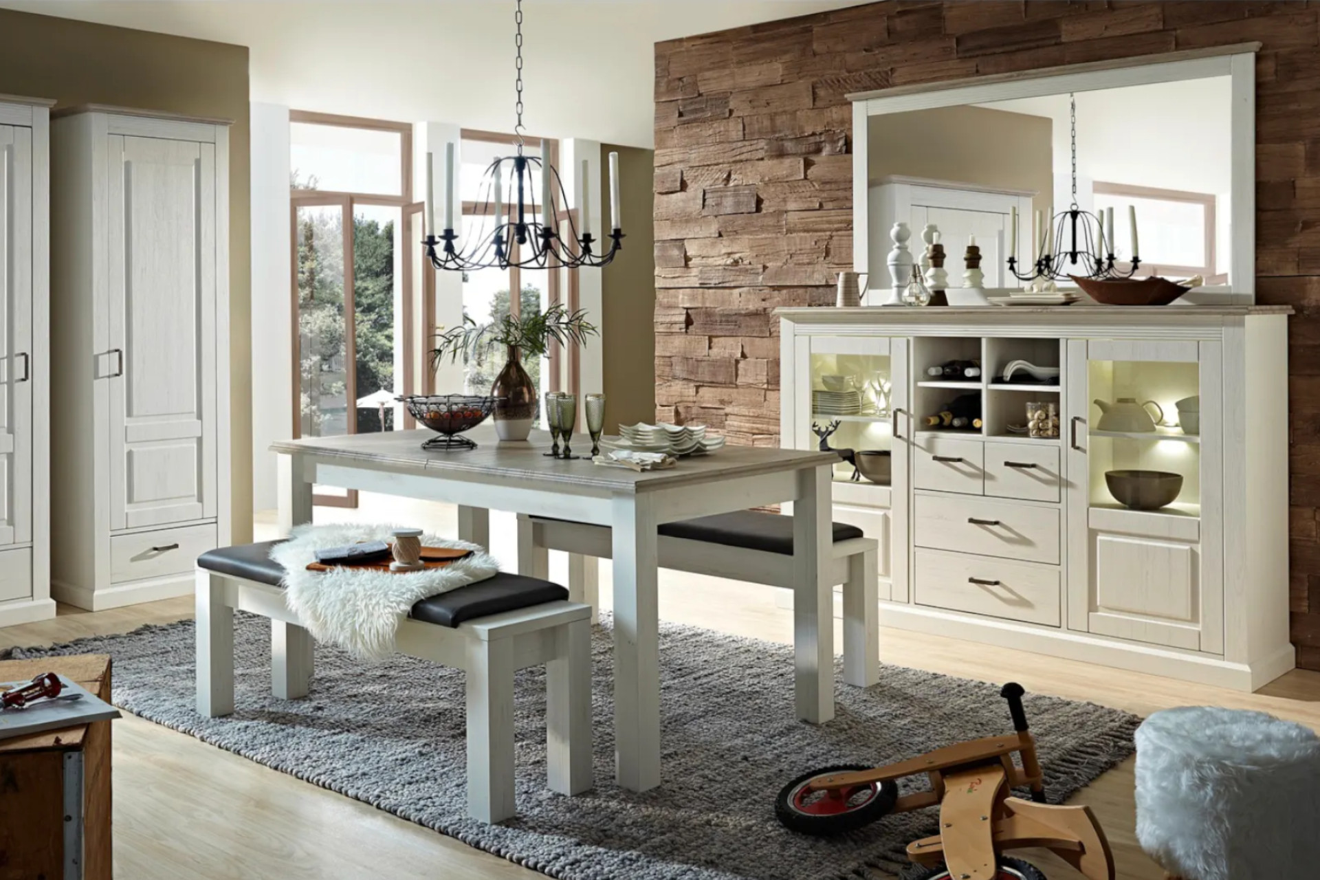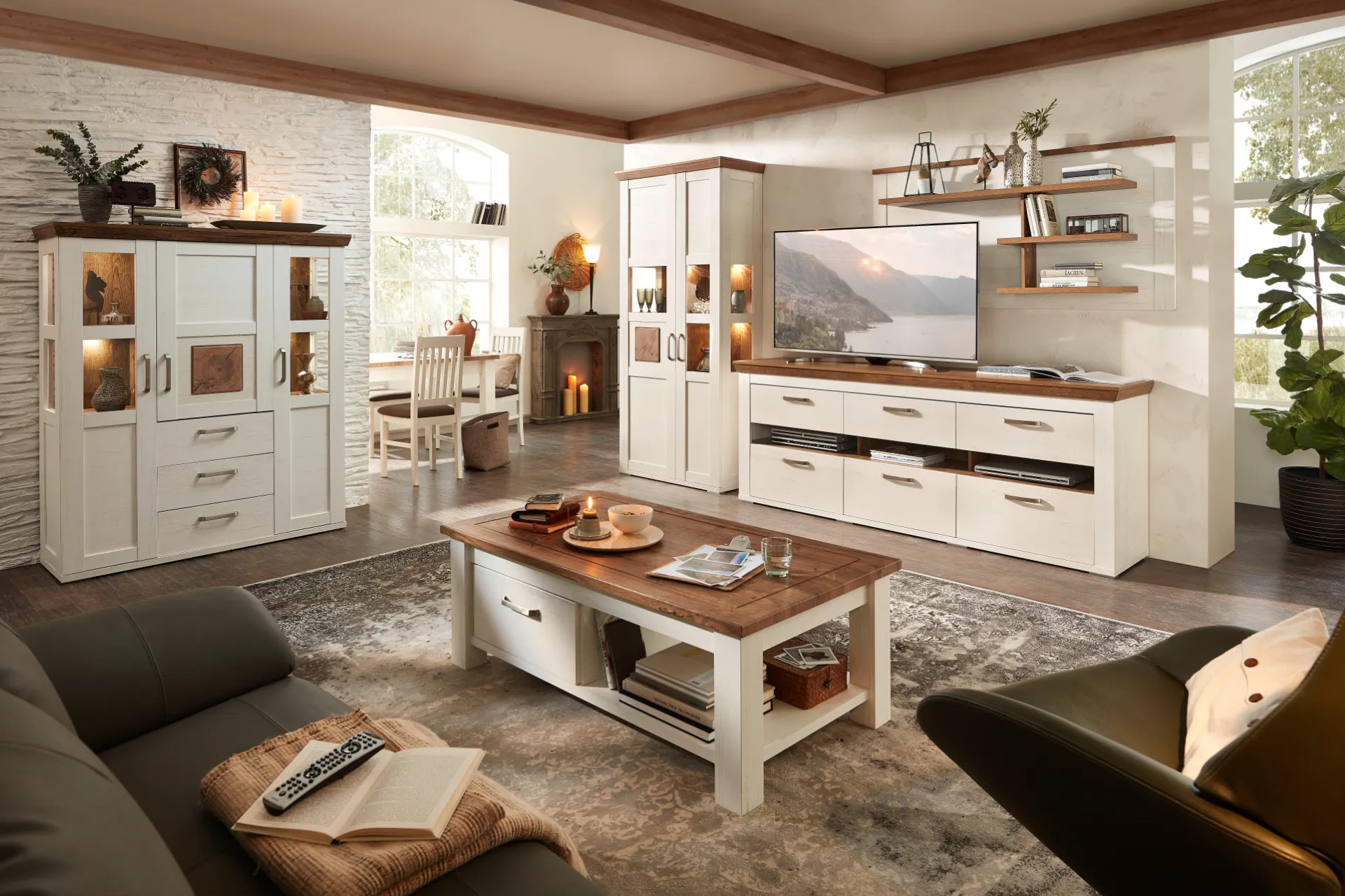 Vidiecky štýl nepatrí len na vidiek. Spojenie prírodných dekorov, svetlých farieb a tradičných detailov sa uplatní aj v meste. Konferenčný stolík s odkladacím priestorom môže byť prirodzeným centrom obývačky. Nízka komoda poskytne úložný priestor a zároveň plochu na aranžovanie dekorácií. Skvelý tandem vytvorí najmä s veľkým zrkadlom. V kombinácii s presklenou vitrínou a ostatným zariadením dáte obývačke útulný a romantický nádych.
