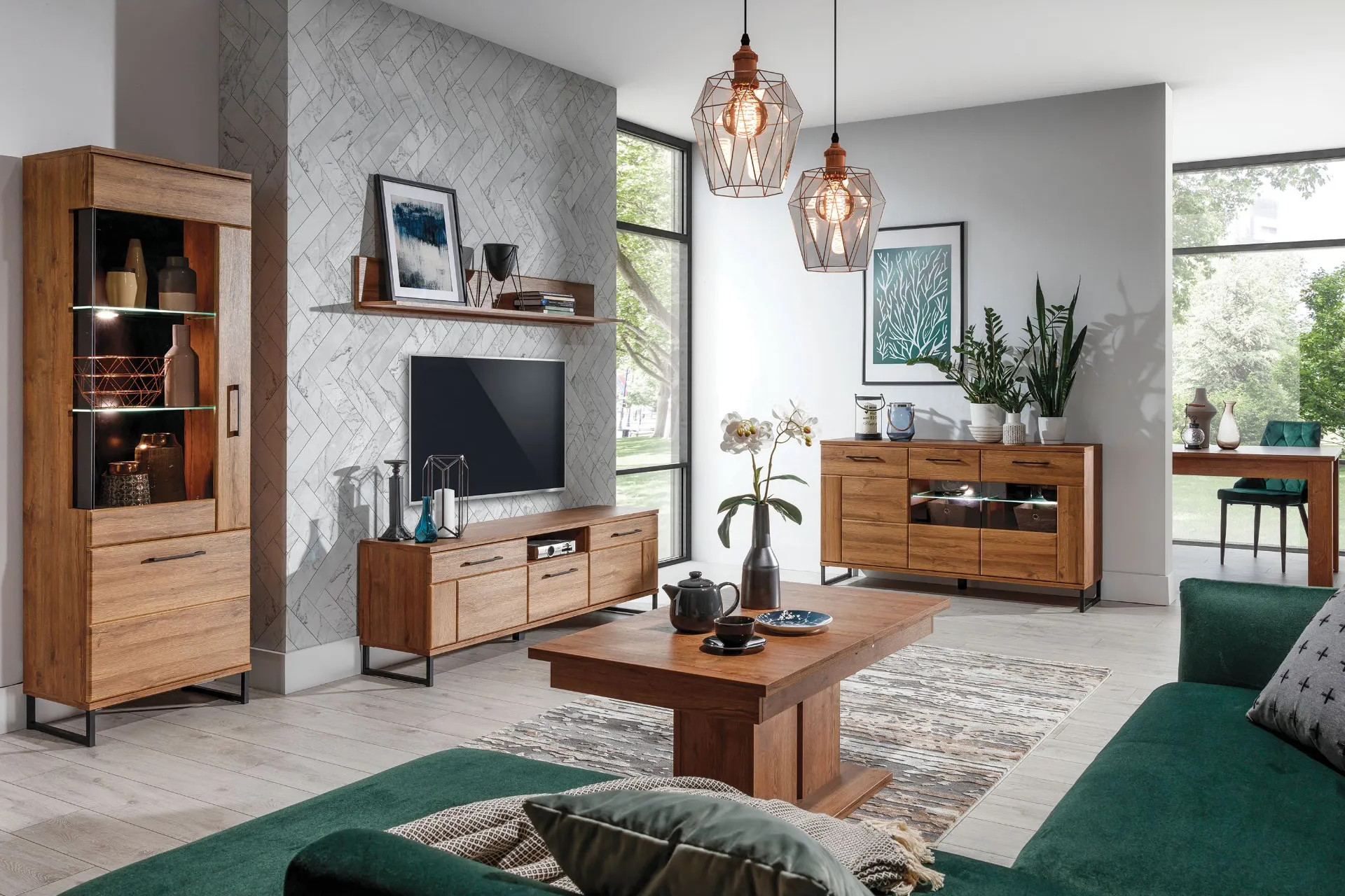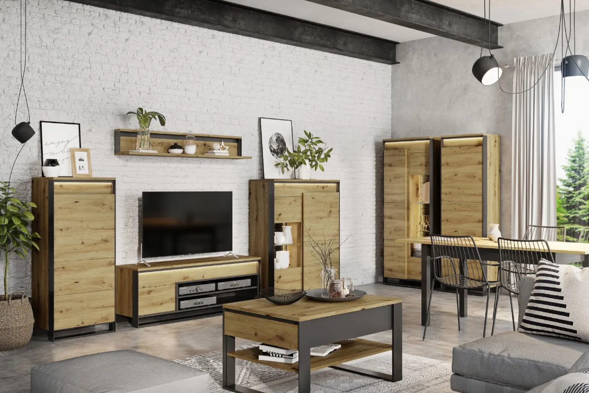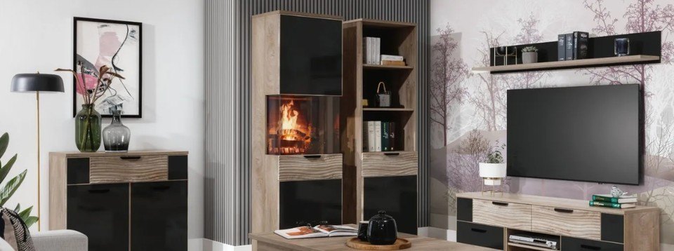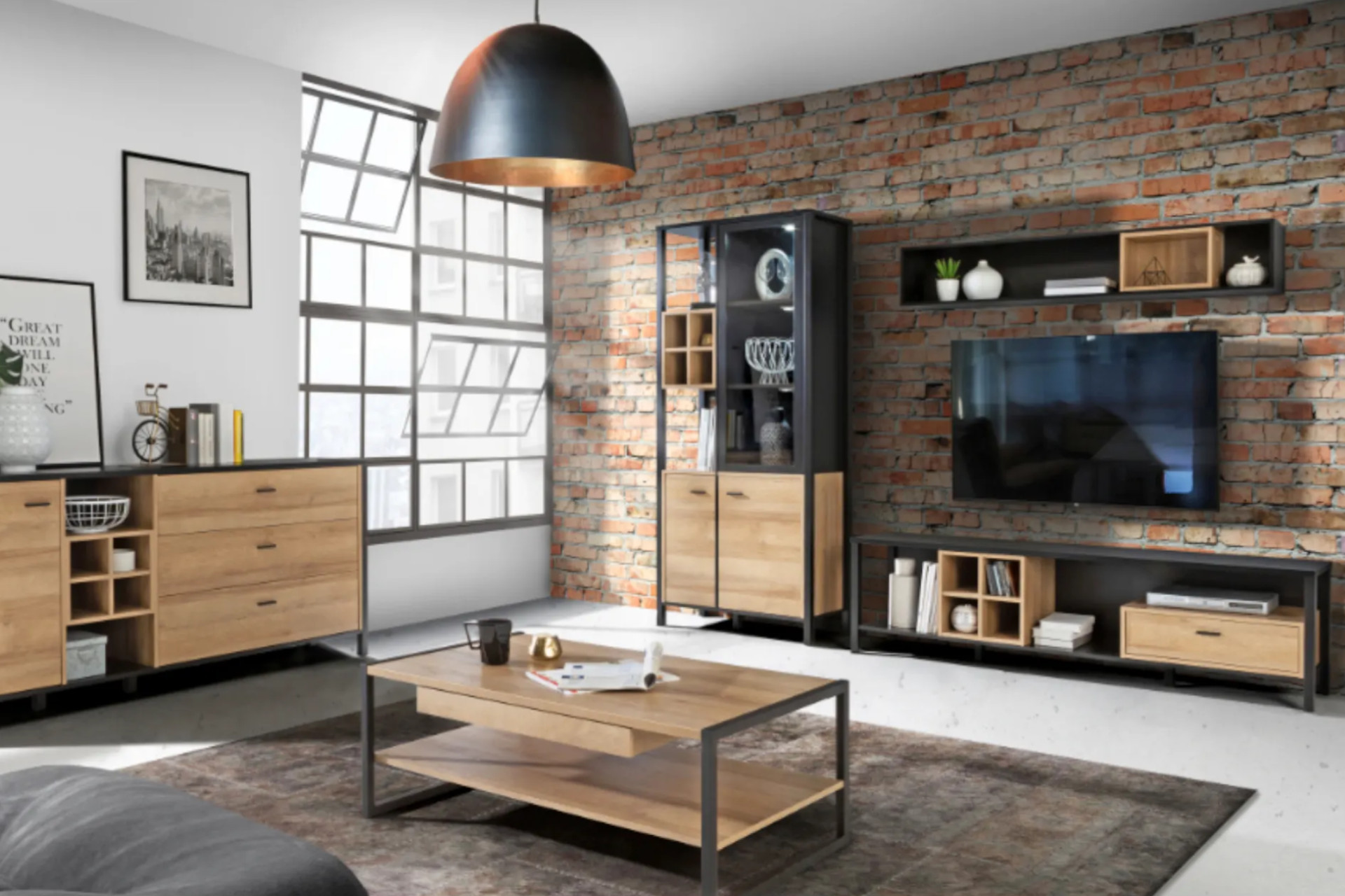 Chcete do svojho bývania vniesť nekonvenčnú industriálnu atmosféru? Skúste spojenie drevených prvkov a čierneho kovu. Nízka komoda so zásuvkami a policami ukryje rôzne drobnosti a poslúži na vystavenie obľúbených dekorácií. Kombinácia stolíka na televízor, vysokej vitríny a závesnej police vytvorí kompozíciu, ktorá zaručene pritiahne pohľady. Takýto nábytok skvelo vynikne na pozadí bielych stien, výborne však pasuje aj k tehlovým obkladom či betónu.