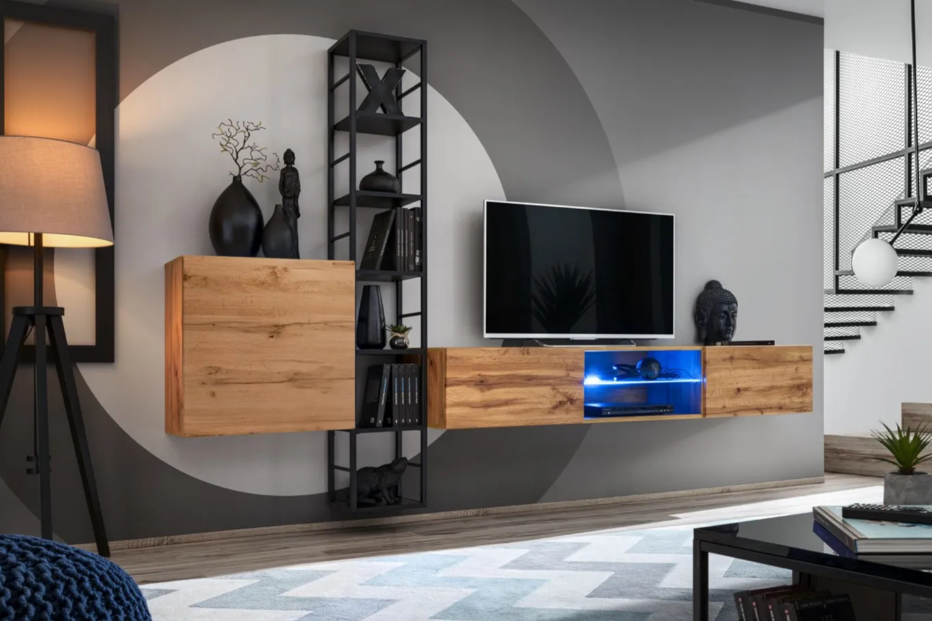 Minimalistická zostava regálu a nástenných skriniek rôznych veľkostí má ráz uceleného bloku, ale zároveň i vzdušnosti. Čisté línie skriniek bez úchytiek ukrývajú dostatok úložného priestoru. Takéto riešenie navyše uvoľní priestor na podlahe, čo pôsobí elegantne a odľahčene. Štýlové modré LED podsvietenie poličiek vytvára takmer futuristický dojem. Takáto zostava spraví aj z obyčajnej sivej steny stredobod pozornosti.