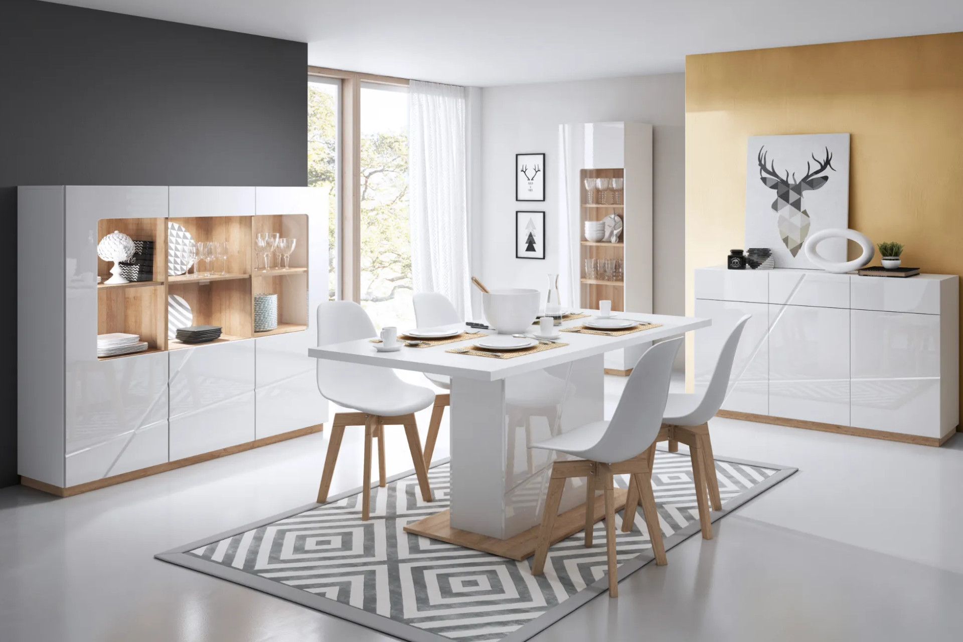 Spojenie obývačky s jedálňou je obľúbené. Na dosiahnutie jednoliateho celku môžete jedálenský stôl zladiť so skrinkami. Stôl s masívnou konštrukciou bude stabilným ťažiskom jedálne a umožní vám užiť si stolovanie s rodinou a priateľmi. Obzvlášť do tmavých priestorov je vhodný lesklý biely nábytok, ktorý odráža svetlo. Okrem toho vnáša do interiéru dojem poriadku a ľahko ho zladíte s doplnkami rôznych farieb. Do popredia ho vizuálne dostanete stenami v kontrastných odtieňoch.