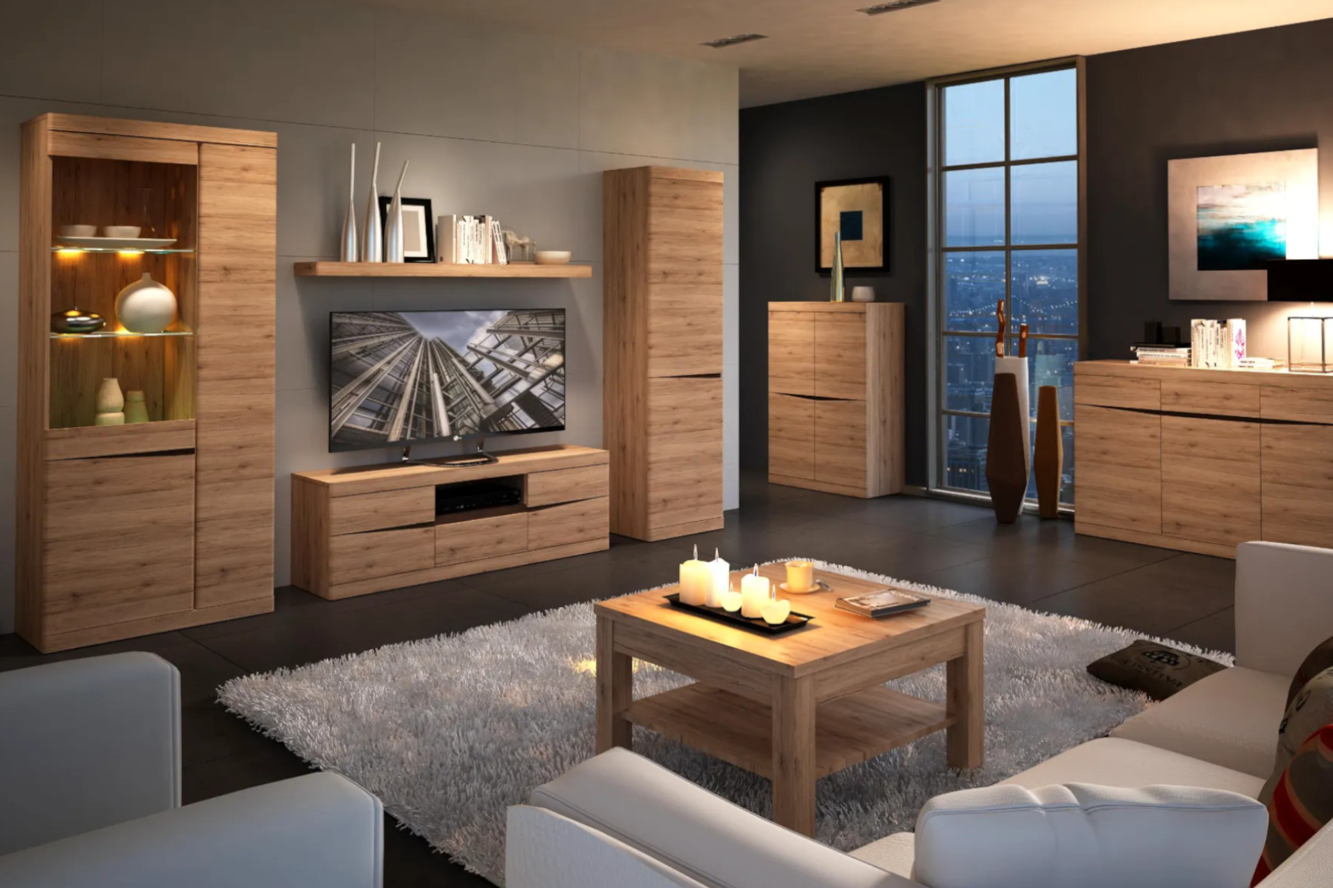 Nábytok v neutrálnych odtieňoch a s elegantnou kresbou dreva zútulní každý priestor. Jednotlivé prvky, ako sú komody či vitríny, vám umožnia prispôsobiť zariadenie presne vašim potrebám a priestoru. Konferenčný stolík v elegantnom dizajne sa stane ústredným bodom odpočinkovej zóny obývacej izby. Kovové detaily dodávajú nábytku jemne priemyselný nádych, ktorý sa uplatní v moderných aj industriálnych interiéroch.