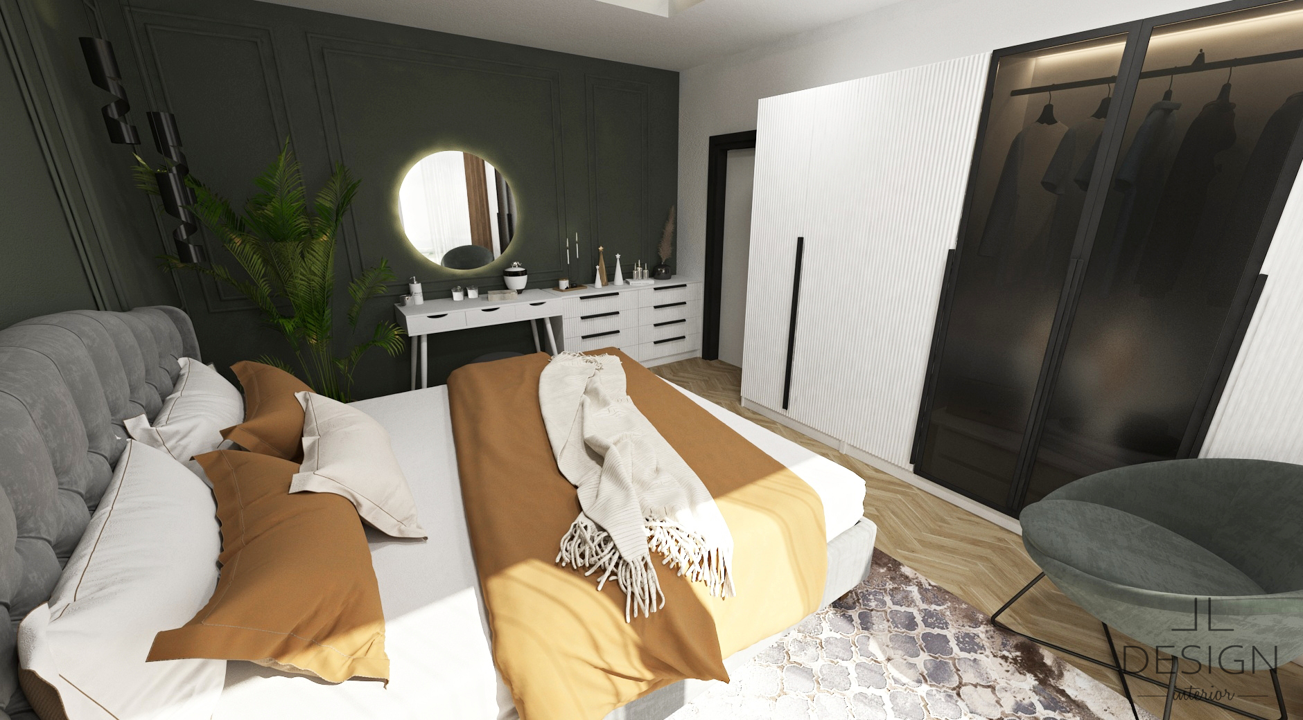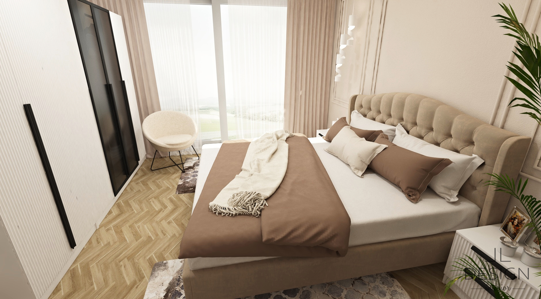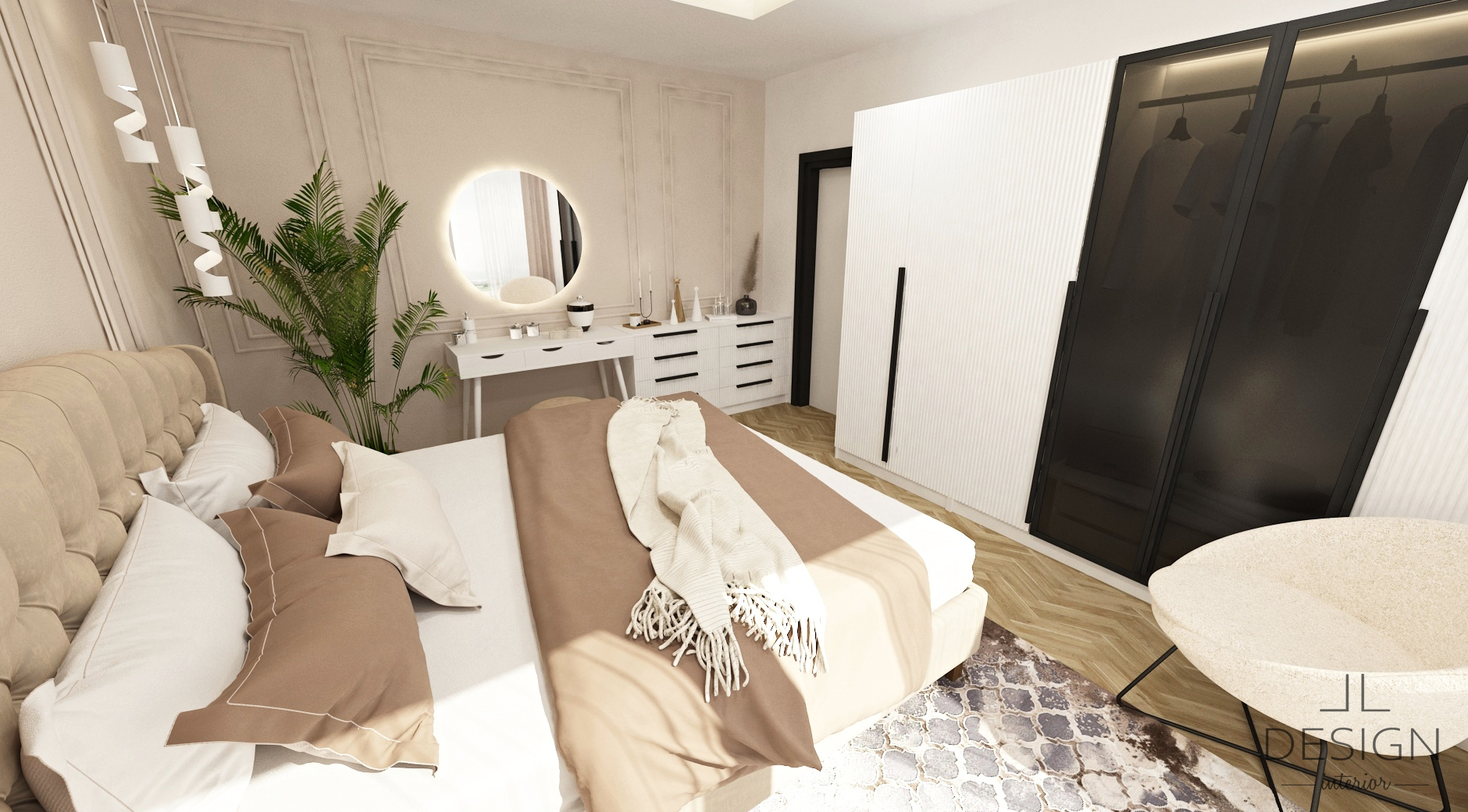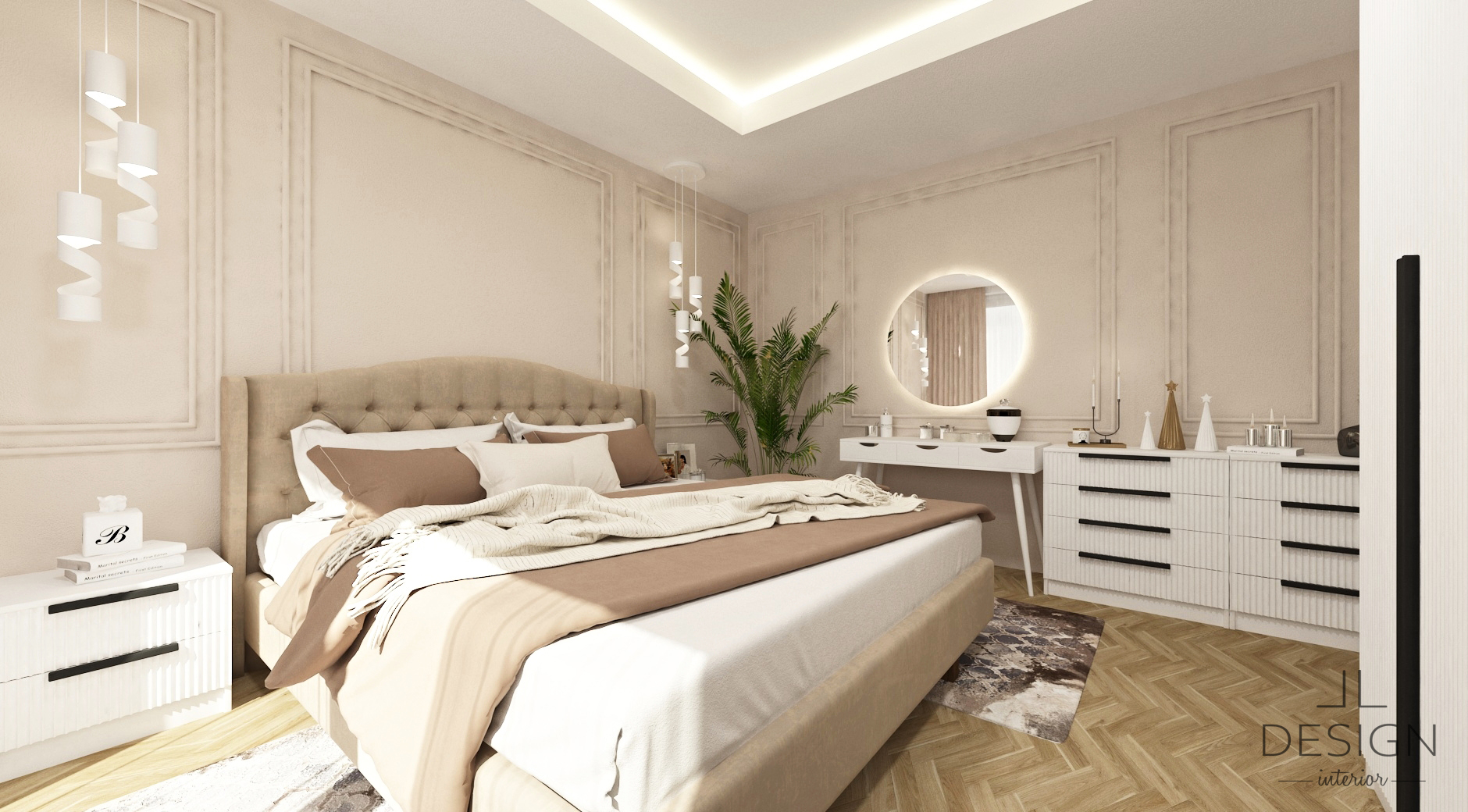 Stolík, ktorý možno využiť ako pracovný alebo toaletný, je doplnený moderným podsvieteným kruhovým zrkadlom. To vytvára príjemnú hĺbku priestoru. Osvetlenie stropu a svietidlá nad nočnými stolíkmi dodávajú interiéru sofistikovaný nádych a podčiarkujú premyslenú kombináciu jemných tvarov a materiálov, vďaka ktorým je priestor nielen funkčný, ale aj vizuálne príťažlivý a komfortný.