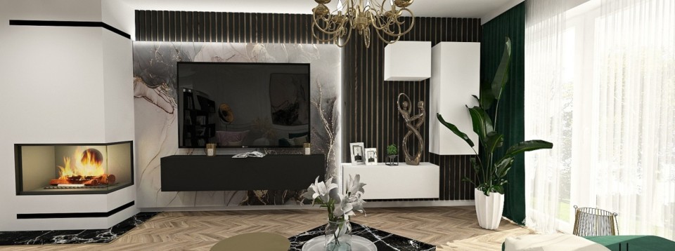 Obývačku sme sa rozhodli zariadiť v štýle glamour. Prečo práve tento štýl? Pretože takéto druhy interiéru pôsobia luxusne a draho, hoci v skutočnosti na ich zariadenie nemusíte nevyhnutne siahnuť hlboko do peňaženky. Stačí iba ovládať pár trikov. Štýl glamour prináša do priestoru eleganciu, jemnosť, šarmantnosť a dokonalosť. Vyznačuje sa leskom, mramorom, honosnými a elegantnými textíliami, ktoré na dotyk prinášajú pôžitok. Typické farby sú čierna s bielou, ktoré sa kombinujú s modrou, červenou alebo zelenou farbou. Samozrejme, ten správny šmrnc vytvoríte ich spojením so zlatými doplnkami.
