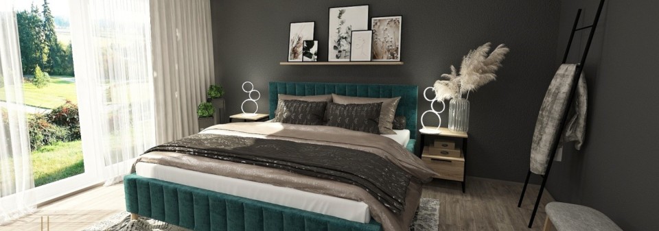 Základ spálne tvorí, samozrejme, posteľ. Pri jej výbere sme zámerne siahli po čalúnenej dvojlôžkovej v krásnej tyrkysovej farbe, keďže mnohým sa takéto výrazné farby páčia, ale nevedia ich skombinovať s ostatným nábytkom v miestnosti alebo sa, naopak, boja, aký celkový feeling napokon docielia. Pri použití výraznej farby postele v spálni treba dbať na to, aby bola stále dominantou, ale zároveň aby celý priestor nepôsobil vulgárne a preplnene. Preto treba pri výbere zvyšných kusov nábytku postupovať uvážene.