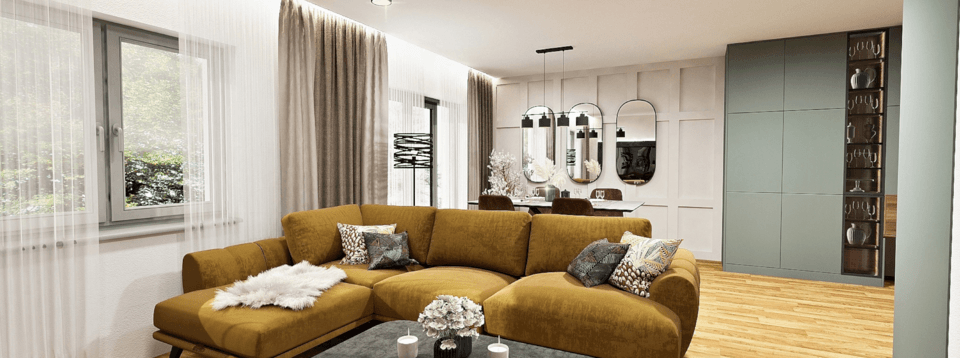 Ak sa snažíme o vytvorenie vizuálne príťažlivého interiéru, je dôležité, aby bola kuchyňa s obývacou izbou v harmónii. To dosiahneme prepojením oboch priestorov vybranými materiálmi a farbami. V našej ukážke ide o kombináciu matnej zelenej farby s orechovým drevodekorom na hlavnom nábytku, t. j. na kuchynských skrinkách a obývačkovej zostave. Zelená s hnedou pôsobia upokojujúco, jemne a zároveň elegantne. Výhodou týchto odtieňov je aj to, že sa pomerne ľahko kombinujú s ďalšími odtieňmi. Do priestoru sme doplnili nápaditú rohovú sedaciu súpravu v žltej farbe, ktorá tam vnáša oživenie. Keďže je celočalúnená, môže byť umiestnená aj uprostred miestnosti a vytvára tak akúsi oddeľovaciu čiaru medzi zónou varenia a oddychu.