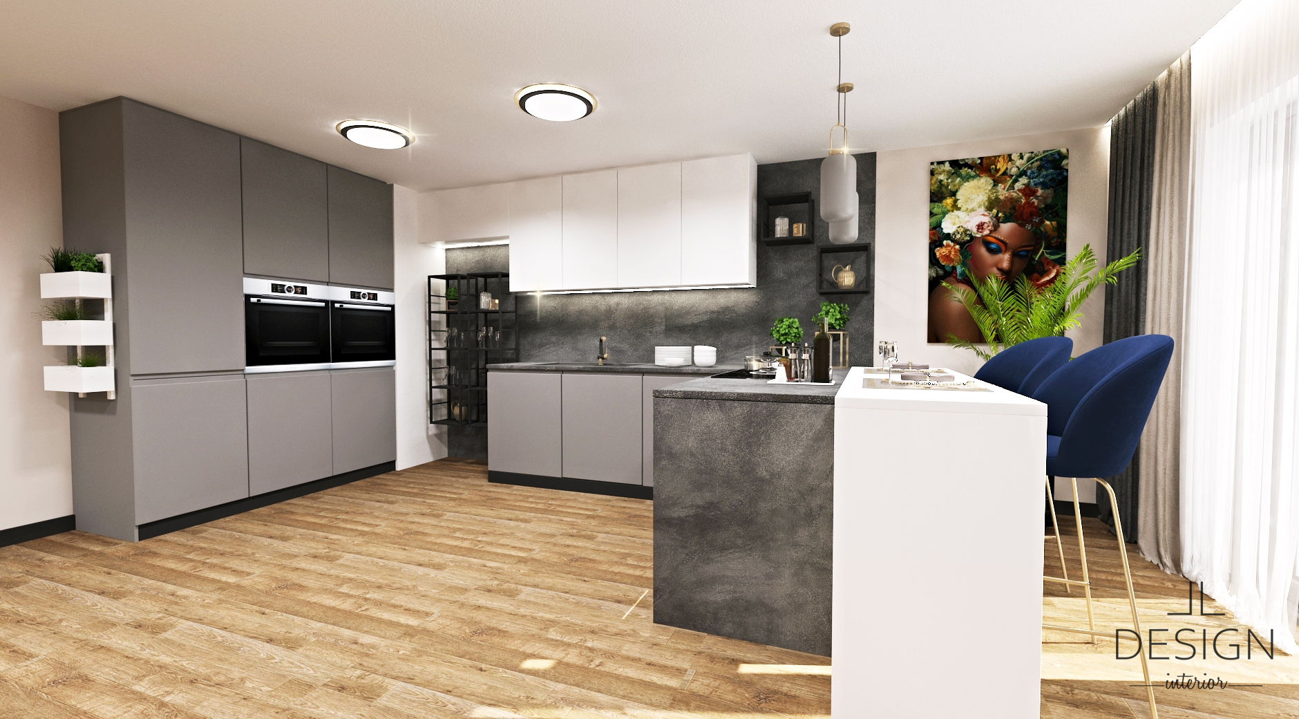 Na ostrovček je pripojený barový pult, ktorý možno využívať na rýchle stolovanie alebo ako komunikačný prvok. Často sa predsa stáva, že tie najdôležitejšie veci sa preberajú v priestoroch kuchyne pri varení. K pultu sme doplnili dizajnové barové stoličky v kráľovskej modrej na štíhlych zlatých nožičkách. Vnášame tak do kuchyne oživujúci kontrastný prvok, ktorý zároveň podporuje luxusný dojem z priestoru.