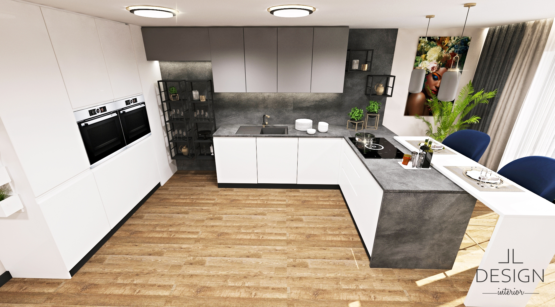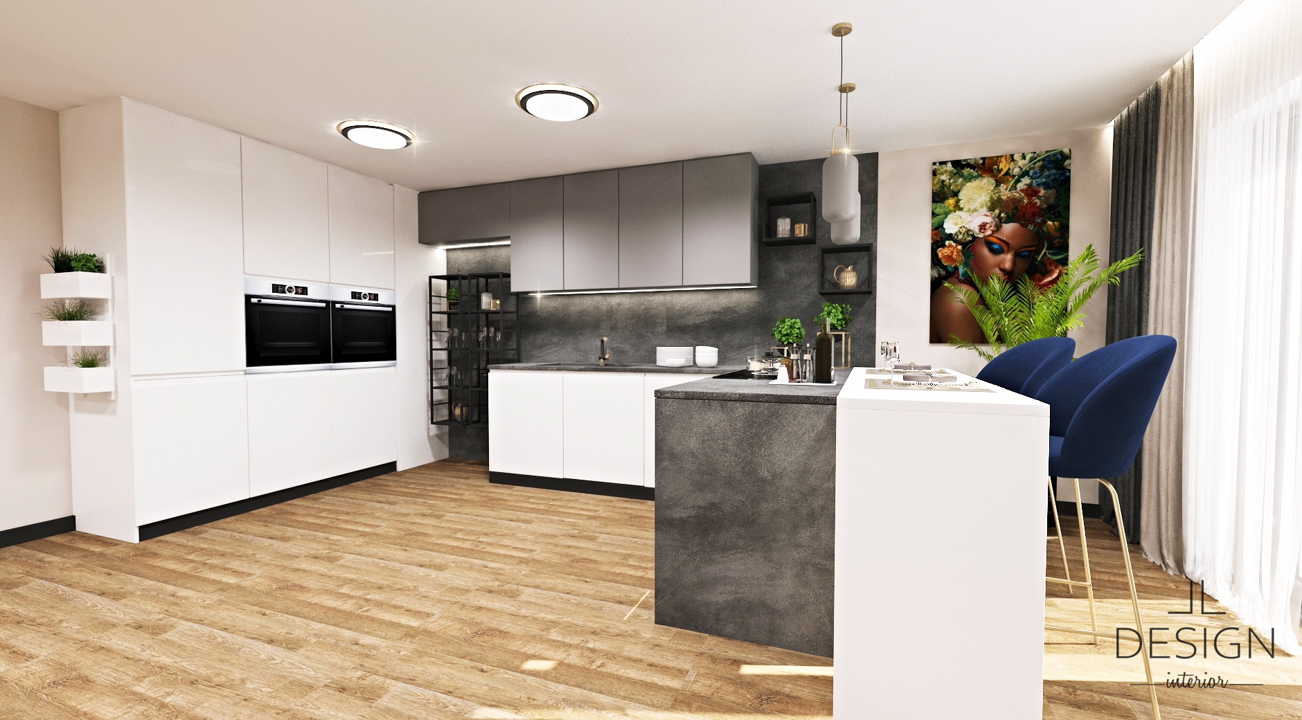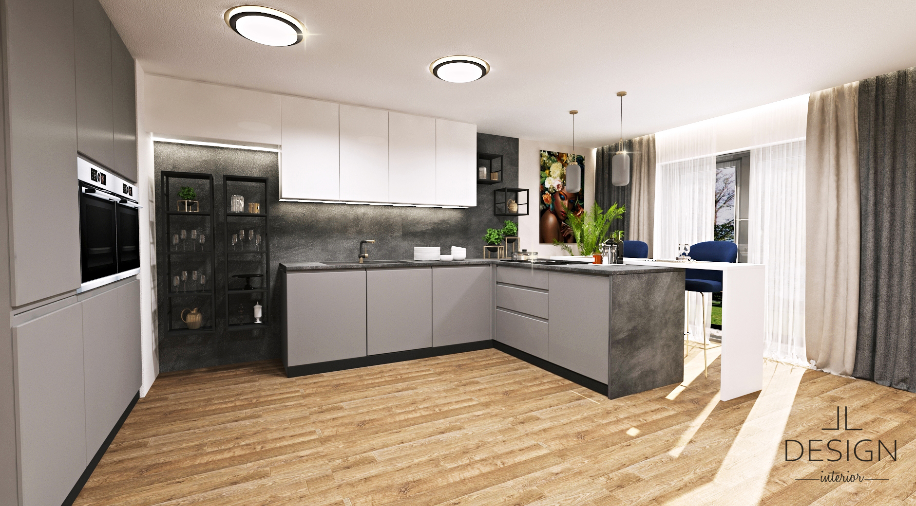 Do kuchyne sme ako doplnkovú farbu zvolili čiernu, ktorá rovnako ako biela a sivá patrí k neutrálnym odtieňom, zároveň však s nimi dobre kontrastuje a dodáva kuchyni dramatickejší nádych. Čierny sokel a kovové regály pritom ladia so vstavanými rúrami a s varnou doskou. Otvorené regály dodávajú kuchyni vzdušnejší charakter a rozbíjajú celkovú symetriu kuchynskej zostavy. Môžu poslúžiť ako praktický úložný priestor na kuchynské vybavenie, ale aj na vystavenie dekorácií, ktoré podčiarknu elegantný ráz priestoru. Ak by sa kuchyňa v takomto vyhotovení niekomu zdala príliš tmavá, môže ju zjemniť drevenou podlahou, ktorá pôsobí hrejivo a upokojujúco. Celkovo tak v priestore navodzuje určitú rovnováhu a harmóniu. Podobne aj dekorácie ako rastliny a obrazy, ktoré výrazne prispievajú k tomu, aby kuchyňa nepôsobila stroho.
