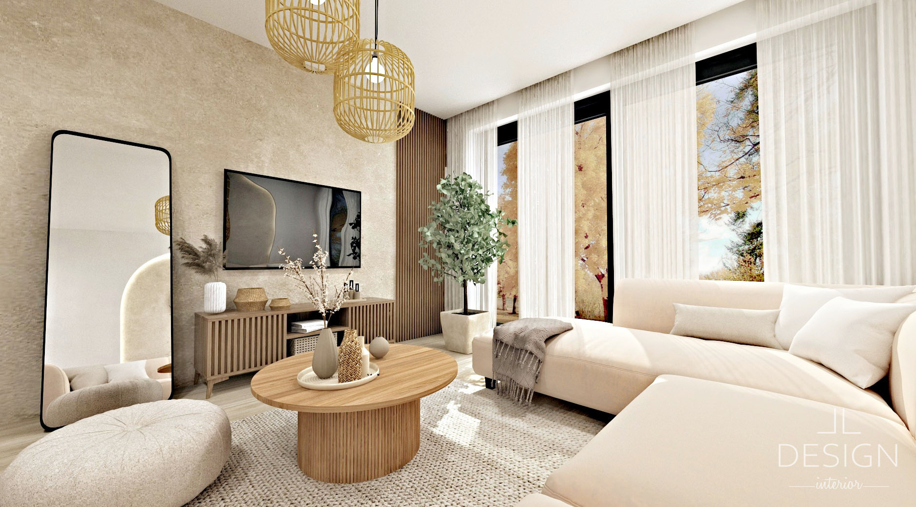 Pri výbere nábytku sa nebojte siahať po rôznych odtieňoch a štruktúrach dreva. Pri kombinovaní sa však držte hesla menej je viac. Do nášho návrhu sme vybrali úsporné nábytky na nožičkách, ktoré zároveň podporujú vzdušnosť priestoru. Aby sme zútulnili stenu, vybrali sme pod televízor štruktúrovanú komodu s úložným miestom. Stenu sme ešte doplnili dreveným lamelovým panelom, ktorý je v harmónii s komodou a dodáva priestoru prirodzenú eleganciu.