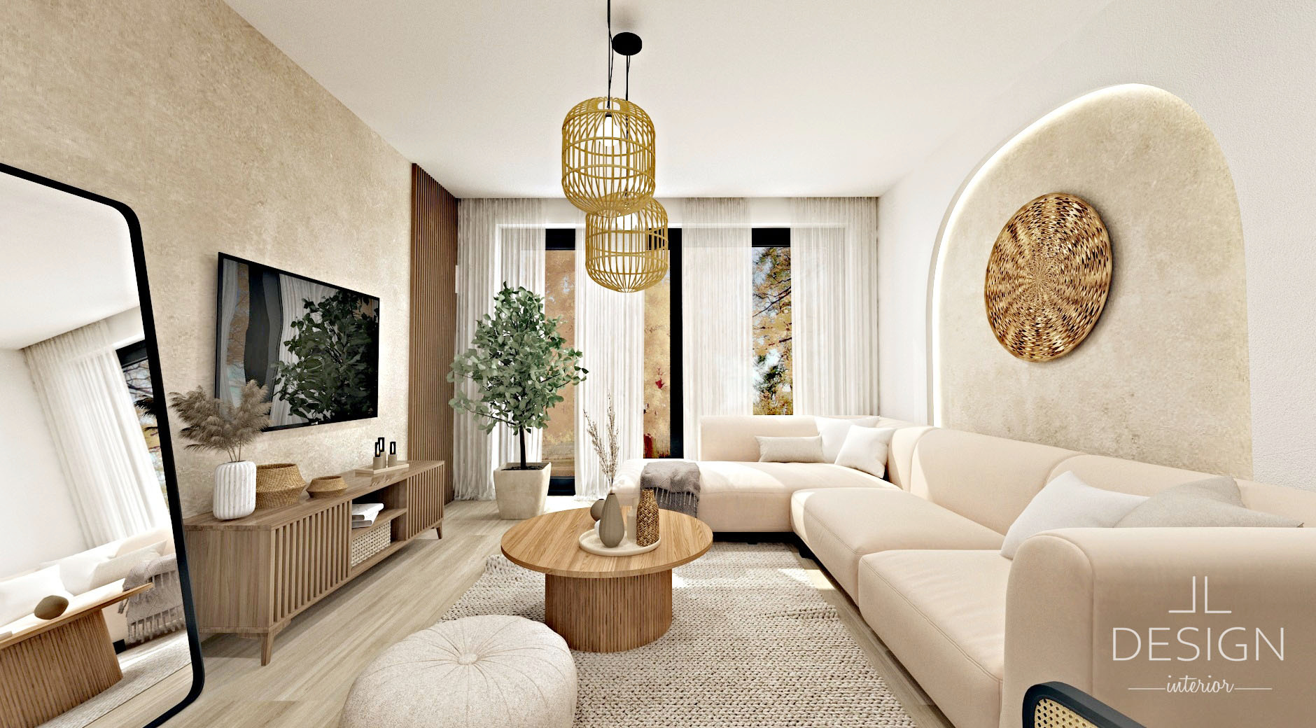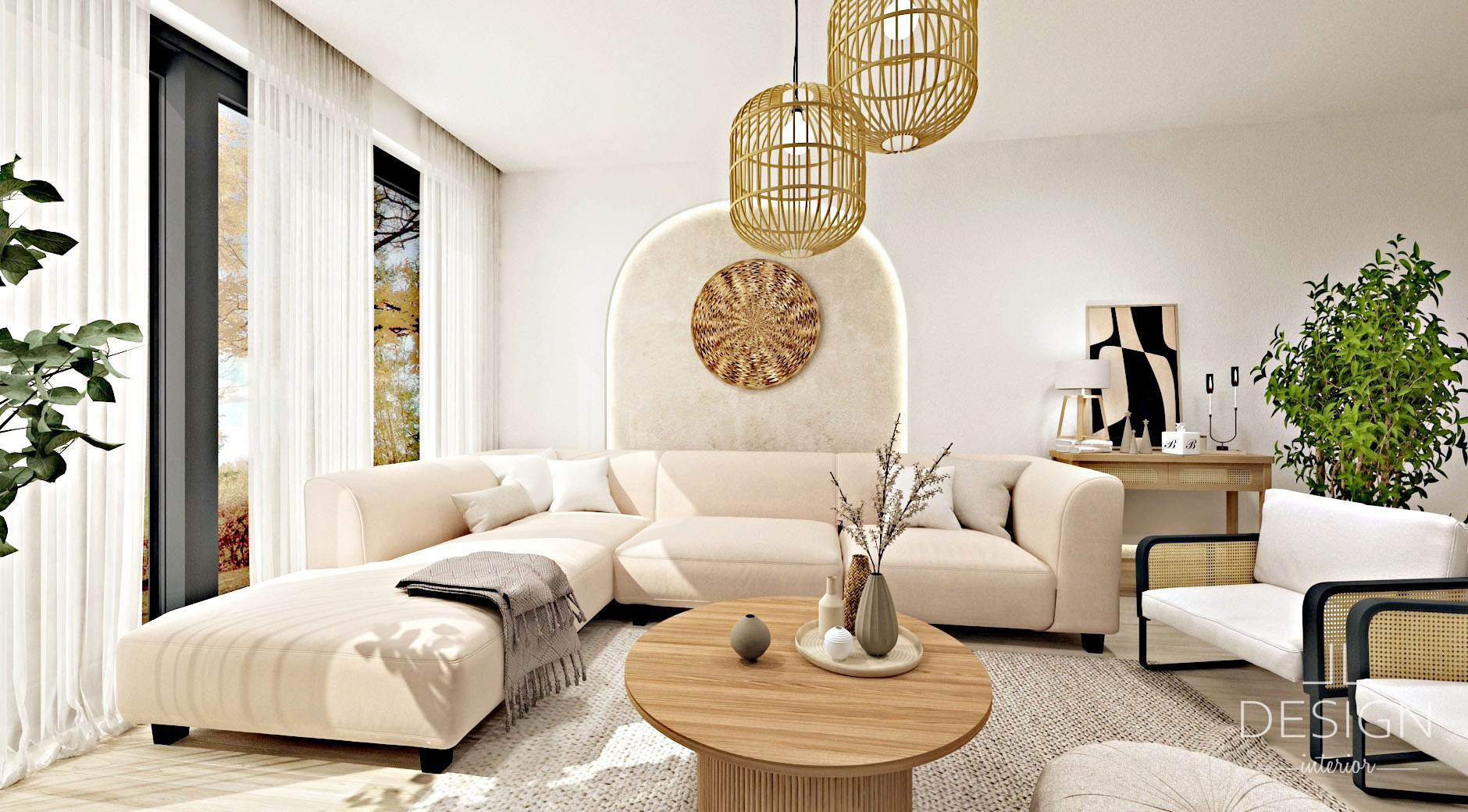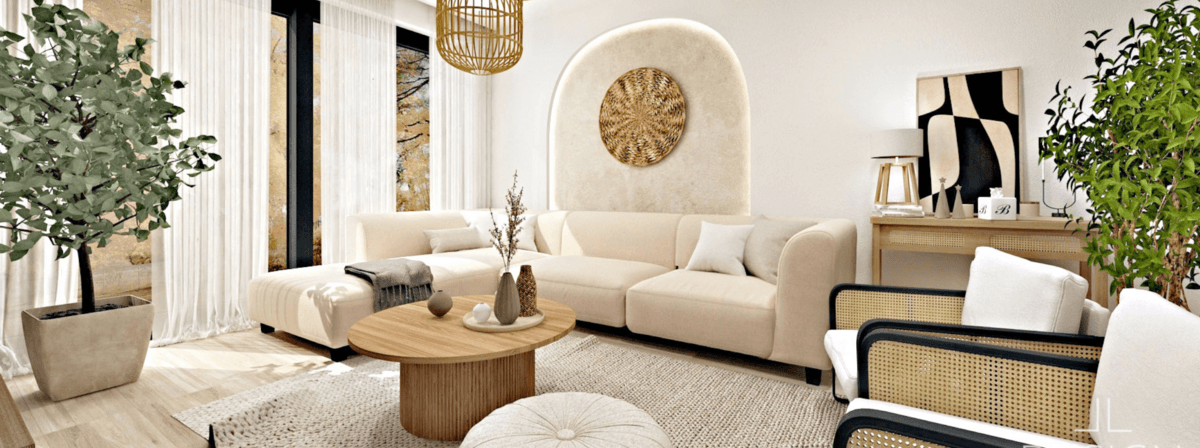 Vzhľadom na to, že škandinávsky štýl sa vyznačuje decentnými a zároveň nápaditými siluetami, do návrhu sme zakomponovali nábytok a látkovú sedačku s mäkkými oblými líniami. Elegantné oblé zakrivenia pôsobia zjemňujúco a zároveň priťahujú pozornosť. Na ozvláštnenie a celkové doladenie atmosféry je za sedačkou na stene vytvorený decentný oblúkový výrez s centrálnou závesnou dekoráciou, čo ladí s okrúhlym konferenčným stolíkom s vrúbkovanou podnožou.