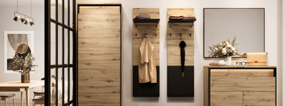 Dostatok odkladacích priestorov v predsieni je pre mnohých prioritnou požiadavkou. Vytvorte si praktickú zostavu so skriňou na kabáty, s komodou a vešiakovým panelom. Pohodlná čalúnená lavica s uzavretou skrinkou na topánky vyrieši sedenie pri prezúvaní a zároveň poskytne aj úložné miesto. Čisté línie nábytku s jemnou štruktúrou dreva pôsobia klasicky elegantne a vyniknú v moderných aj minimalistických interiéroch.