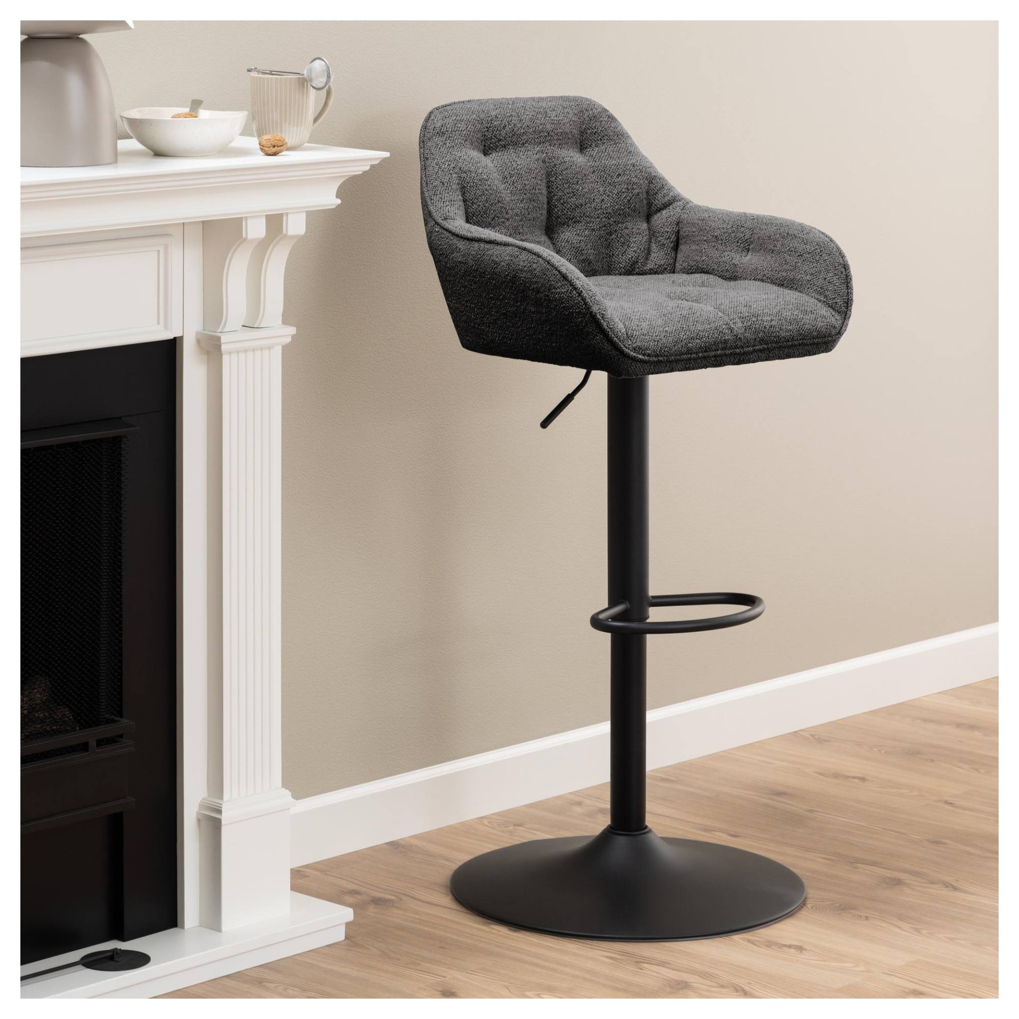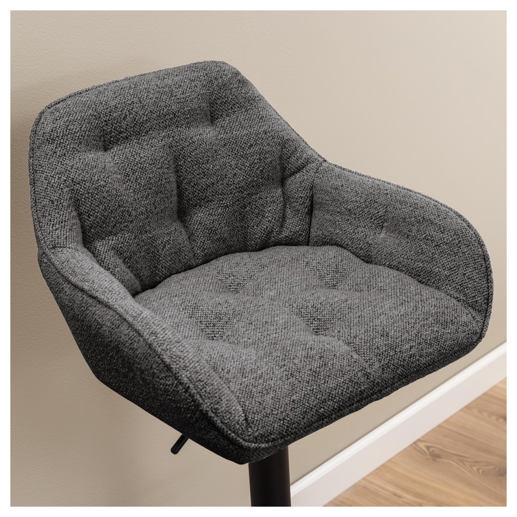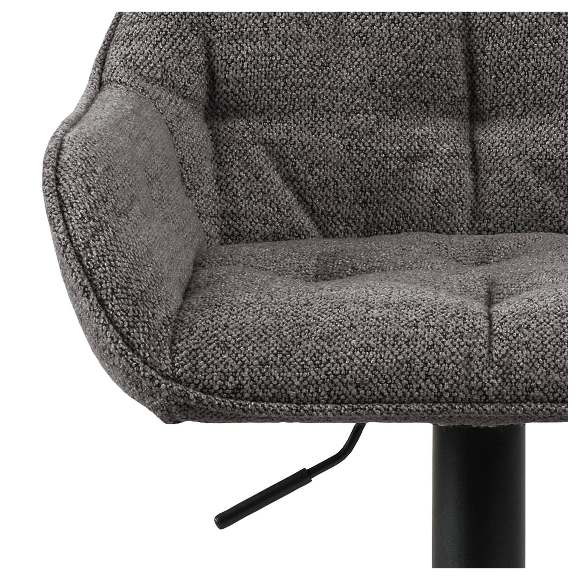Komfortné sedadlo je spolu s nižším chrbtovým operadlom a podrúčkami čalúnené látkou typu bouclé s príjemnou štruktúrou. Minimalistický vzhľad stoličky ozvláštňujú dekoratívne detaily poťahu, ktoré vytvárajú nadýchaný vzhľad. Sedacia časť je posadená na oceľovej základni, ktorá zaisťuje potrebnú stabilitu a oporu. Vybavená je opierkou na odloženie unavených nôh a komfortnejšie sedenie. Disponuje tiež otočným kĺbom a plynovým zdvihom, vďaka ktorému si môžete nastaviť výšku sedu v rozmedzí 63-84 cm a prispôsobiť tak stoličku vašim potrebám.