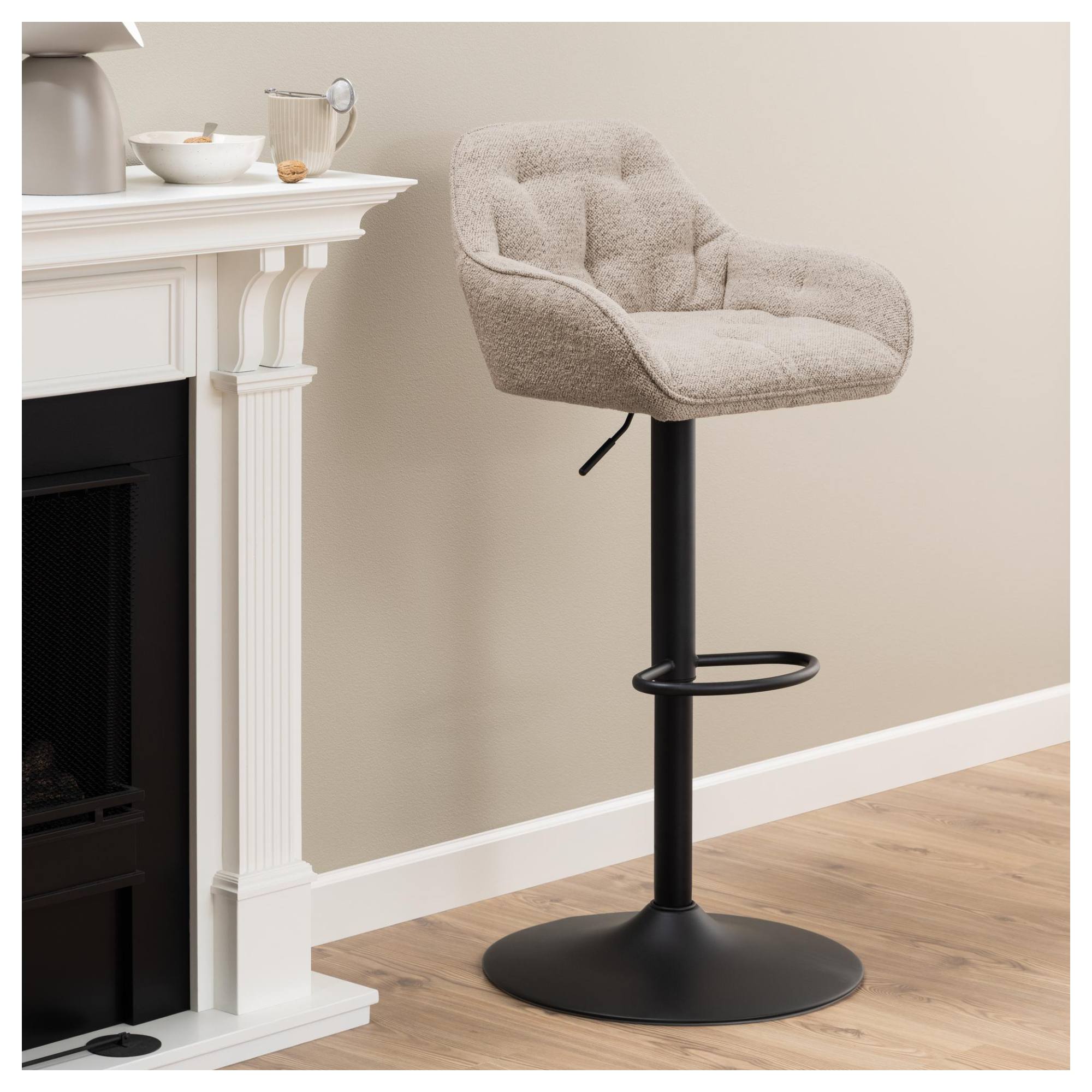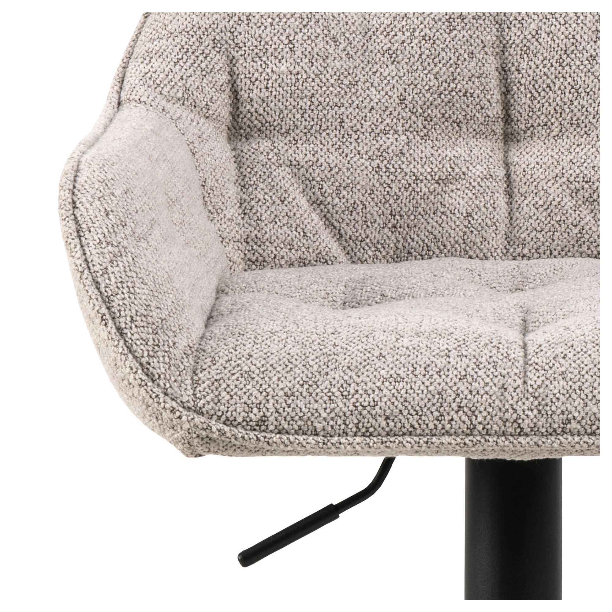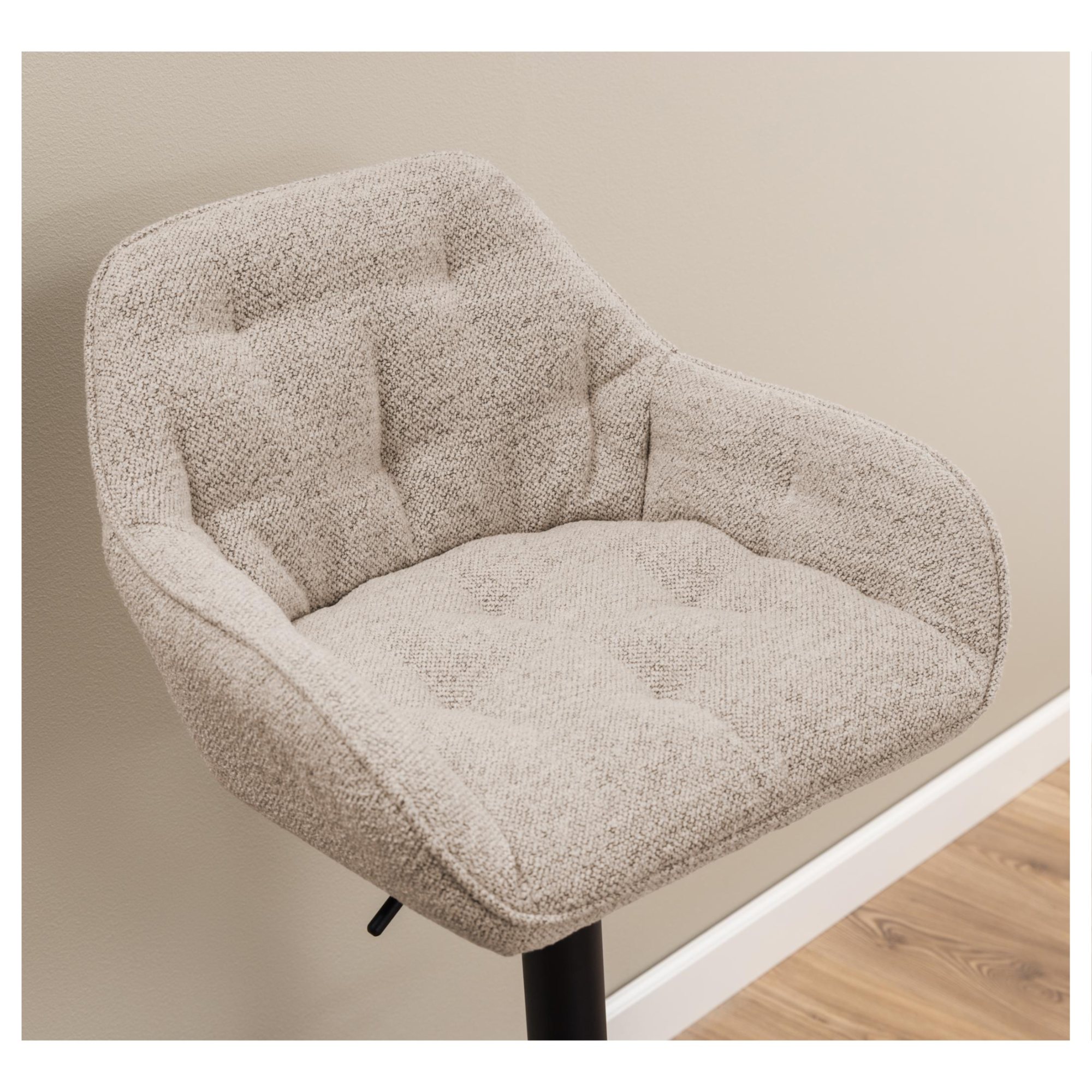 Komfortné sedadlo je spolu s nižším chrbtovým operadlom a podrúčkami čalúnené látkou typu bouclé s príjemnou štruktúrou. Minimalistický vzhľad stoličky ozvláštňujú dekoratívne detaily poťahu, ktoré vytvárajú nadýchaný vzhľad. Sedacia časť je posadená na oceľovej základni, ktorá zaisťuje potrebnú stabilitu a oporu. Vybavená je opierkou na odloženie unavených nôh a komfortnejšie sedenie. Disponuje tiež otočným kĺbom a plynovým zdvihom, vďaka ktorému si môžete nastaviť výšku sedu v rozmedzí 63-84 cm a prispôsobiť tak stoličku vašim potrebám.