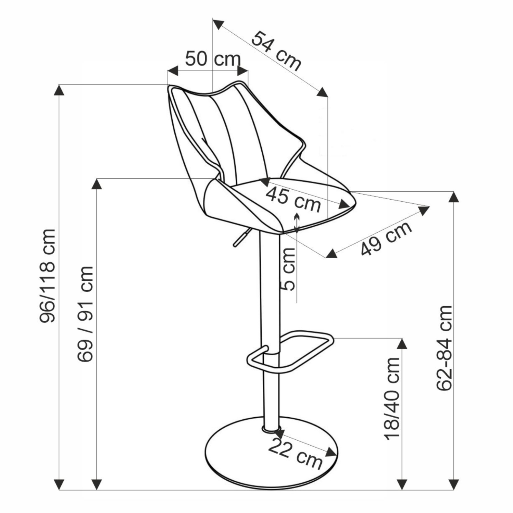 Konštrukcia tejto stoličky je vyrobená z kovu. Jej výška je nastaviteľná v rozmedzí od 96 do 118 cm, pričom výška sedu môže byť minimálne 62 a maximálne 84 cm. Aby sa na stoličke príjemne sedelo, je vybavená pohodlným penovým sedadlom potiahnutým hladkou tkaninou aj opierkou na nohy.
