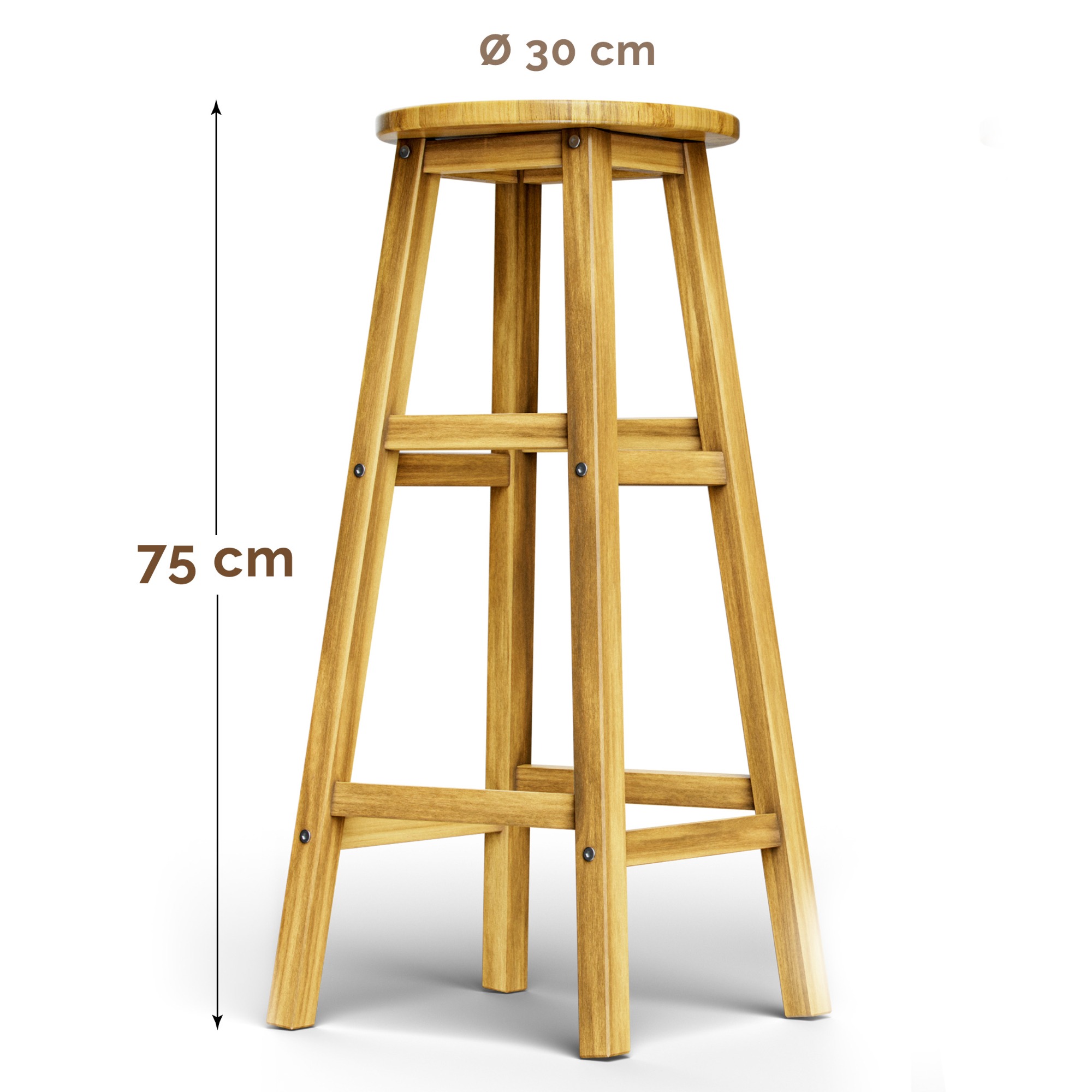 Ich konštrukcia je vyrobená z masívneho akáciového dreva. Stoličky majú ergonomicky zaoblené sedáky s priemerom 30 cm a opierky na nohy, ktoré prispievajú k pohodliu pri sedení.
