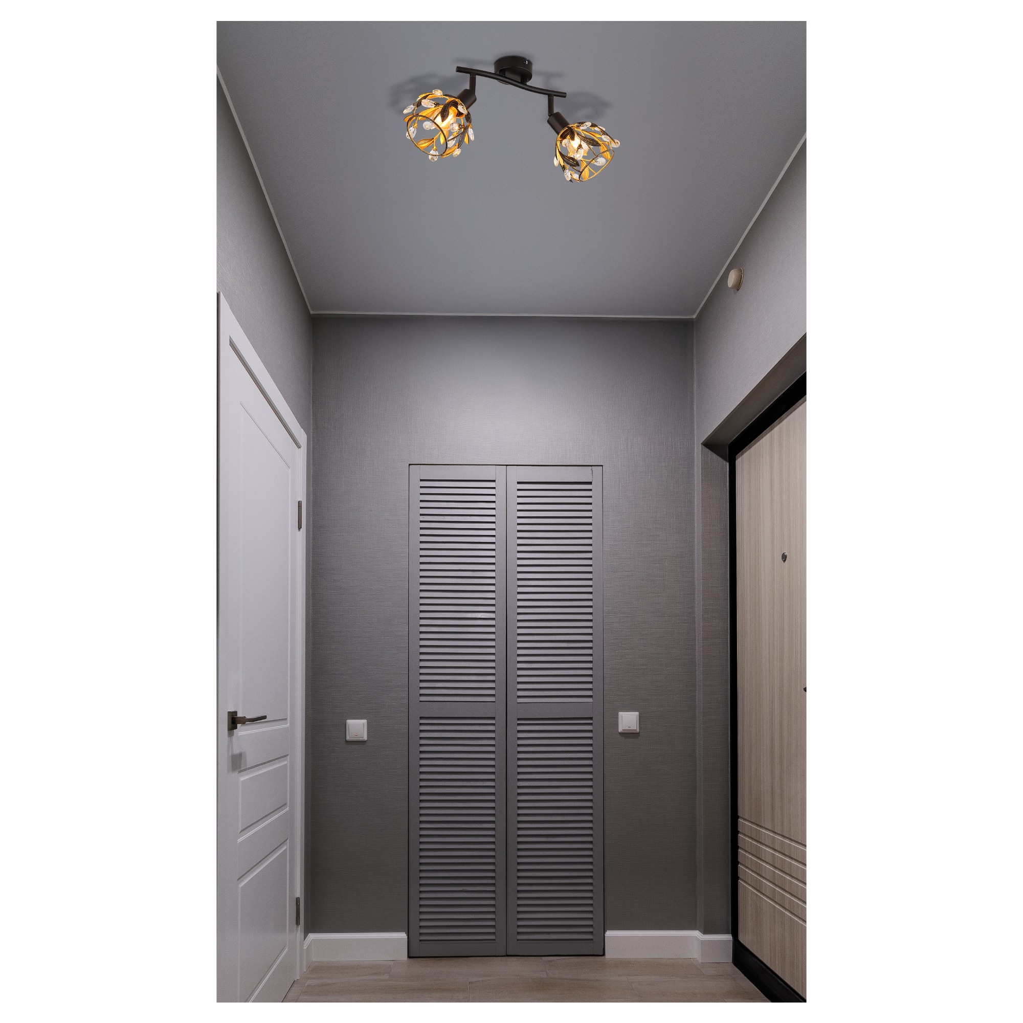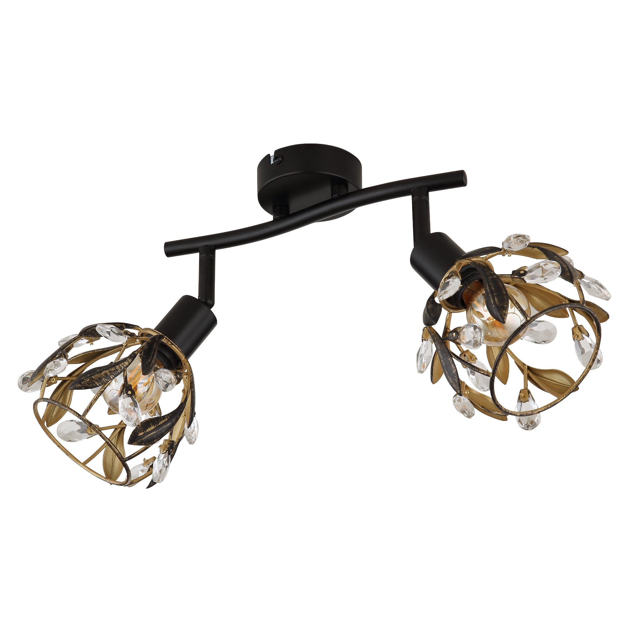 Na prvý pohľad zaujme svietidlo svojimi 2 tienidlami. Tie sa skladajú z kovových lístkov v zlatej farbe s čiernou patinou. Lístky sú doplnené o akrylové kryštály, ktoré vďaka prenikajúcemu svetlu vytvárajú zaujímavé svetelné efekty. Tienidlá sú vybavené pohyblivými kĺbmi, ktoré umožňujú nastavenie svetla podľa vašich potrieb. Sú uchytené na jednoduchej kovovej konštrukcii so šírkou 25 cm.
