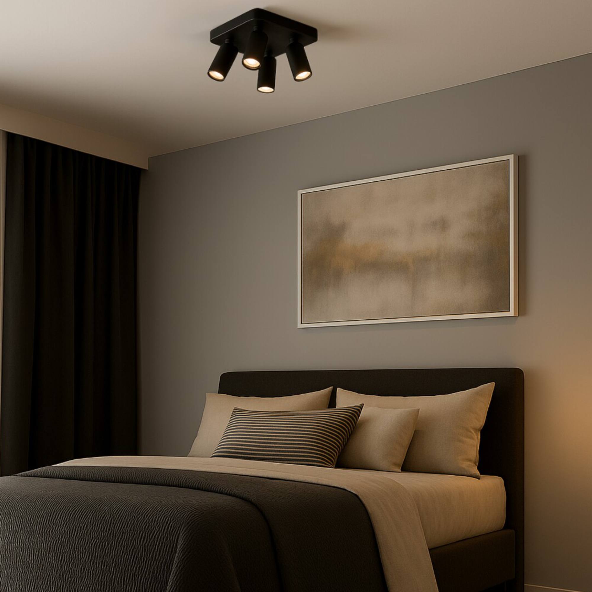 Má kovovú konštrukciu v štvorcovom tvare so šírkou 22 cm. Je vybavené 4 tienidlami z plastu, ktoré sú opatrené pohyblivými kĺbmi. Tie umožňujú nastavenie svetla podľa vašich potrieb. Vďaka tejto funkcii je skvelým spoločníkom do spálne, obývacej izby, jedálne aj pracovne.