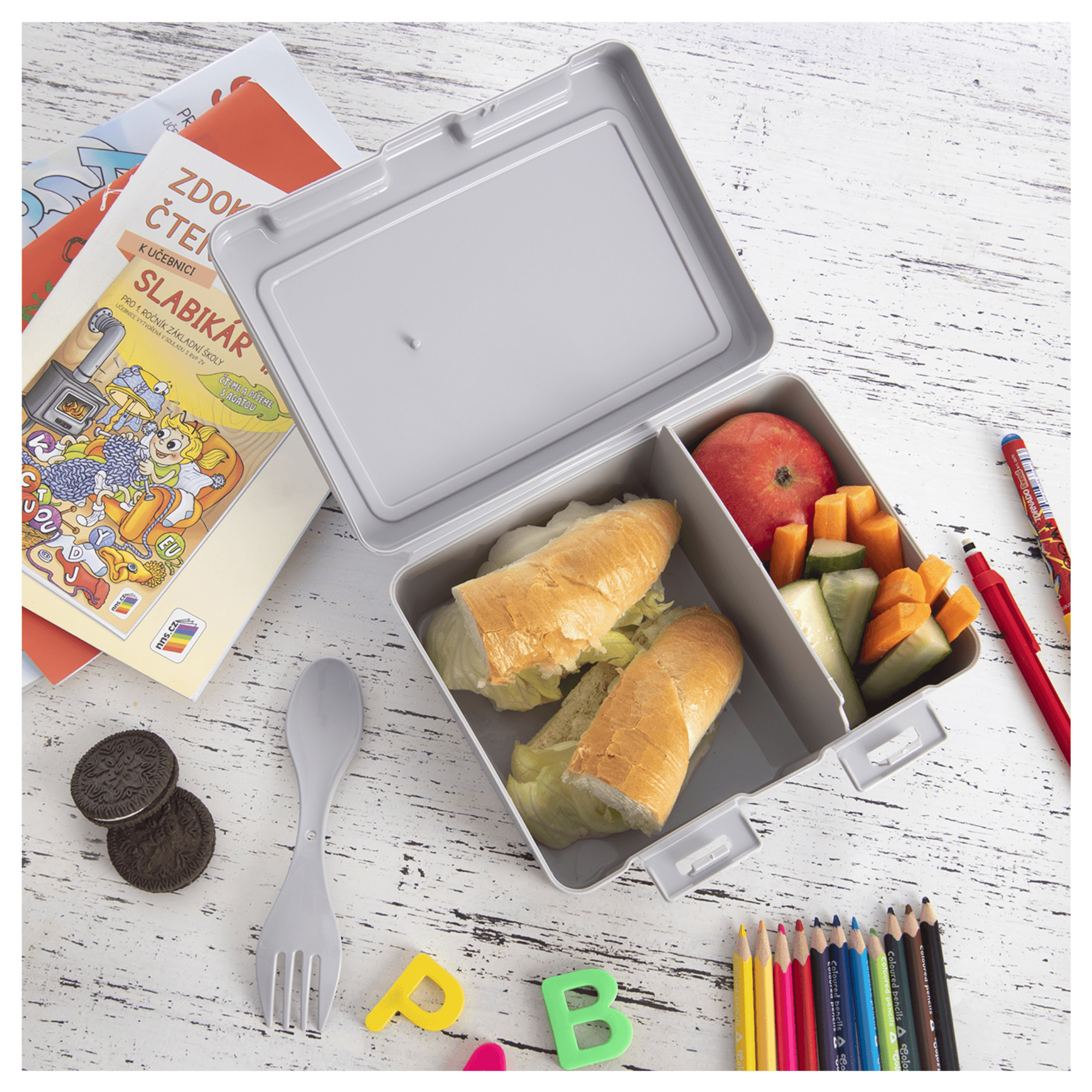 Uzatvárateľný box na desiatu LUNCH s 2 klipsami je praktickým pomocníkom, ktorý využijete na prepravu desiaty či obeda. Vyrobený je z pevného a odolného plastu s detským motívom. Vnútorný priestor sa skladá z 2 samostatných priehradiek, kam môžete uložiť potraviny oddelene. Súčasťou je aj malá lyžička s vidličkou na druhom konci.