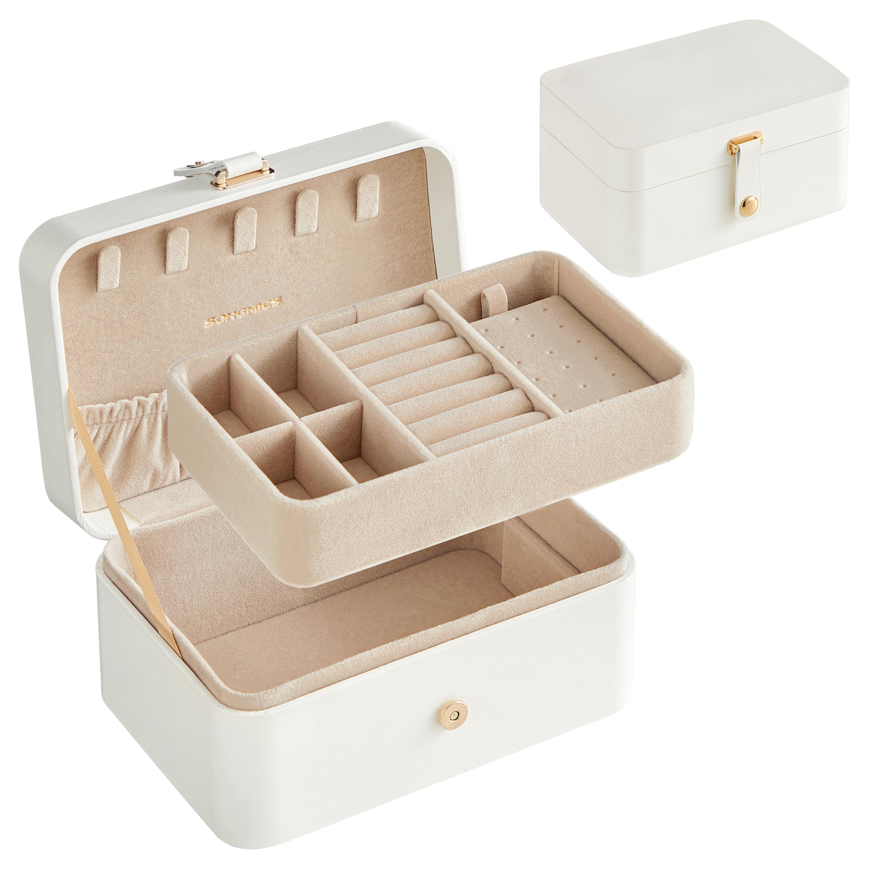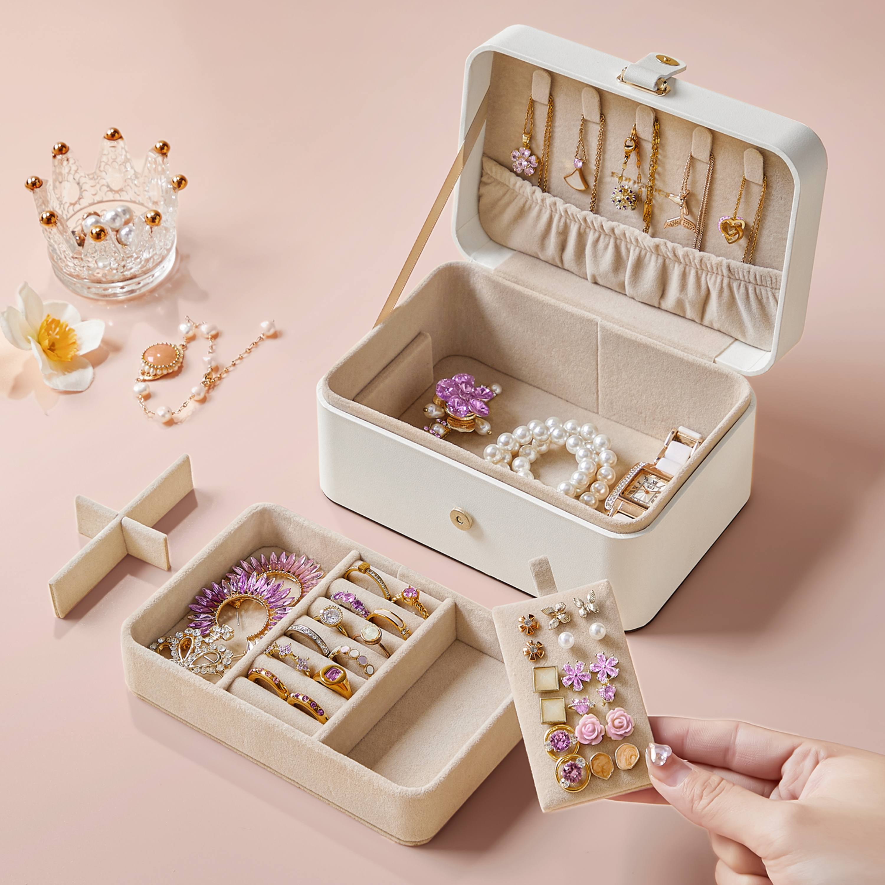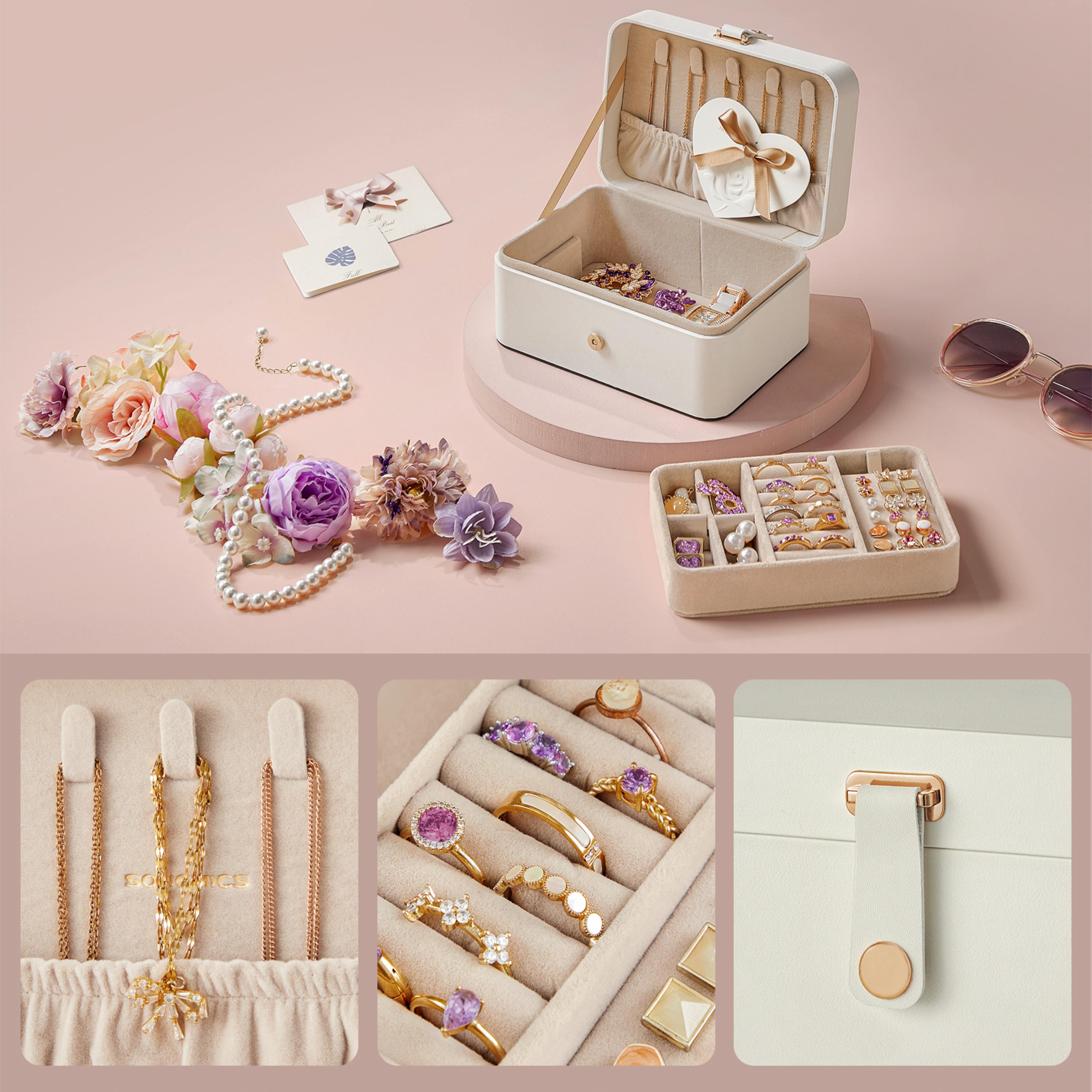 Nájdete tu prepážky, praktické priehradky na prstene, vyhradený priestor na náhrdelníky a hodinky. Vďaka tomu zostanú všetky vaše šperky na svojom mieste, bez zamotania, poškodenia alebo poškriabania, aj počas dlhých a náročných ciest.