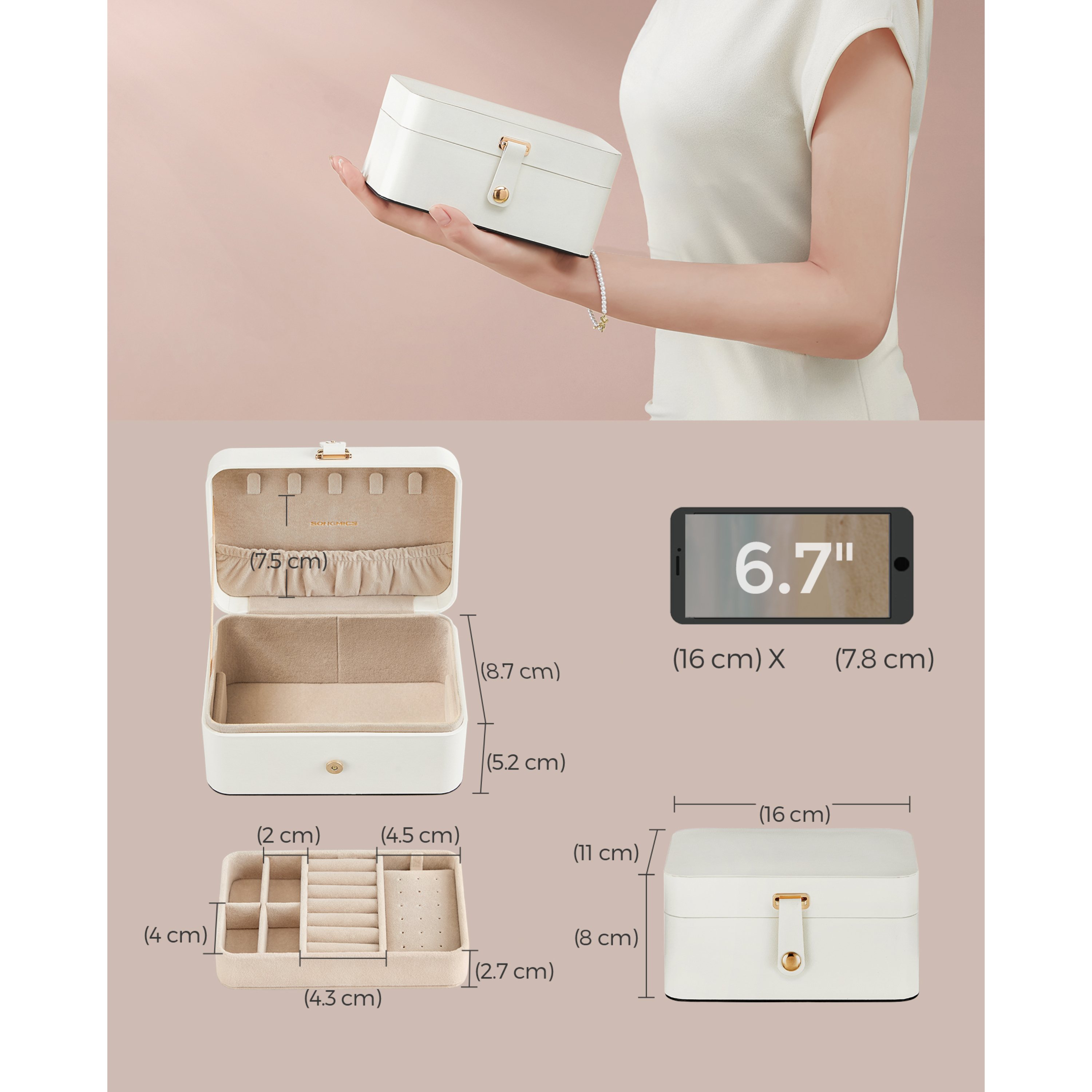 Vďaka kompaktným rozmerom sa ľahko zmestí do kabelky, tašky alebo kufra bez toho, aby zaberala príliš veľa miesta. Vnútorný priestor je vybavený podšívkou so zamatovým vzhľadom príjemnou na dotyk.