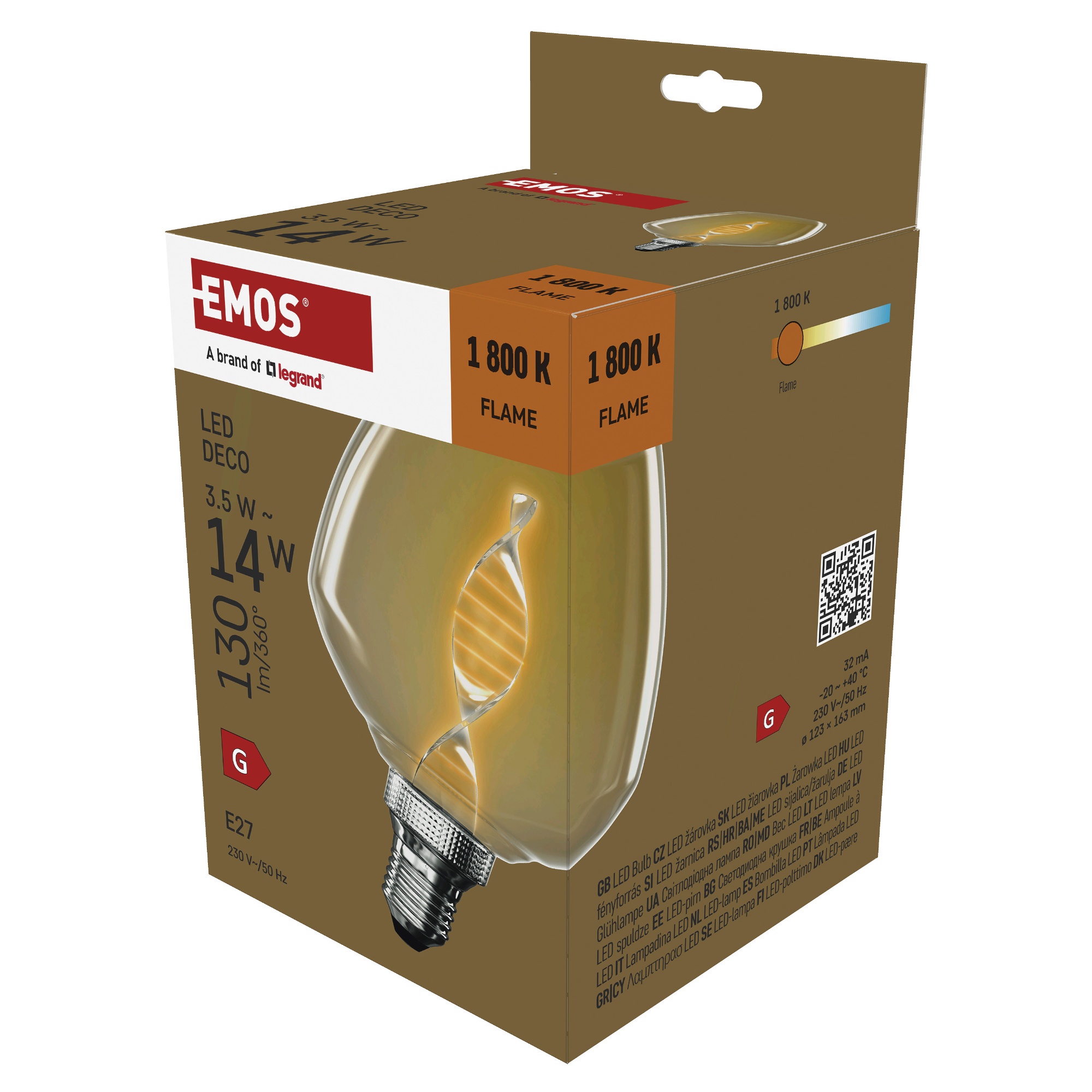 Disponuje objímkou E27 s maximálnym príkonom 3,5 W. Má svetelný tok 130 lumenov s teplotou svetla 1800 Kelvinov, ktorá vyžaruje extra teplé biele svetlo pripomínajúce plameň ohňa. Toto jemné svetlo je ideálne do spálne, obývačky alebo do barov a reštaurácií na vytvorenie romantickej atmosféry. Výhodnou vlastnosťou žiarovky je jej životnosť, ktorá poskytuje až 25 000 hodín osvetlenia.