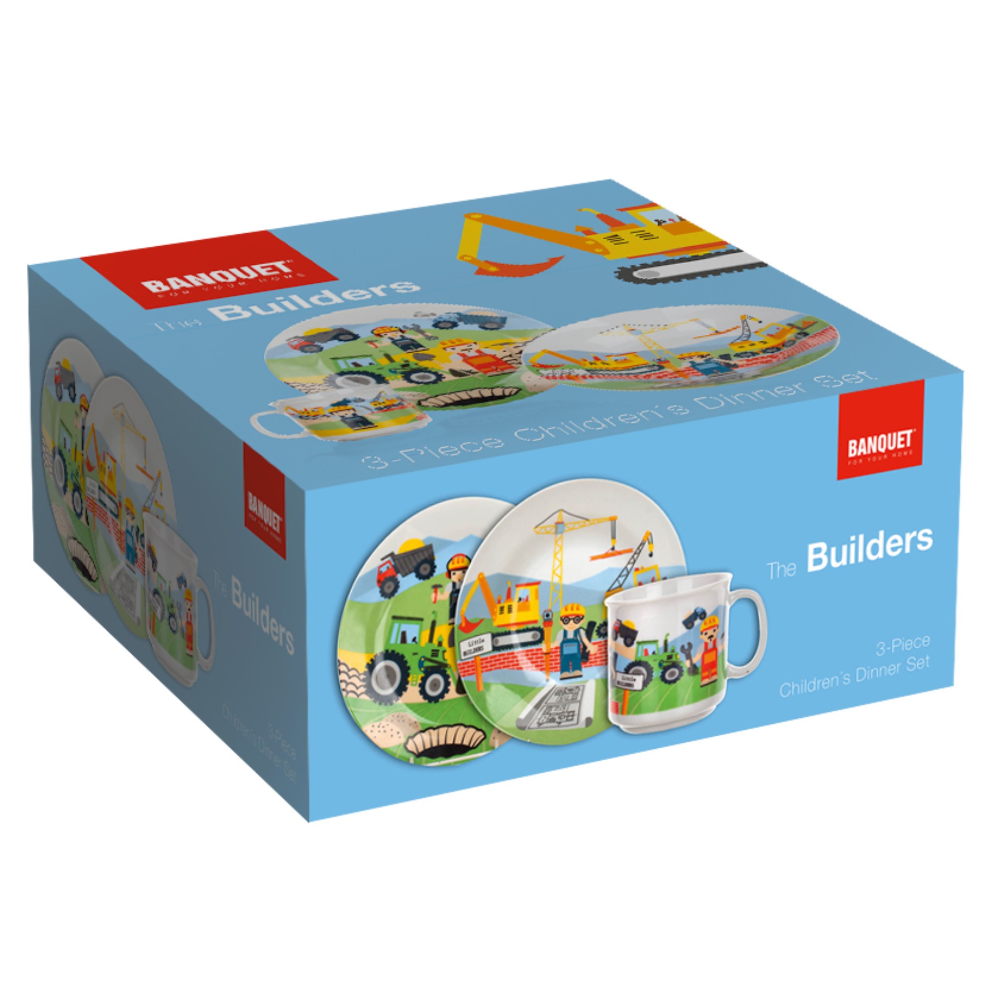 Sada obsahuje hrnček s objemom 210 ml, plytký tanier a hlboký tanier s priemerom 20 cm. Je vyrobená z keramiky, ktorá sa vyznačuje dobrou kvalitou a dlhou životnosťou. Súprava je zdobená farebnými obrázkami robotníkov na stavbe, vďaka ktorým bude jedlo hneď lepšie chutiť. Farebný riad navyše upúta pozornosť dieťaťa a spríjemní každodenné stolovanie.