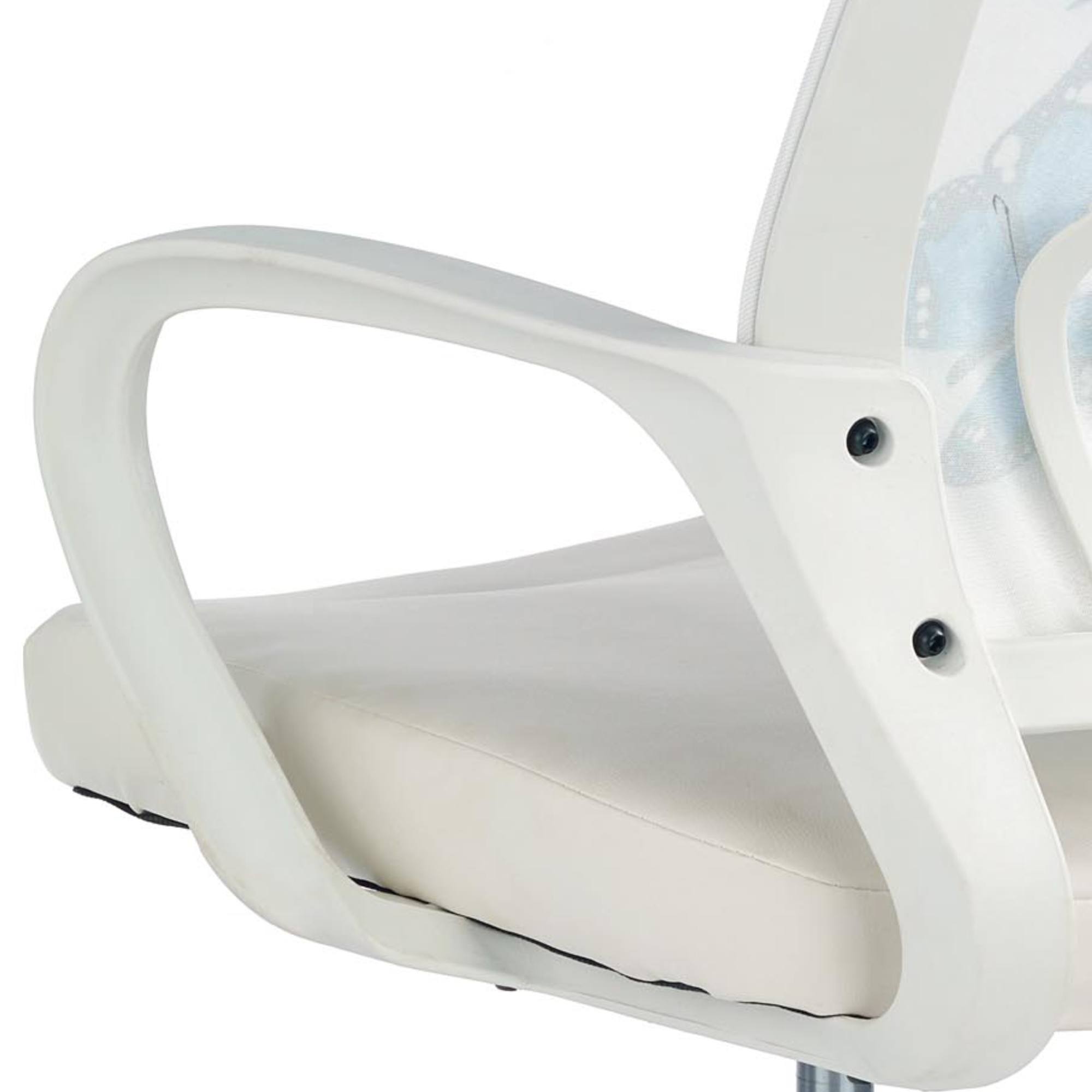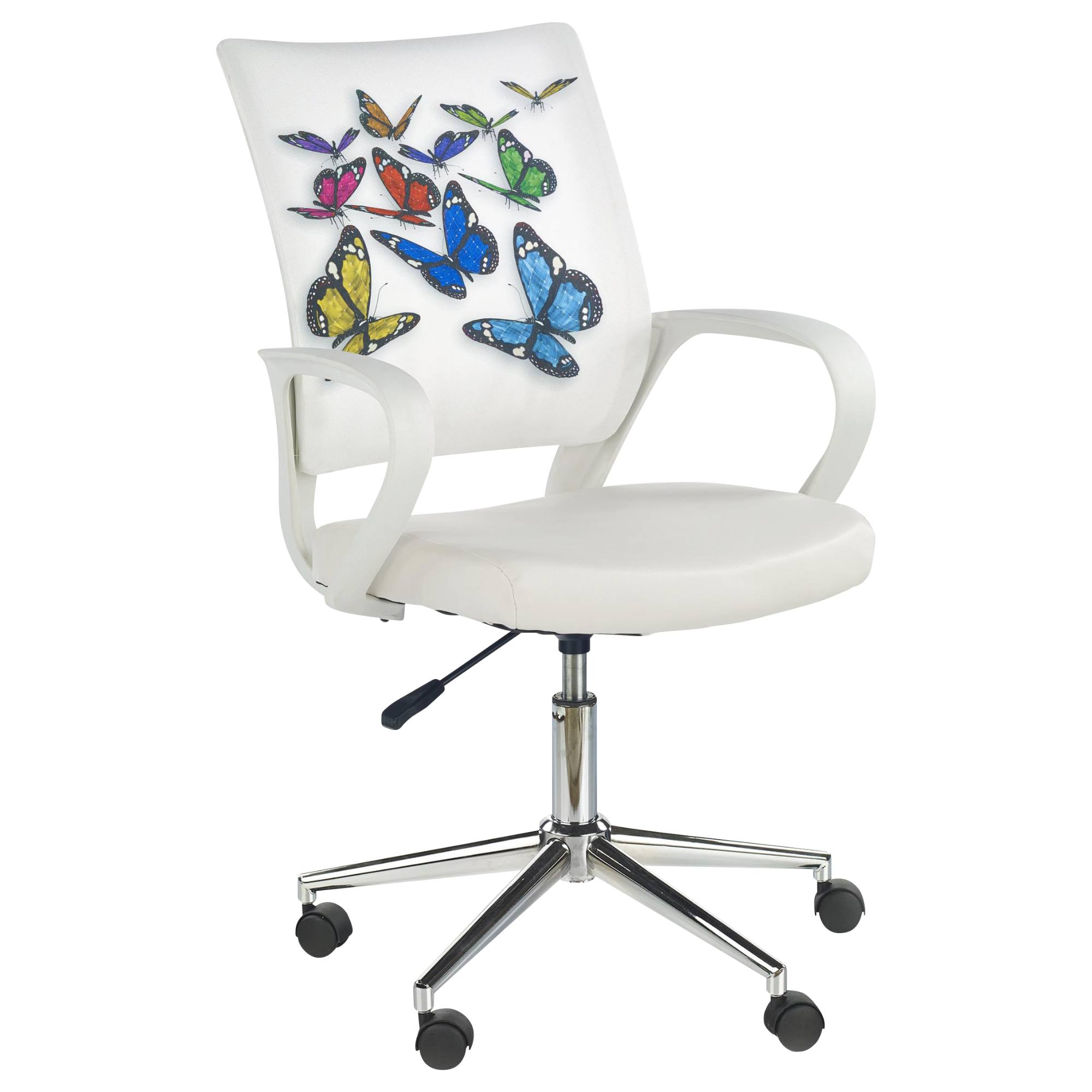 Moderná stolička CINTIA 1 poslúži ako komfortné sedenie do každej študentskej či detskej izby. Vyniká tu motív motýľov v oblasti operadla, čo pôsobí atraktívnym dojmom. Hladká tkanina navyše zvyšuje celkový komfort pri opieraní. Mäkké sedadlo s poťahom z ekokože zaručuje príjemné sedenie počas dlhých hodín strávených za písacím stolom. Stoličku je možné výškovo nastaviť, stabilitu zase zaisťuje strieborný päťramenný kríž. Maximálna nosnosť až 100 kg.