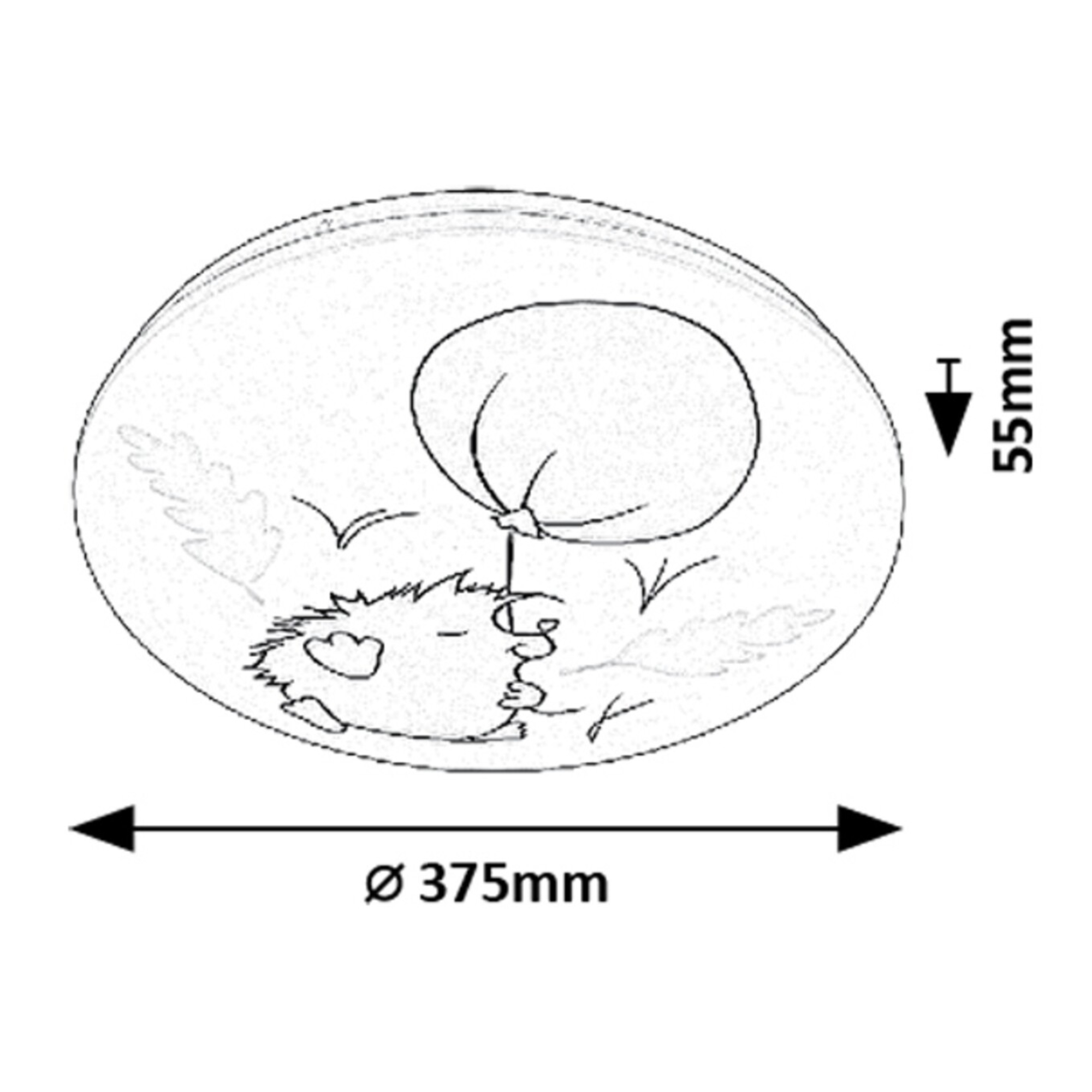 Svietidlo je okrúhleho tvaru s veselým motívom ježka s balónikom a dubovým lístím. Ilustrácia krásne vyniká, vďaka bielemu plastovému tienidlu, ktoré rovnomerne rozprestiera svetlo po miestnosti. Prichytené je kovovou konštrukciou, ktorá zaisťuje bezpečnosť.