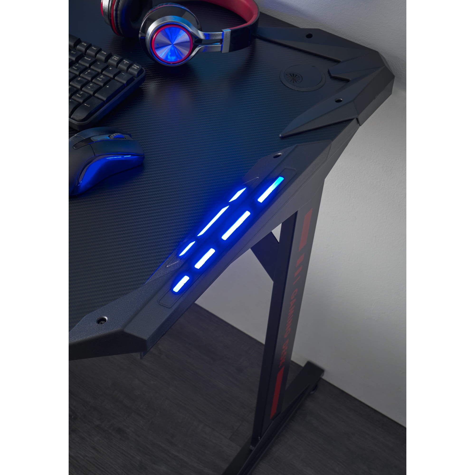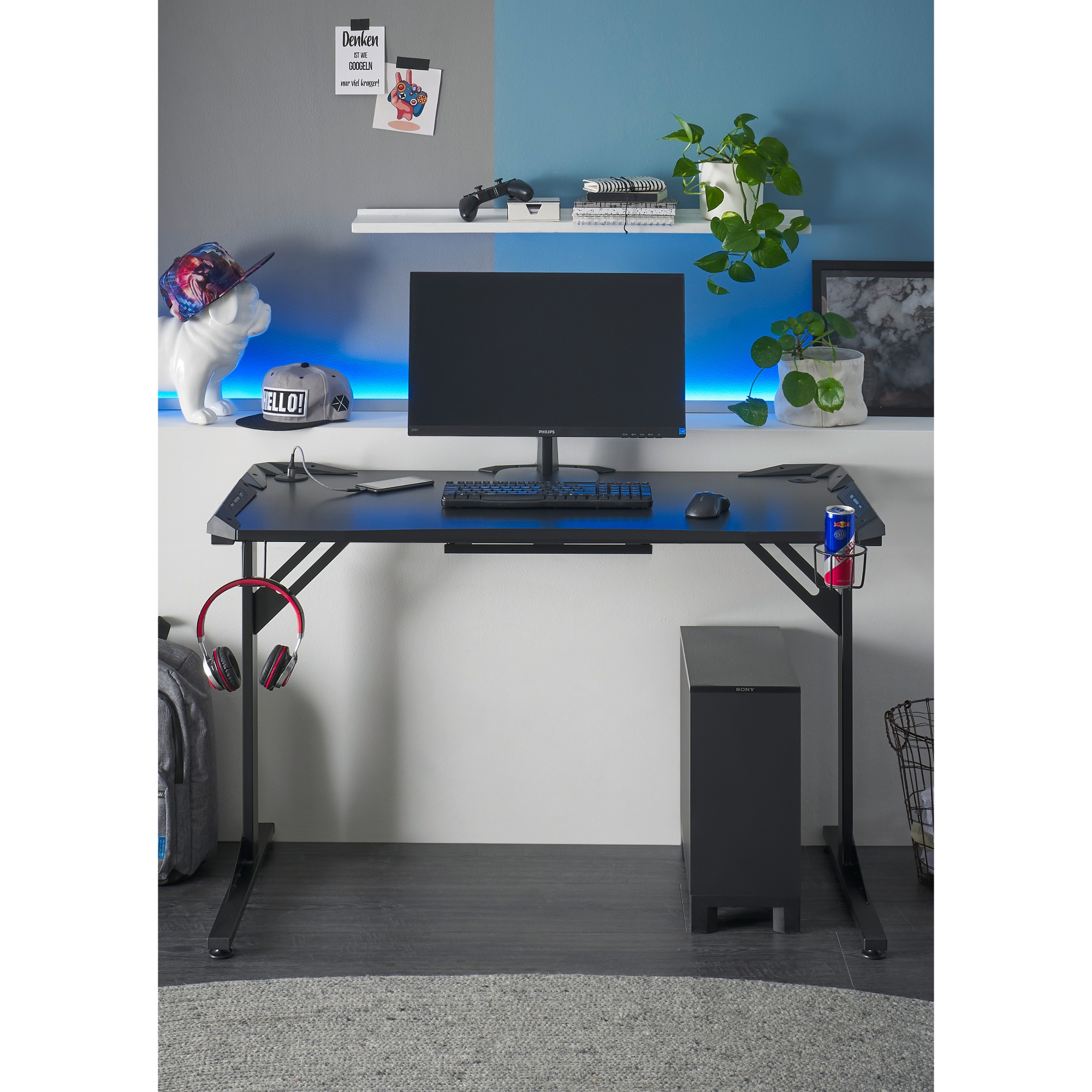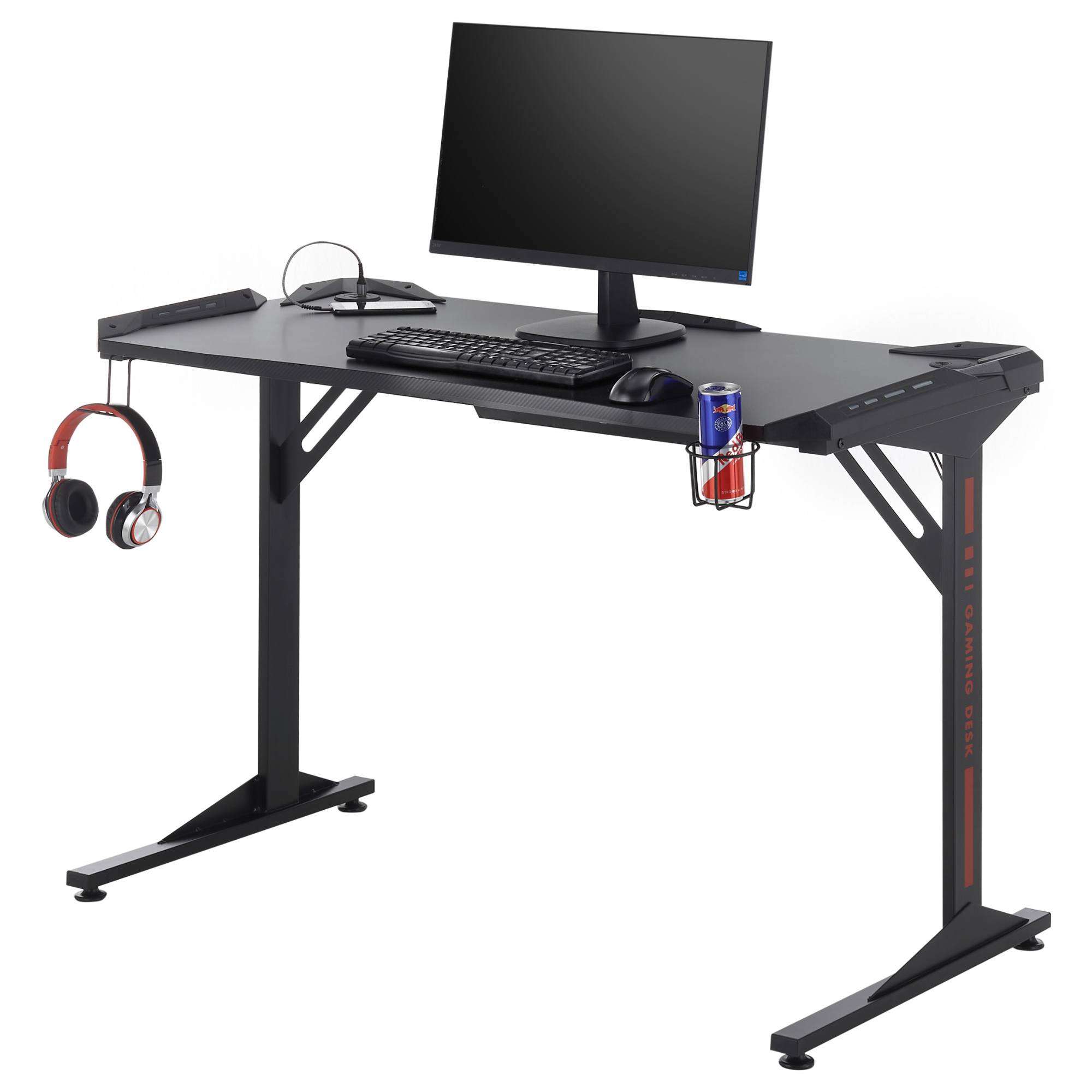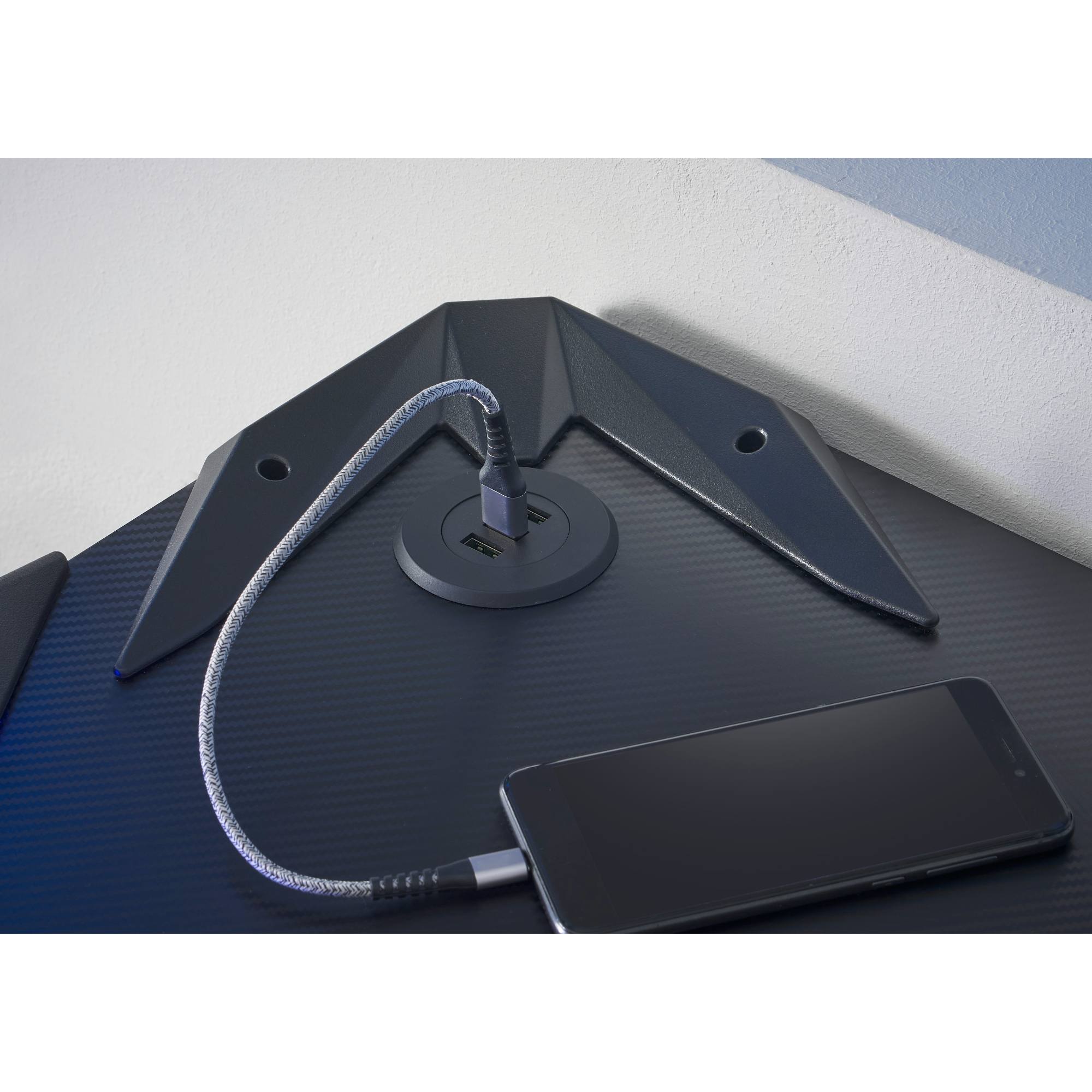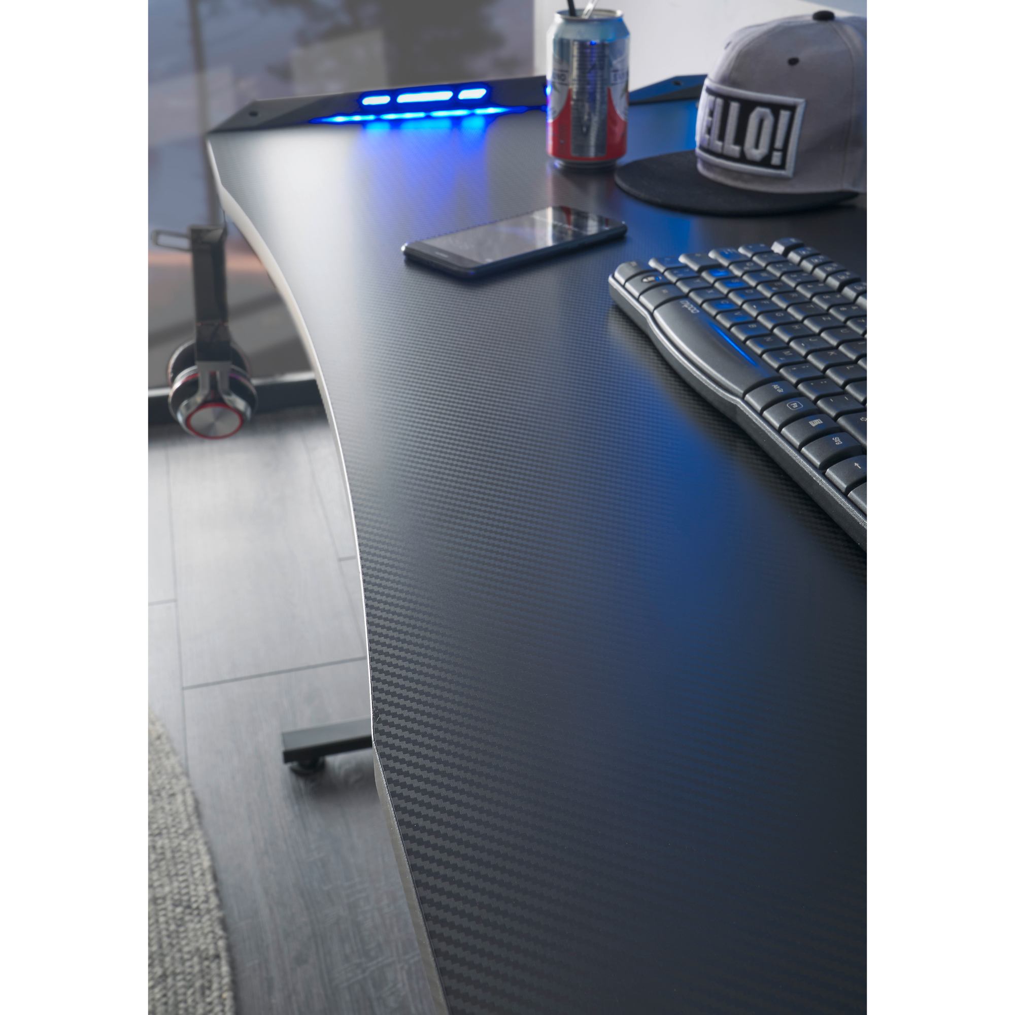 Pracovná doska s karbónovým vzhľadom disponuje dostatočným priestorom na jeden monitor. Bočný otvor vám uľahčí zapojenie káblov. Obsahuje tiež USB hub na nabíjanie telefónu a držiaky na slúchadlá a na pitie. Dosku podopierajú dve štýlové nohy z kovového materiálu.