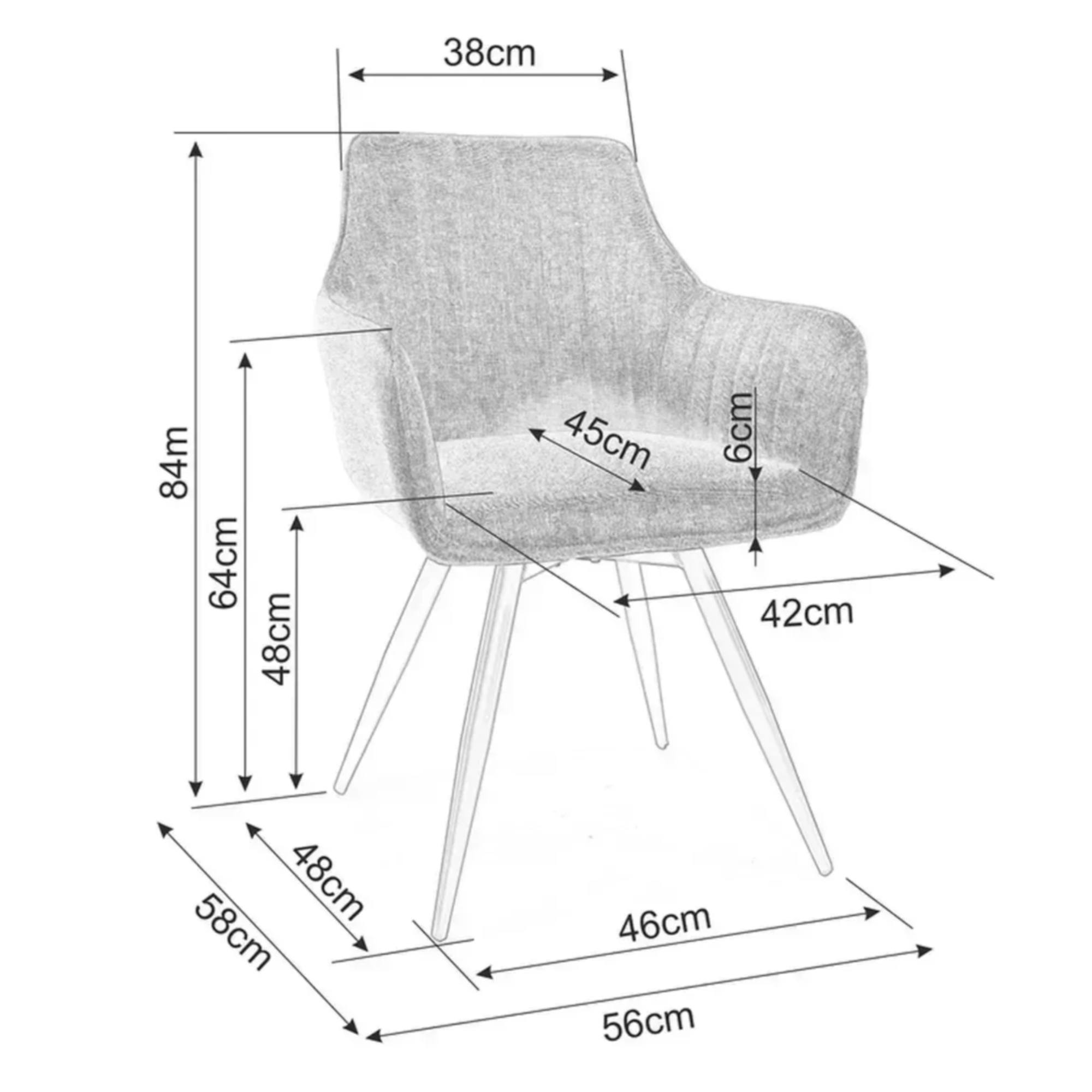 Sedák je spoločne s chrbtovou opierkou potiahnutý na dotyk príjemnou hladkou tkaninou. Čalúnenie je doplnené o dekoratívne prešívanie vytvárajúce luxusnejší vzhľad. Maximálne pohodlie počas sedenia je podporené ** mäkkou penovou výplňou ** a ** podrúčkami **. Sedaciu časť podopiera štvorica nôh z matného kovu.