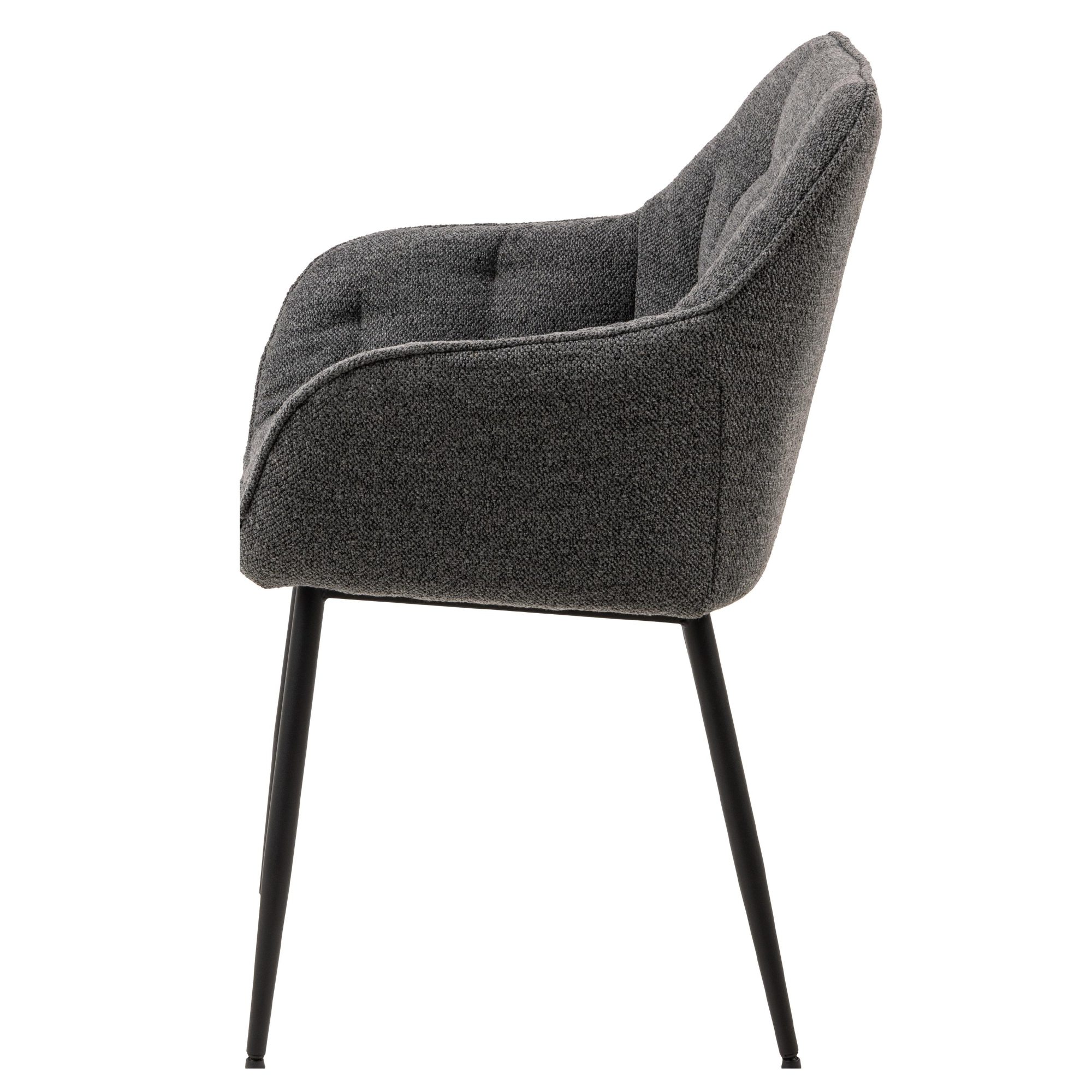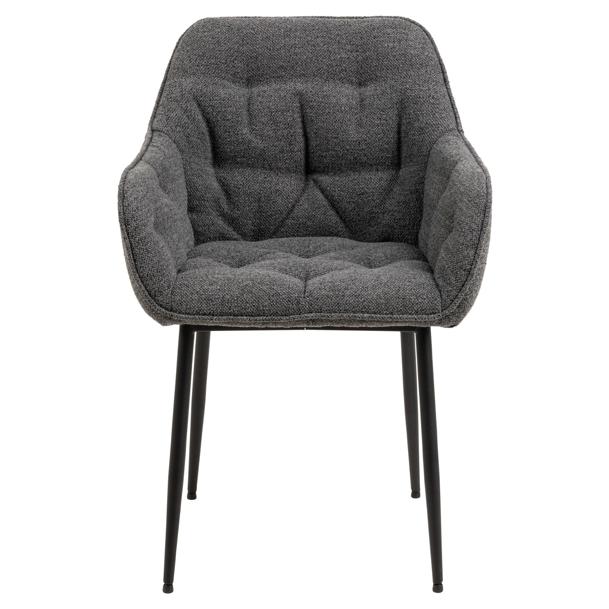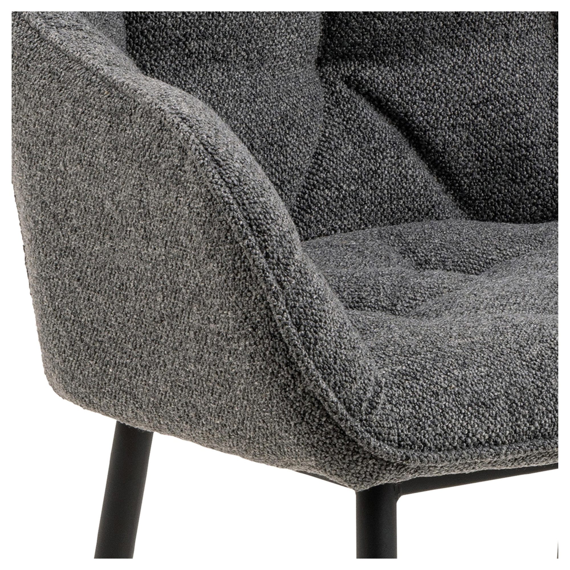 Komfort zaisťuje mäkká, penová výplň sedadla a chrbtovej opierky a na odloženie unavených rúk slúžia praktické podrúčky. Celá škrupina je čalúnená tkaninou v jednofarebnom vyhotovení s na dotyk príjemným povrchom. Minimalistický vzhľad stoličky ozvláštňujú dekoratívne detaily poťahu, ktoré vytvárajú nadýchaný dojem. Pevnosť a stabilitu stoličky zaisťuje štvornohá podnož z práškovo lakovaného kovu vyhotovená v čiernom mate.
