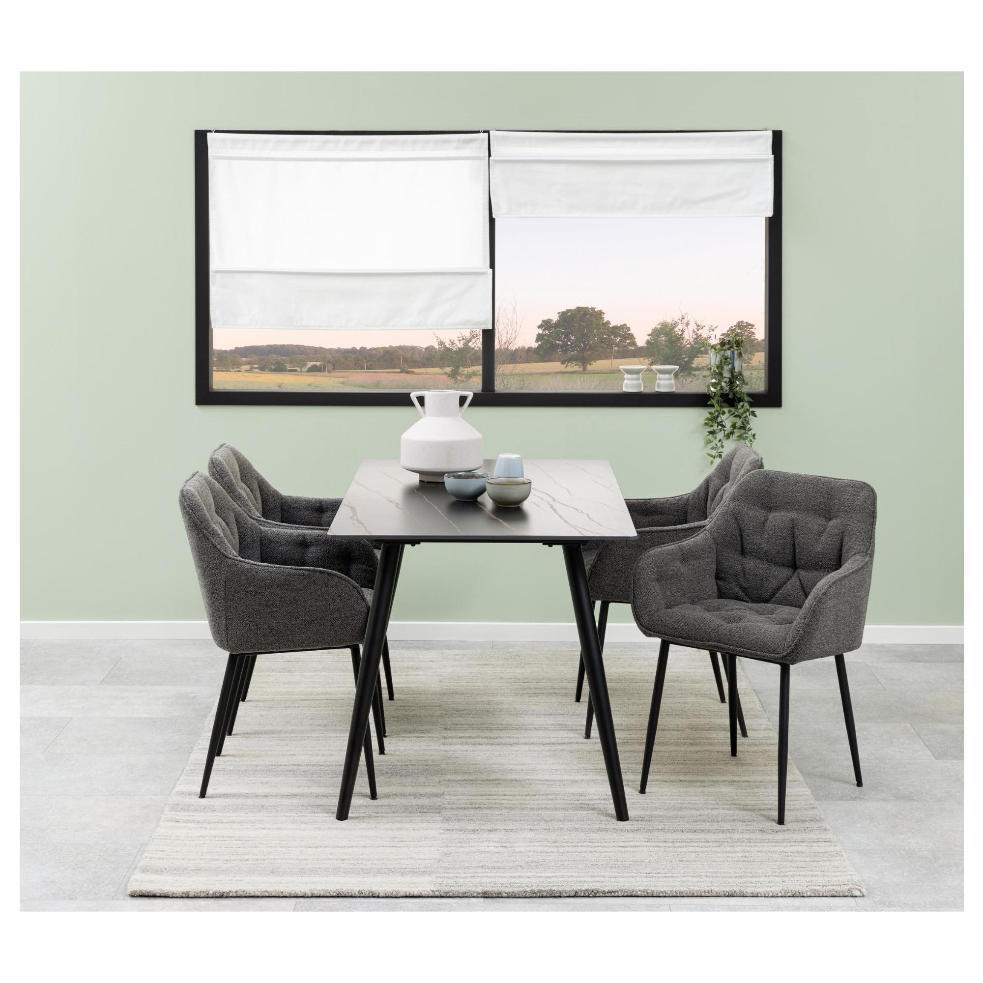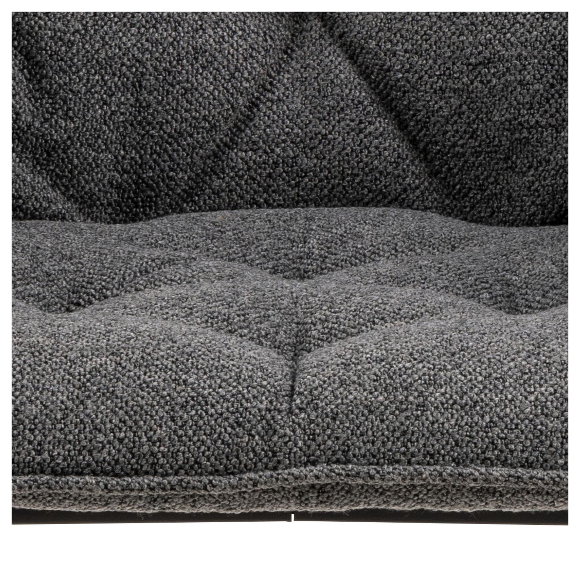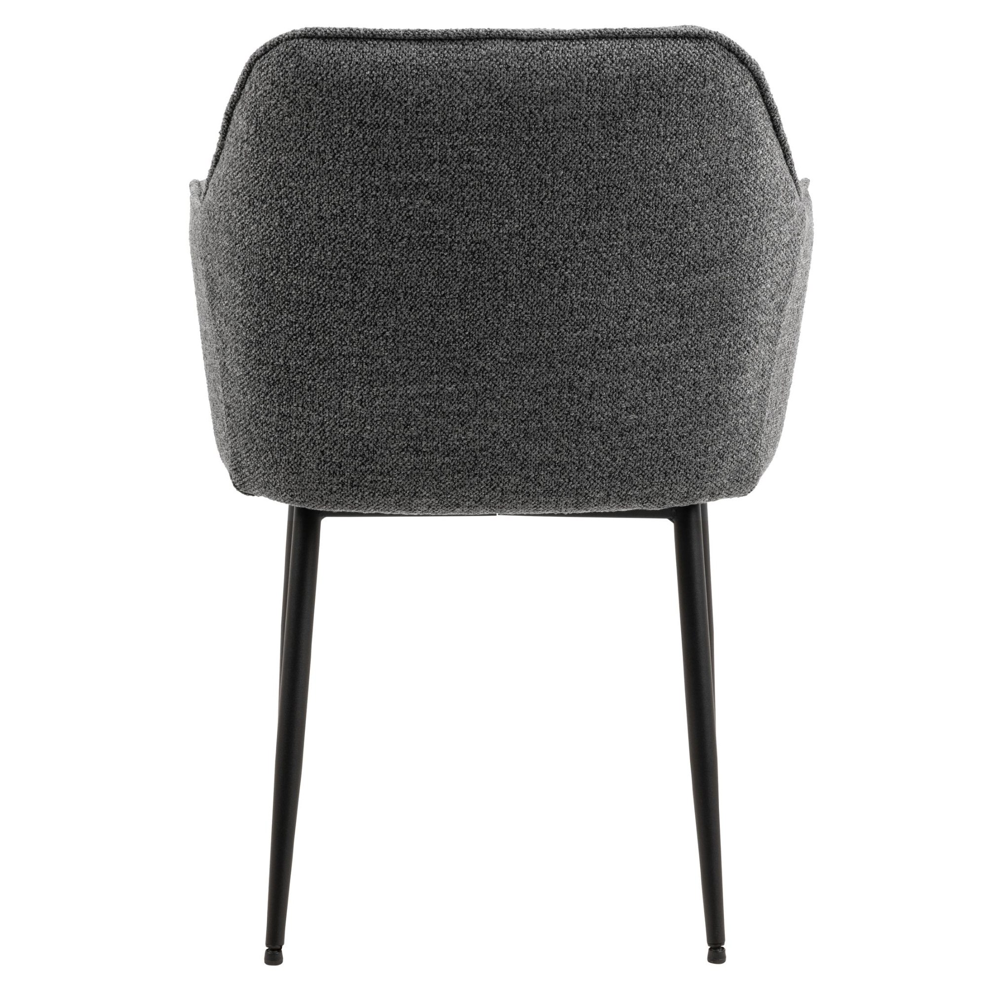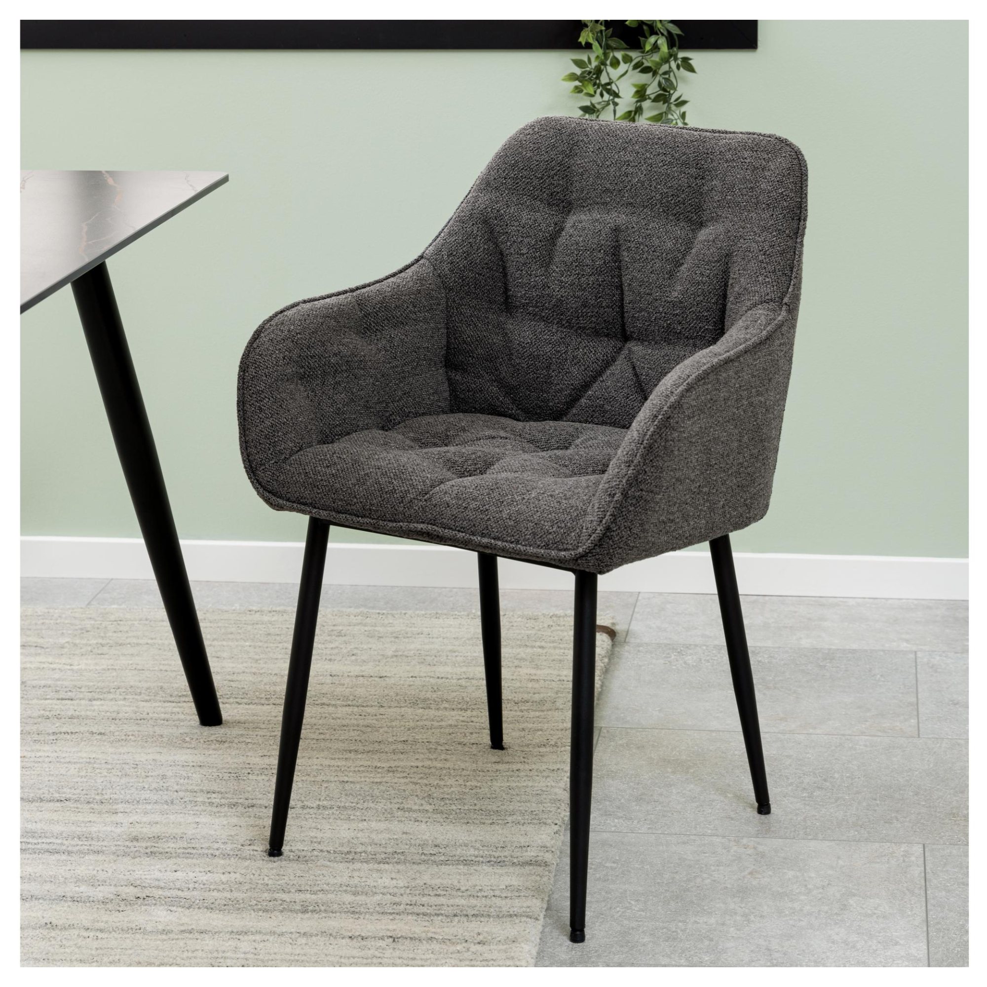 Komfort zaisťuje mäkká, penová výplň sedadla a chrbtovej opierky a na odloženie unavených rúk slúžia praktické podrúčky. Celá škrupina je čalúnená tkaninou v jednofarebnom vyhotovení s na dotyk príjemným povrchom. Minimalistický vzhľad stoličky ozvláštňujú dekoratívne detaily poťahu, ktoré vytvárajú nadýchaný dojem. Pevnosť a stabilitu stoličky zaisťuje štvornohá podnož z práškovo lakovaného kovu vyhotovená v čiernom mate.