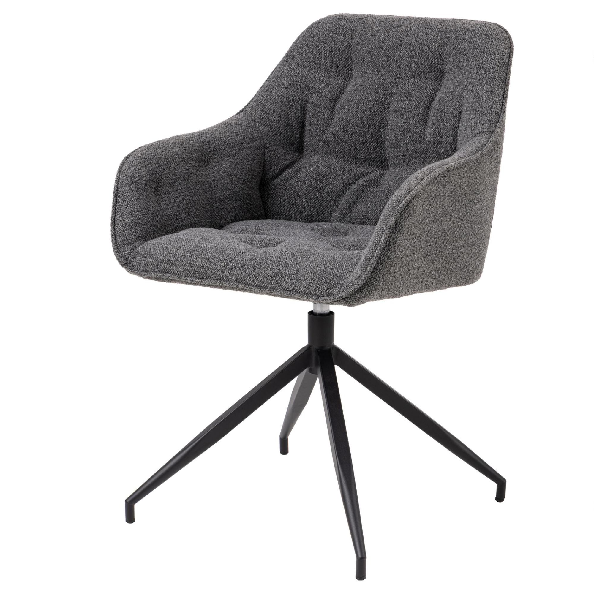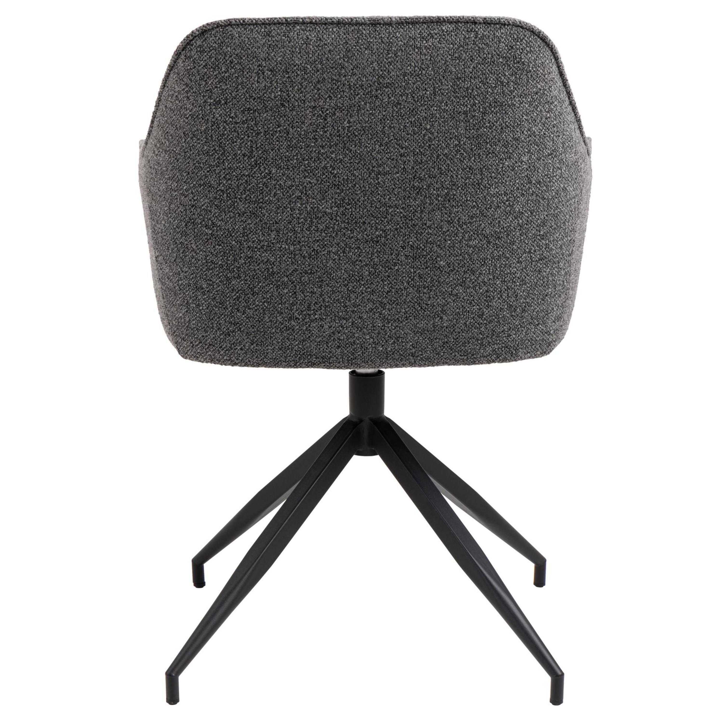 Komfortné sedadlo je spolu s chrbtovým operadlom a podrúčkami čalúnené látkou typu bouclé s príjemnou štruktúrou. Minimalistický vzhľad stoličky ozvláštňujú dekoratívne detaily poťahu, ktoré vytvárajú nadýchaný, sofistikovaný nádych. Pevnosť a stabilitu stoličky zaisťuje štvornohá podnož z práškovo lakovaného kovu vyhotovená v čiernom mate. Stolička poteší aj praktickou otočnou funkciou, ktorá uľahčí denné používanie.