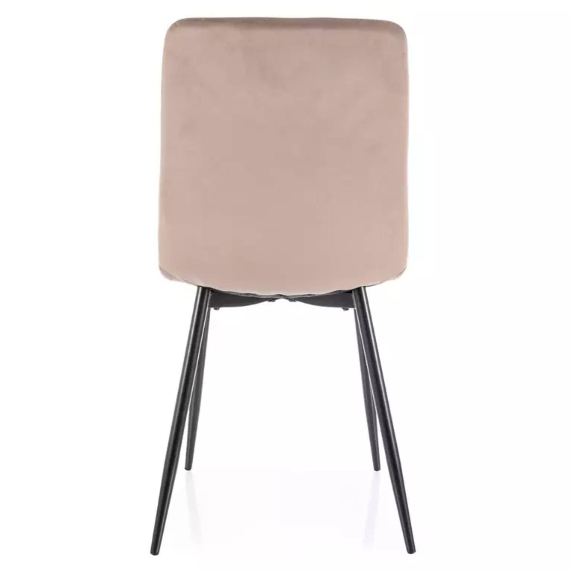 Stolička je čalúnená hladkou tkaninou zamatového typu, ktorá je príjemná na dotyk a ktorú zdobí štýlové prešívanie.
