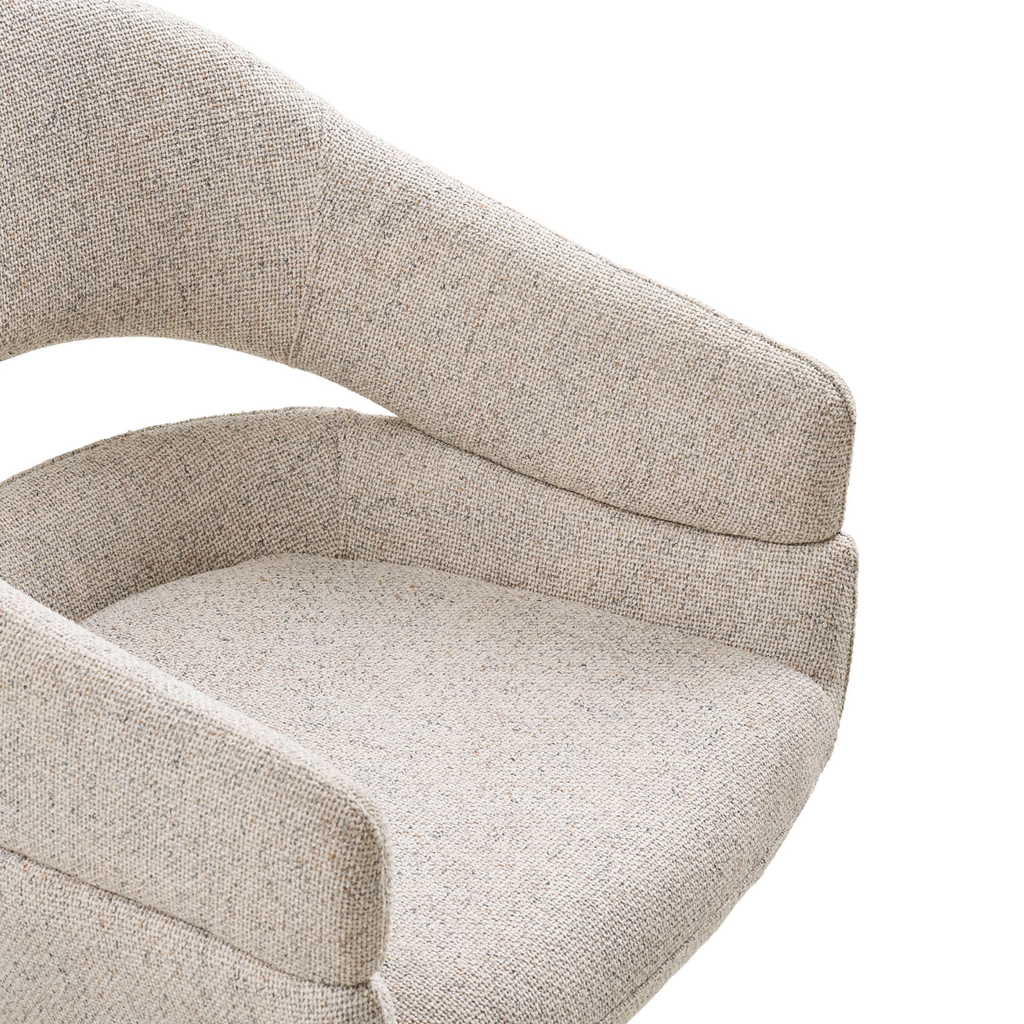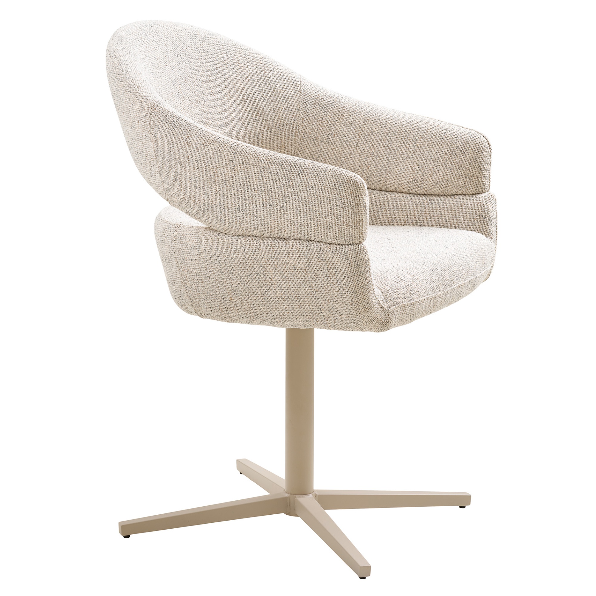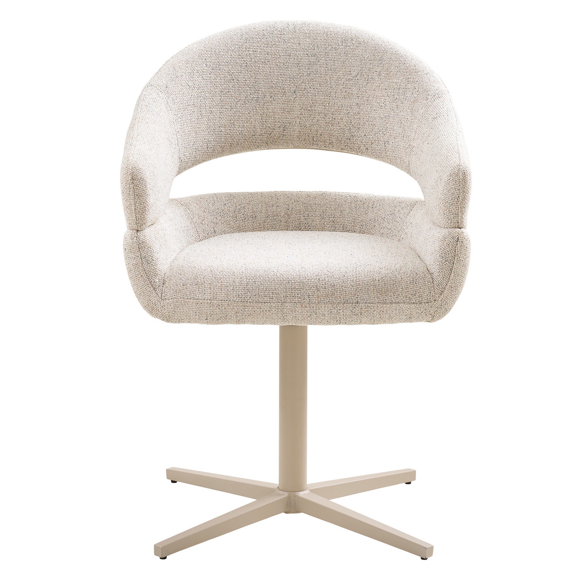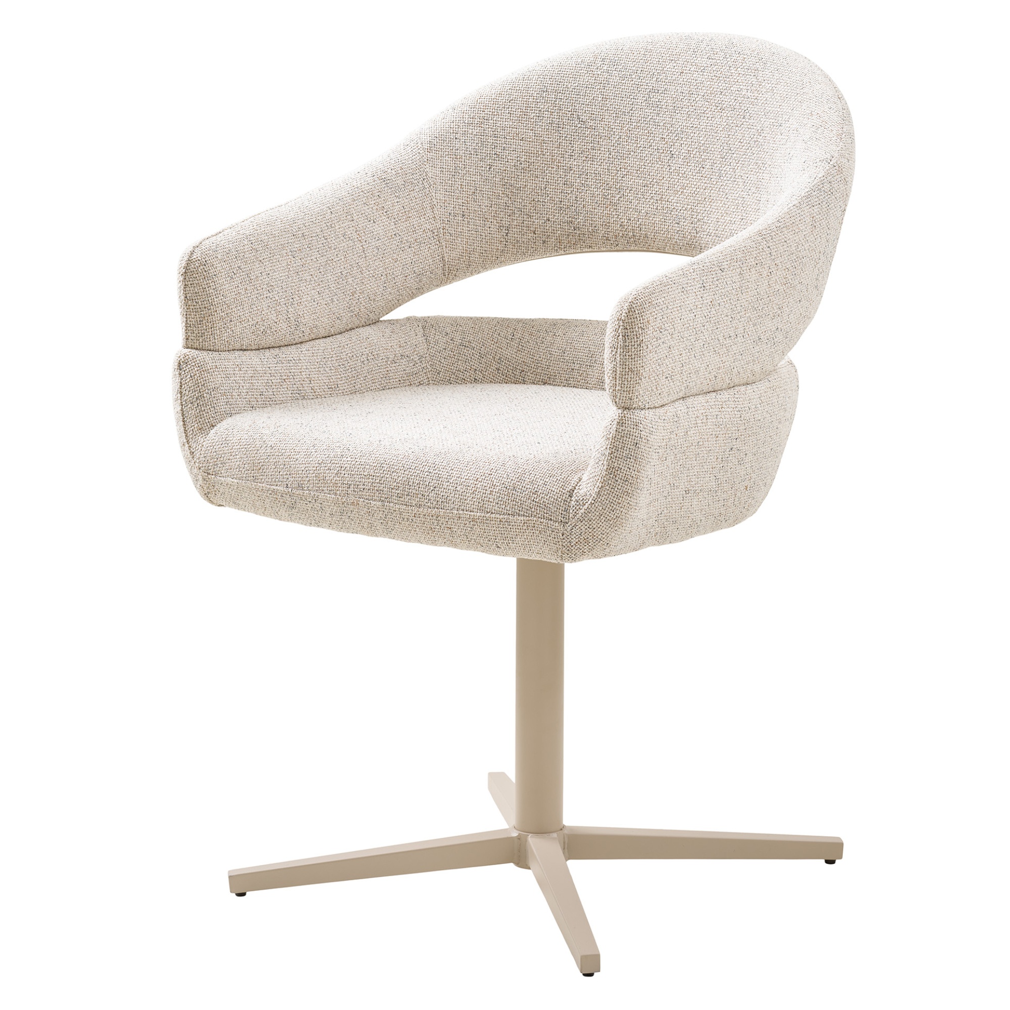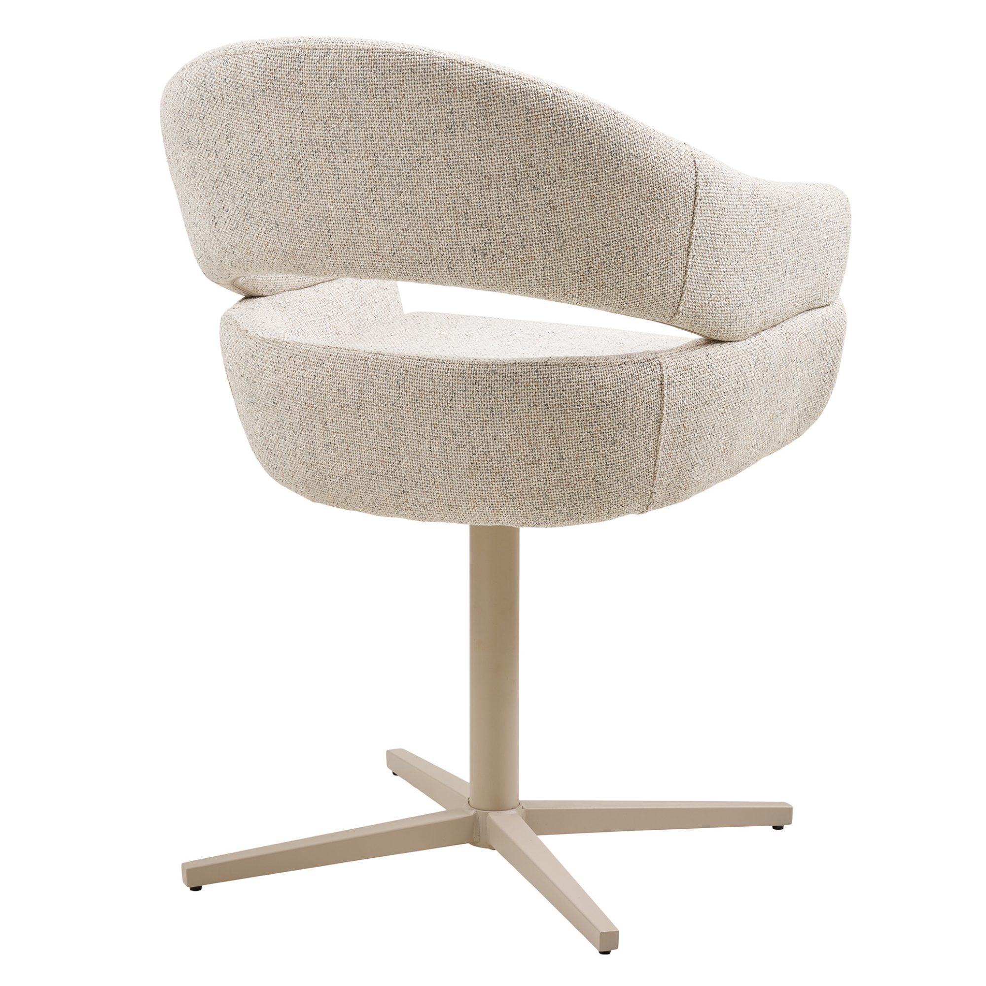 Stolička stojí na stabilnej kovovej nohe a je vybavená praktickou otočnou funkciou. Sedenie na nej je pohodlné nielen vďaka mäkkému penovému sedadlu potiahnutému hladkou tkaninou, ale prispievajú k tomu aj podrúčky.