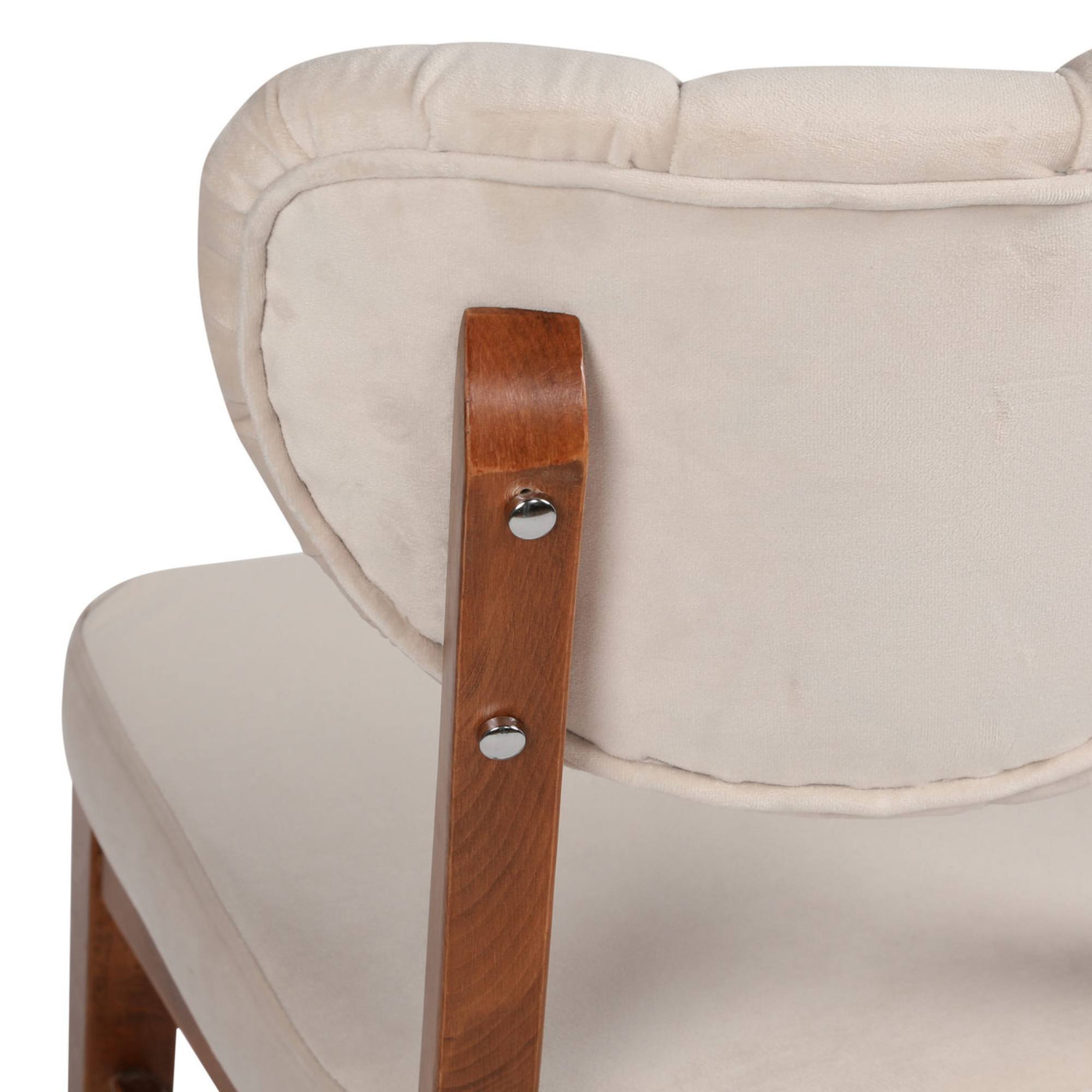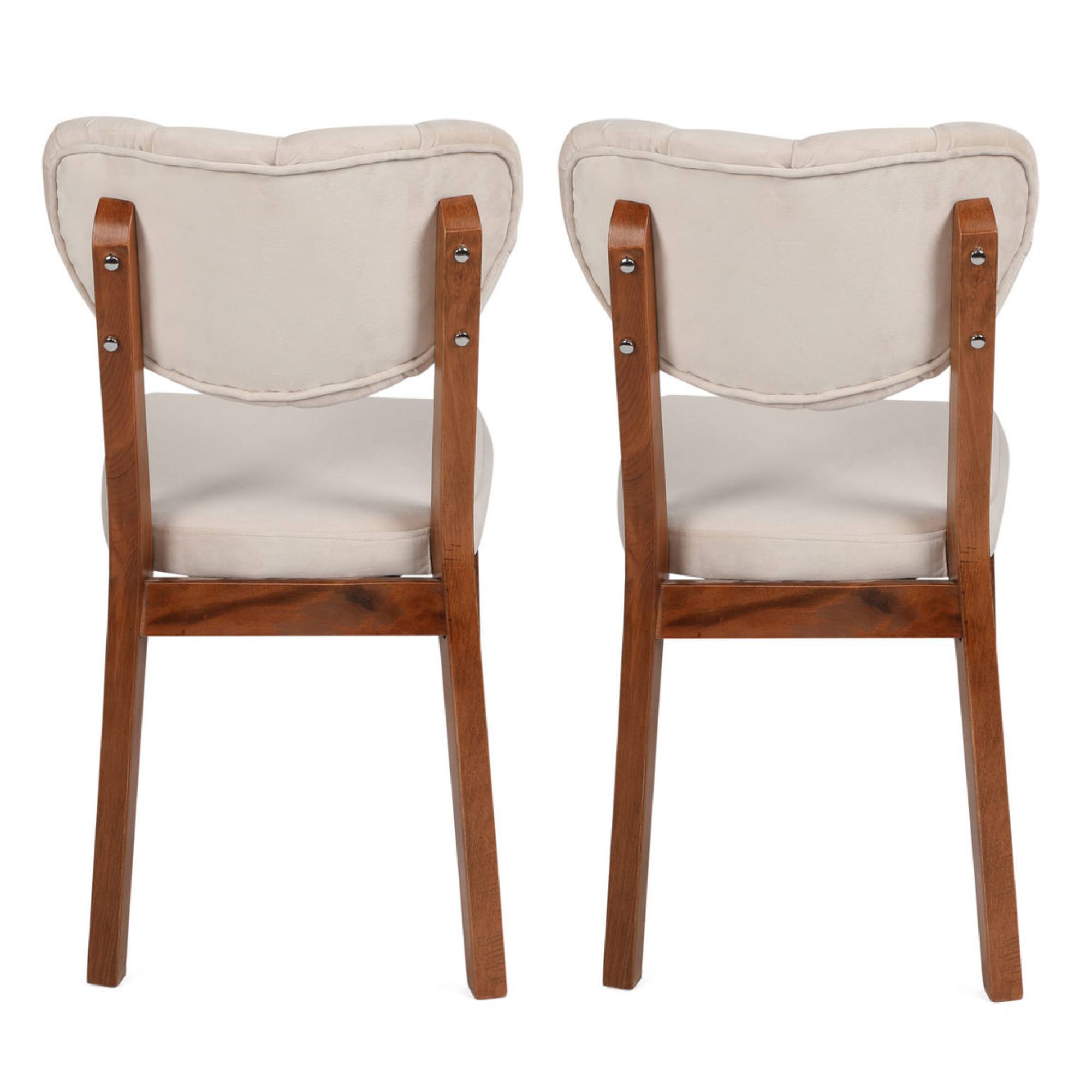Pevné a stabilné konštrukcie týchto stoličiek sú vyrobené z masívneho dreva. Aby sa na nich pohodlne sedelo, sú vybavené mäkkými penovými sedákmi potiahnutými hladkou tkaninou. Operadlá sú zdobené gombíkmi vo farbe tkaniny.