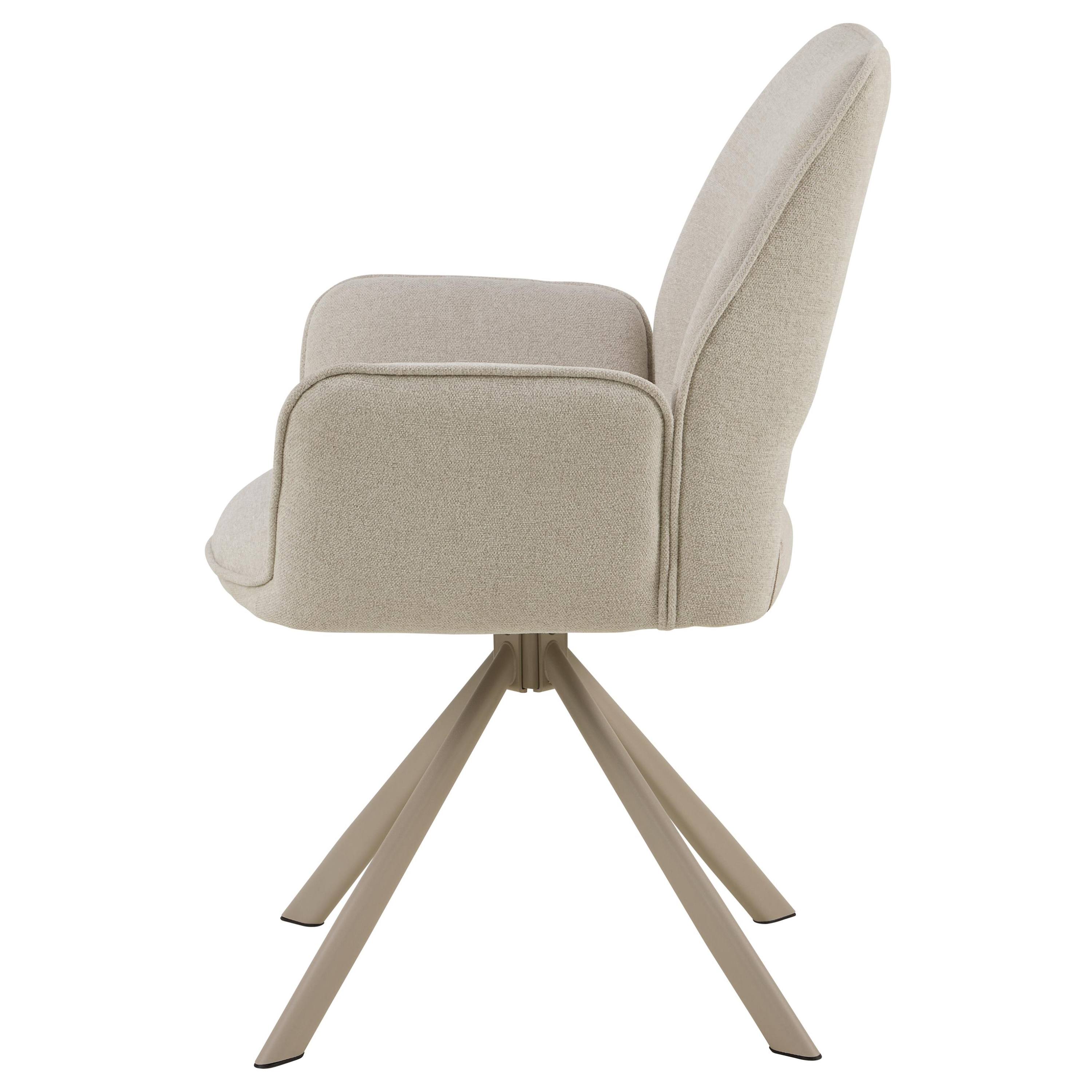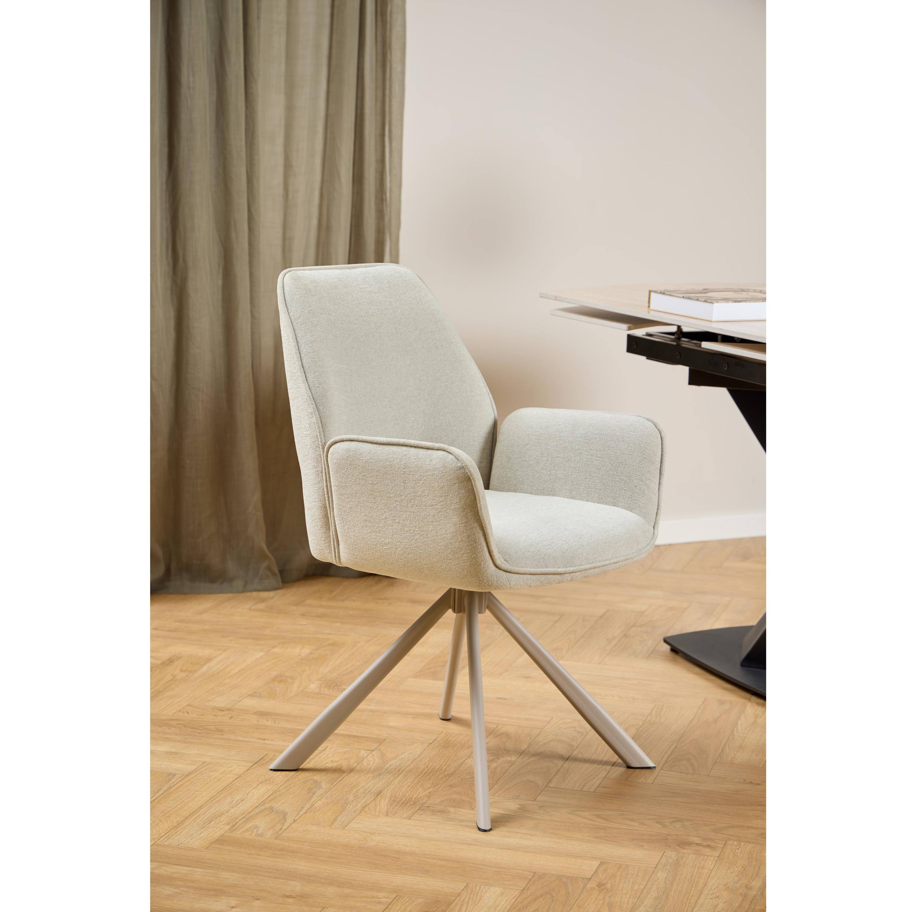 Komfort zaisťuje mäkká, penová výplň sedáka aj operadla. Na odloženie unavených rúk slúžia praktické podrúčky. Celá škrupina je čalúnená príjemnou tkaninou v jednofarebnom prevedení. Pevnosť a stabilitu stoličky zaručuje štvornohá kovová podnož s práškovo lakovaným povrchom. Stolička zaujme aj praktickou otočnou funkciou.