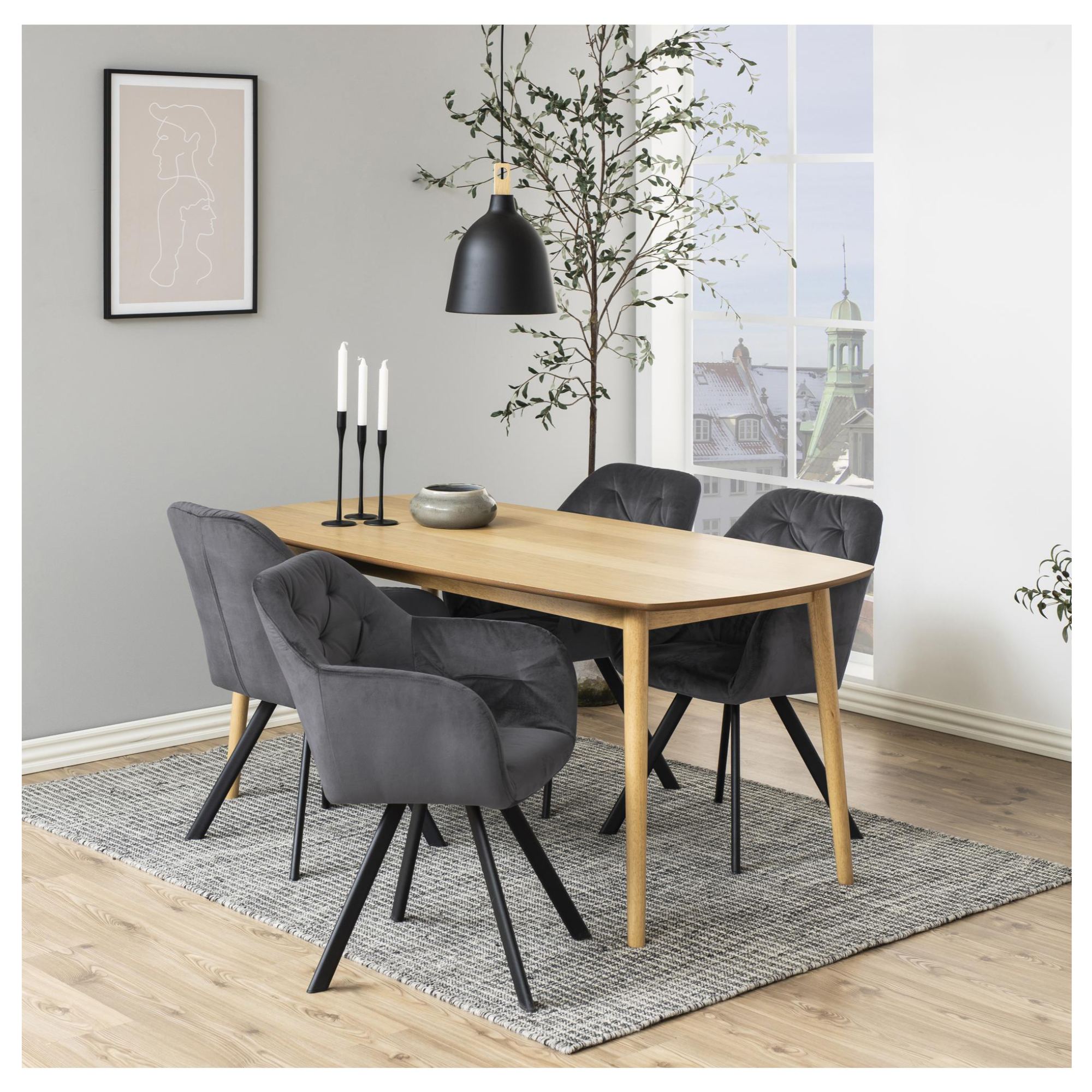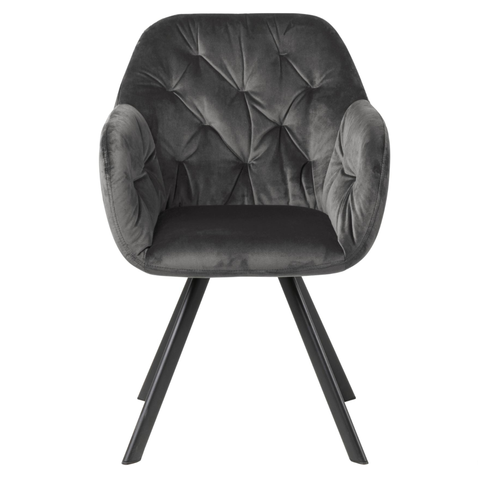Komfort zaisťuje mäkká, penová výplň sedadla aj chrbtovej opierky a na odloženie unavených rúk slúžia praktické podrúčky. Celá škrupina je čalúnená tkaninou zamatového vzhľadu s na dotyk veľmi príjemným povrchom. Minimalistický vzhľad stoličky ozvláštňujú dekoratívne detaily poťahu, ktoré vytvárajú sofistikovanejší vzhľad. Pevnosť a stabilitu stoličky zaisťuje štvornohá podnož z práškovo lakovaného kovu vyhotovená v čiernom mate. Vďaka špeciálnemu mechanizmu je možné stoličku otáčať až o 180° s funkciou automatického návratu do pôvodnej polohy.