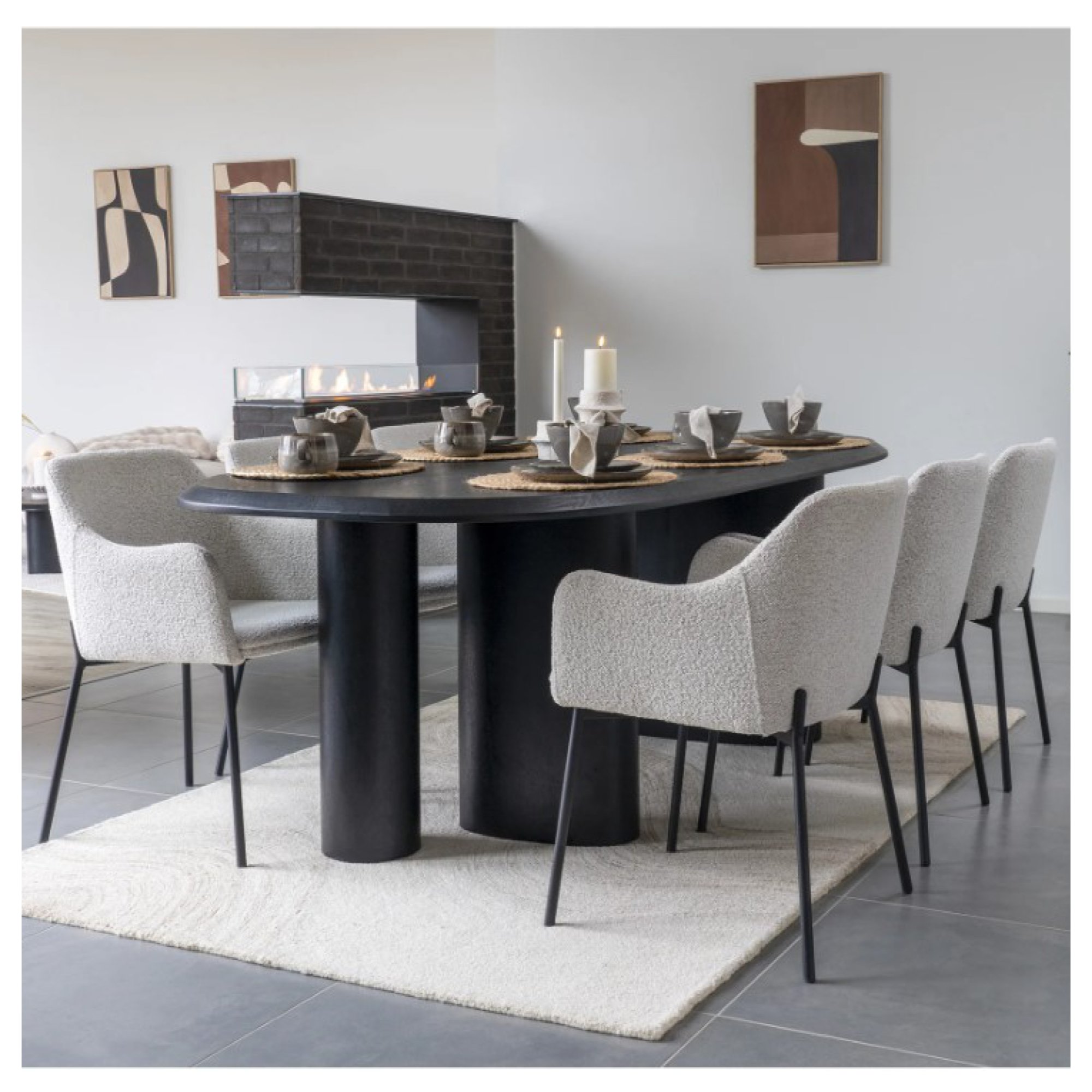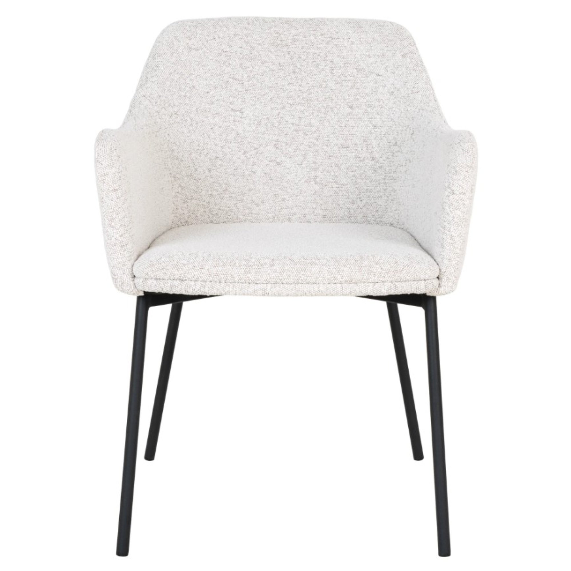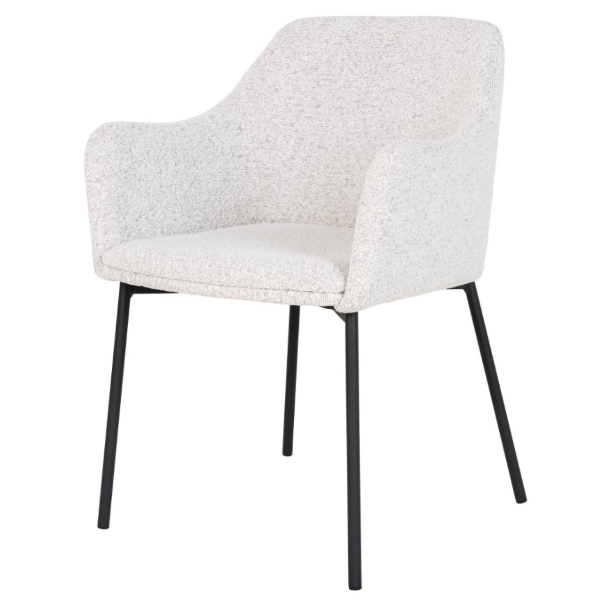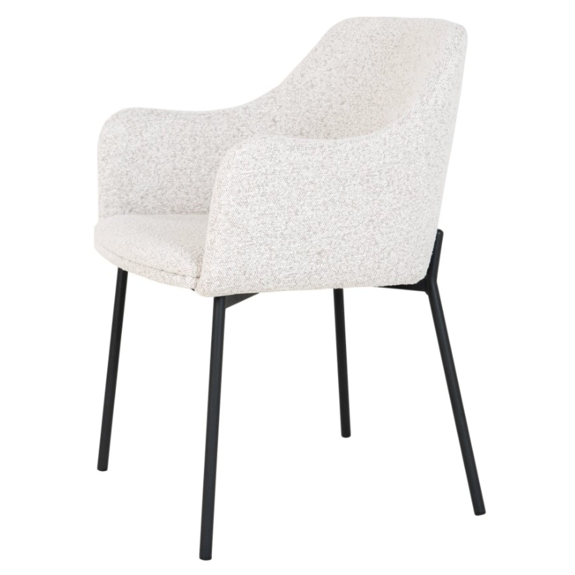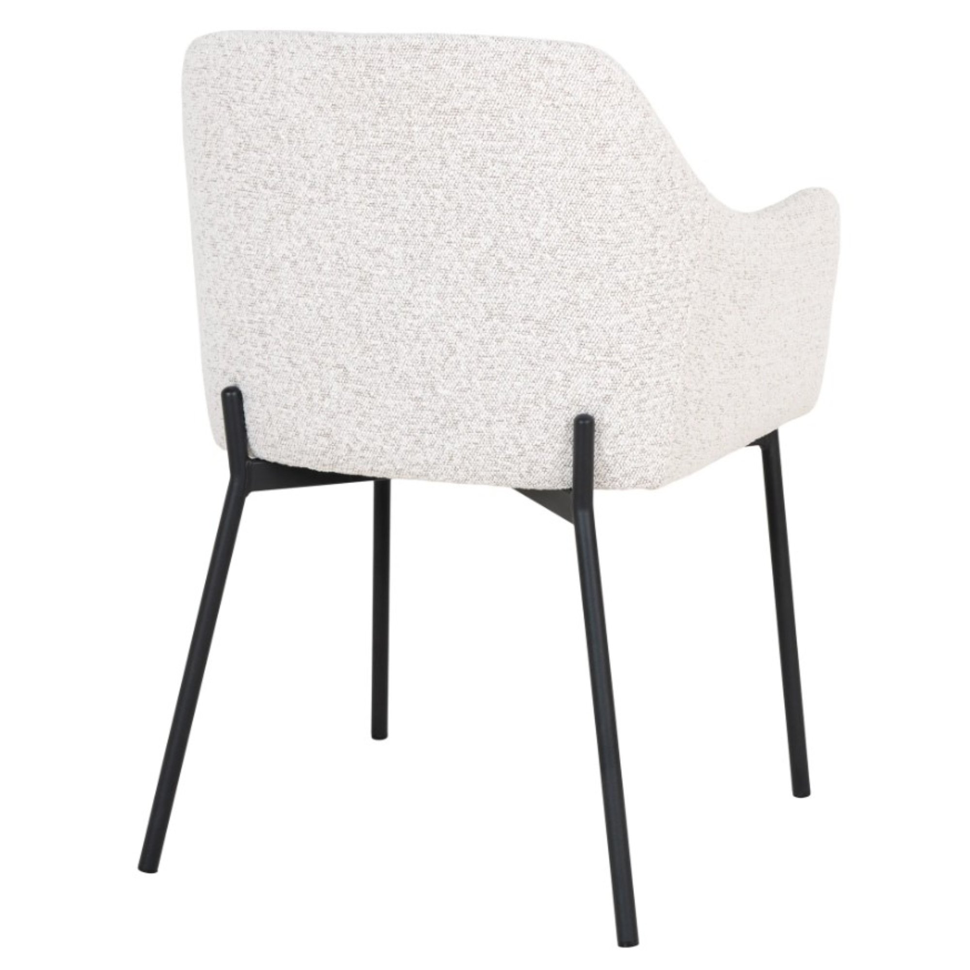 Stabilitu celej konštrukcie zaisťuje štvorica nôh z čierneho matného kovu. Pohodlie obstará škrupina s podrúčkami na unavené ruky, ktorá je čalúnená príjemnou tkaninou typu bouclé v klasickom vyhotovení.