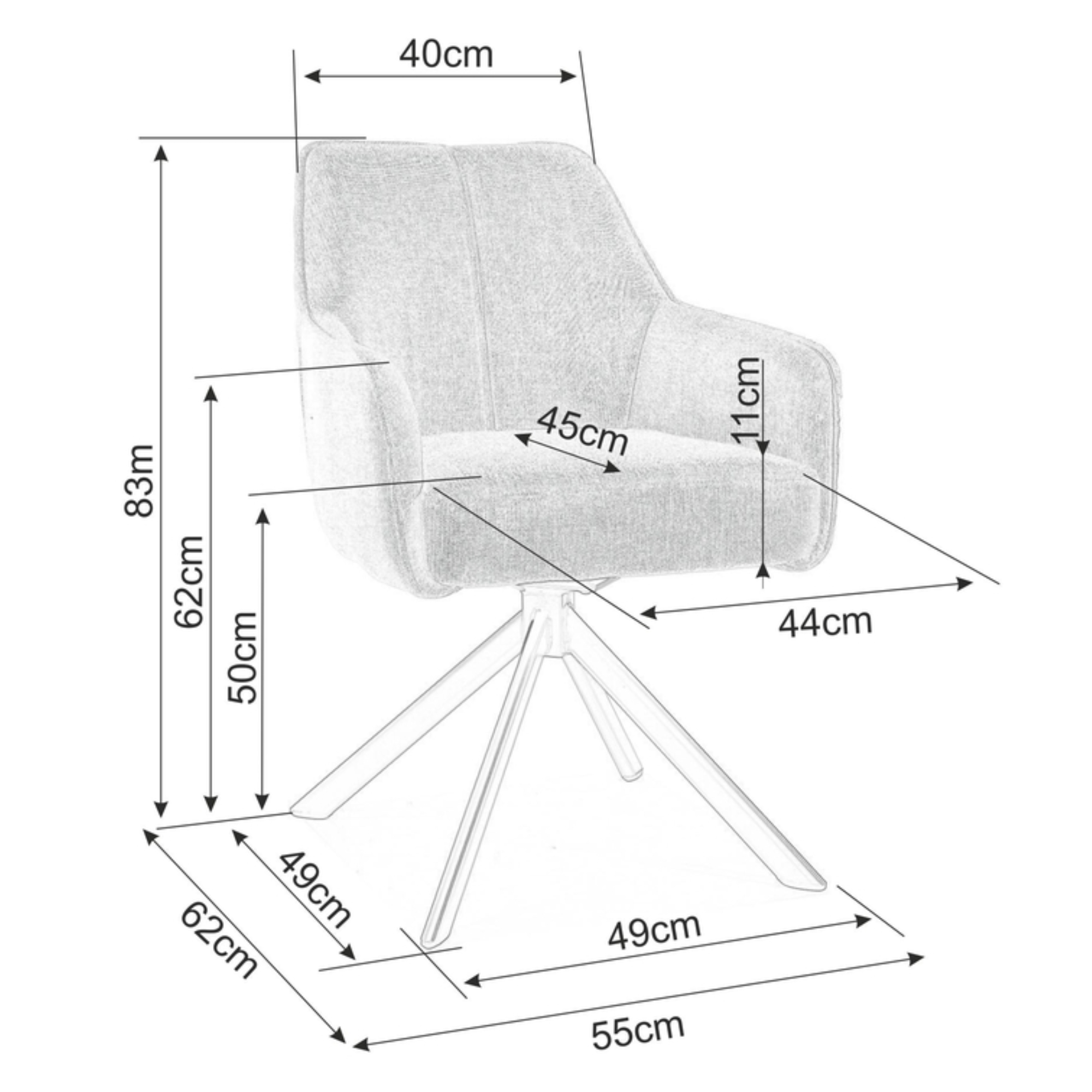 Komfortné sedenie zaisťuje sedadlo s jadrom z taštičkových pružín a opretie spríjemňuje mäkká penová vrstva v chrbtovom operadle. Na odloženie unavených rúk slúžia praktické podrúčky. Celá škrupina je čalúnená príjemnou tkaninou zo 100% polyesteru. Atraktívny vzhľad stoličky zvýrazňuje decentné prešívanie poťahu. Konštrukciu podopiera štvornohá podnož z matného kovu. Stolička zaručene poteší aj svojim otočným mechanizmom o 180 ° so samovoľným návratom do pôvodnej pozície.